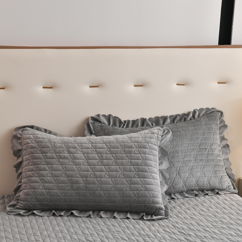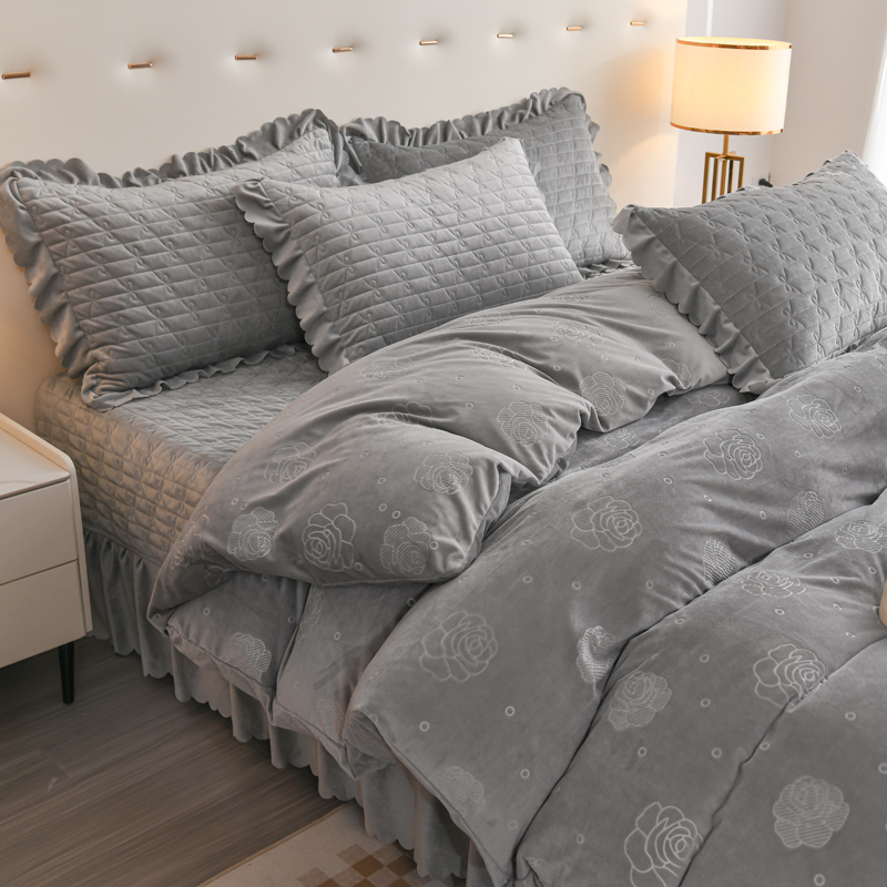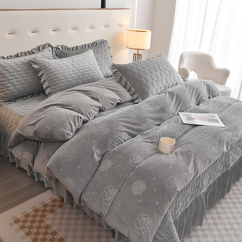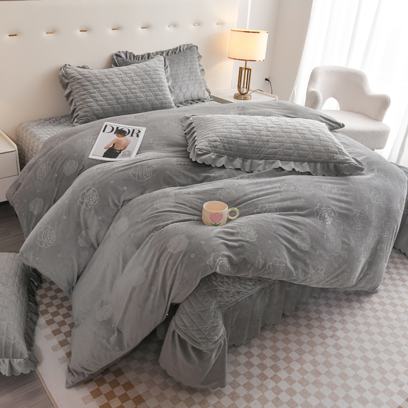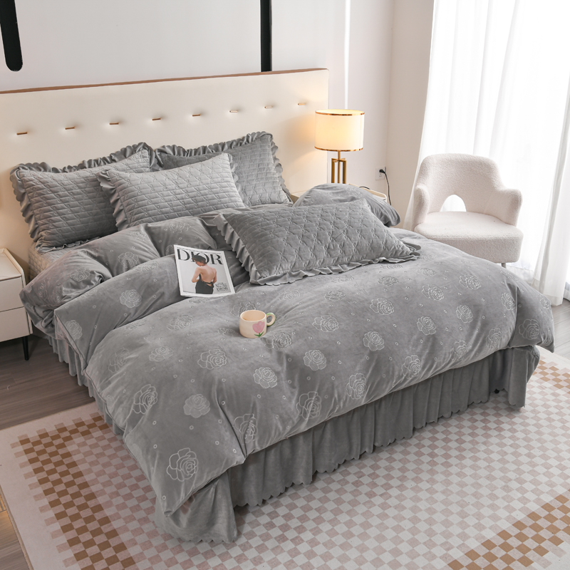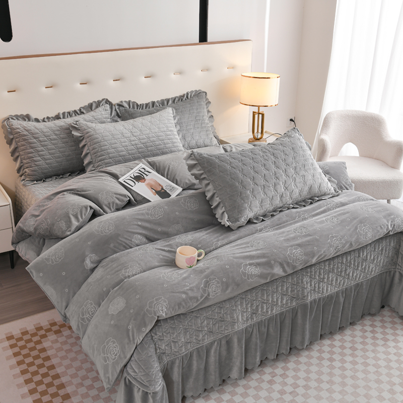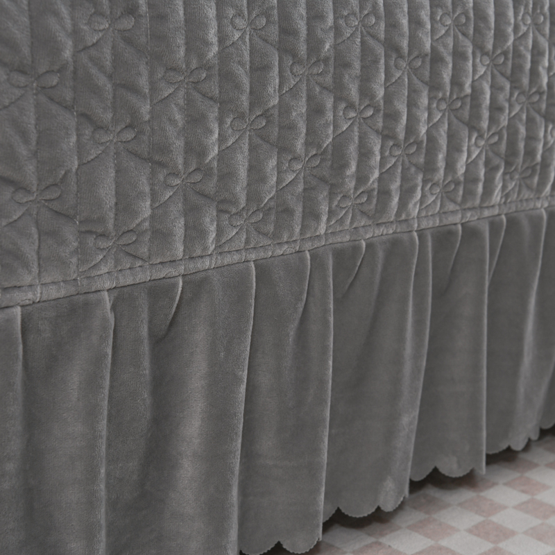 商品名称:雅眠居 直播爆款纯色宝宝绒床盖款四件套花边夹棉床裙款三件套 宝宝绒-烟灰
