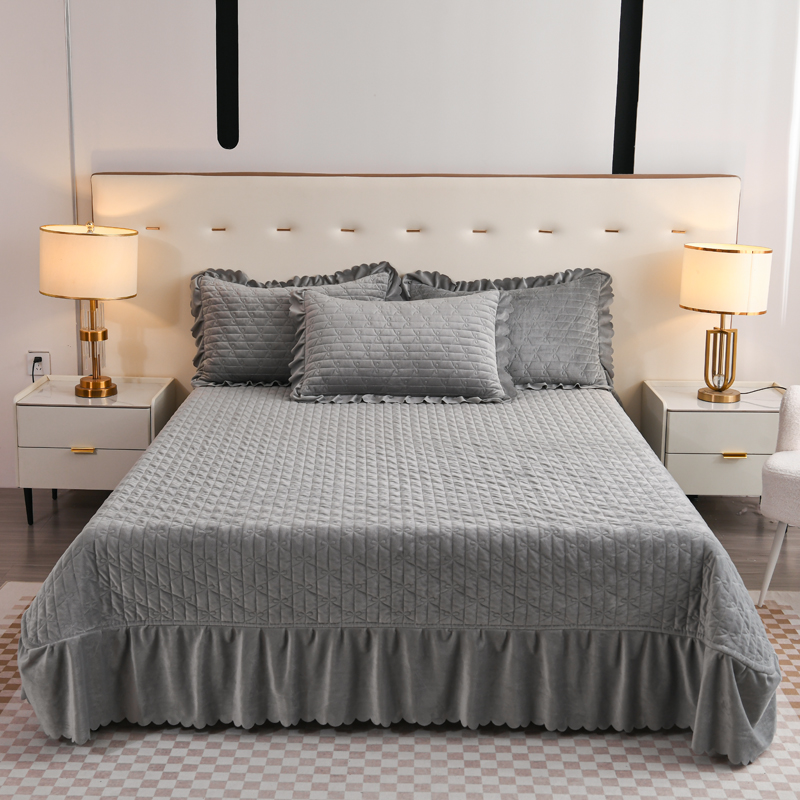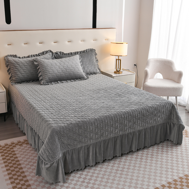 雅眠居 直播爆款纯色宝宝绒床盖款四件套花边夹棉床裙款三件套 宝宝绒-烟灰
