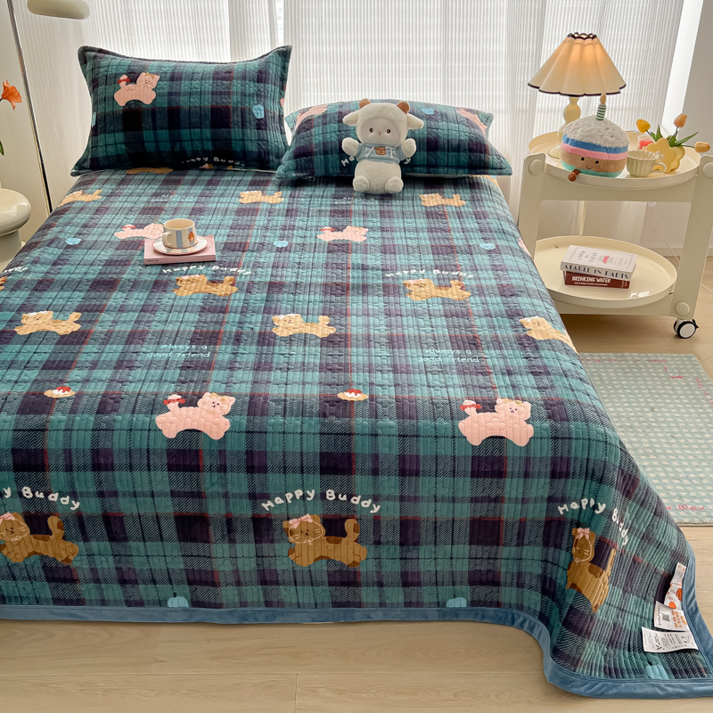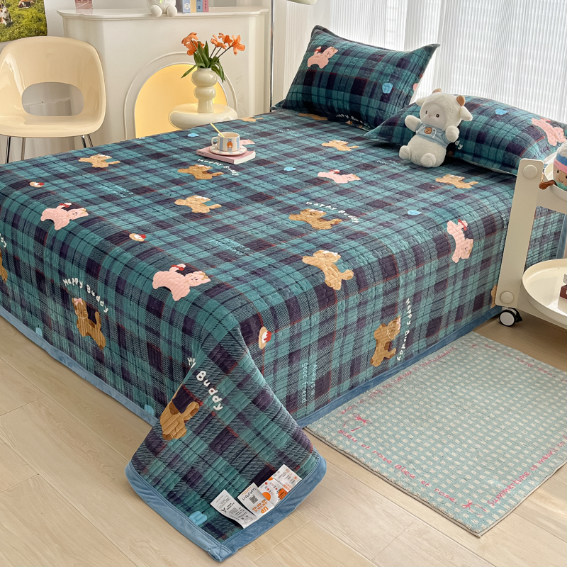 商品名称:慕晨 2024新款高克重牛奶绒印花豆豆绒夹棉单品床盖 格子猫猫