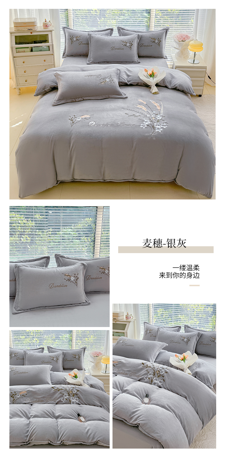 商品名称:金米诺 2024新款绣花牛奶绒四件套 麦穗-银灰