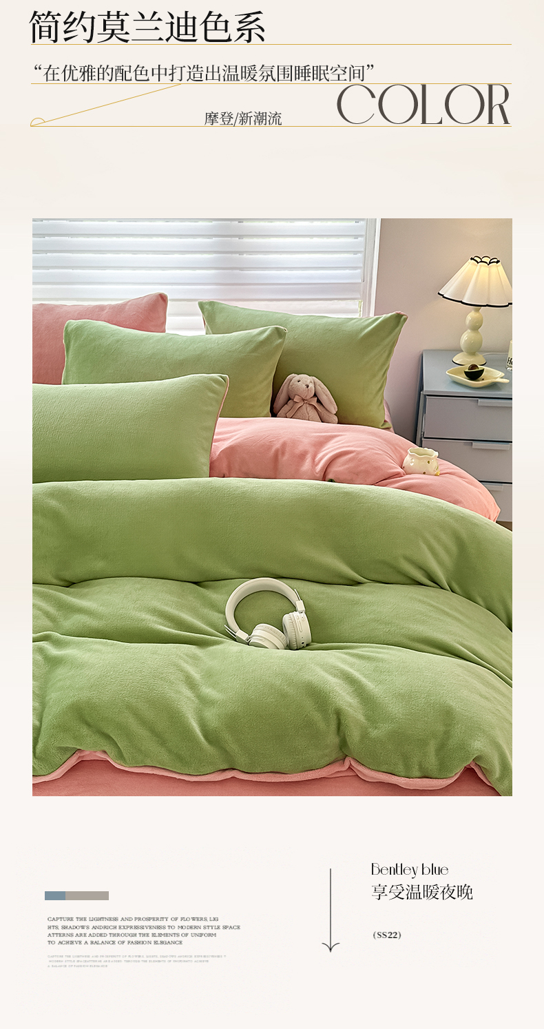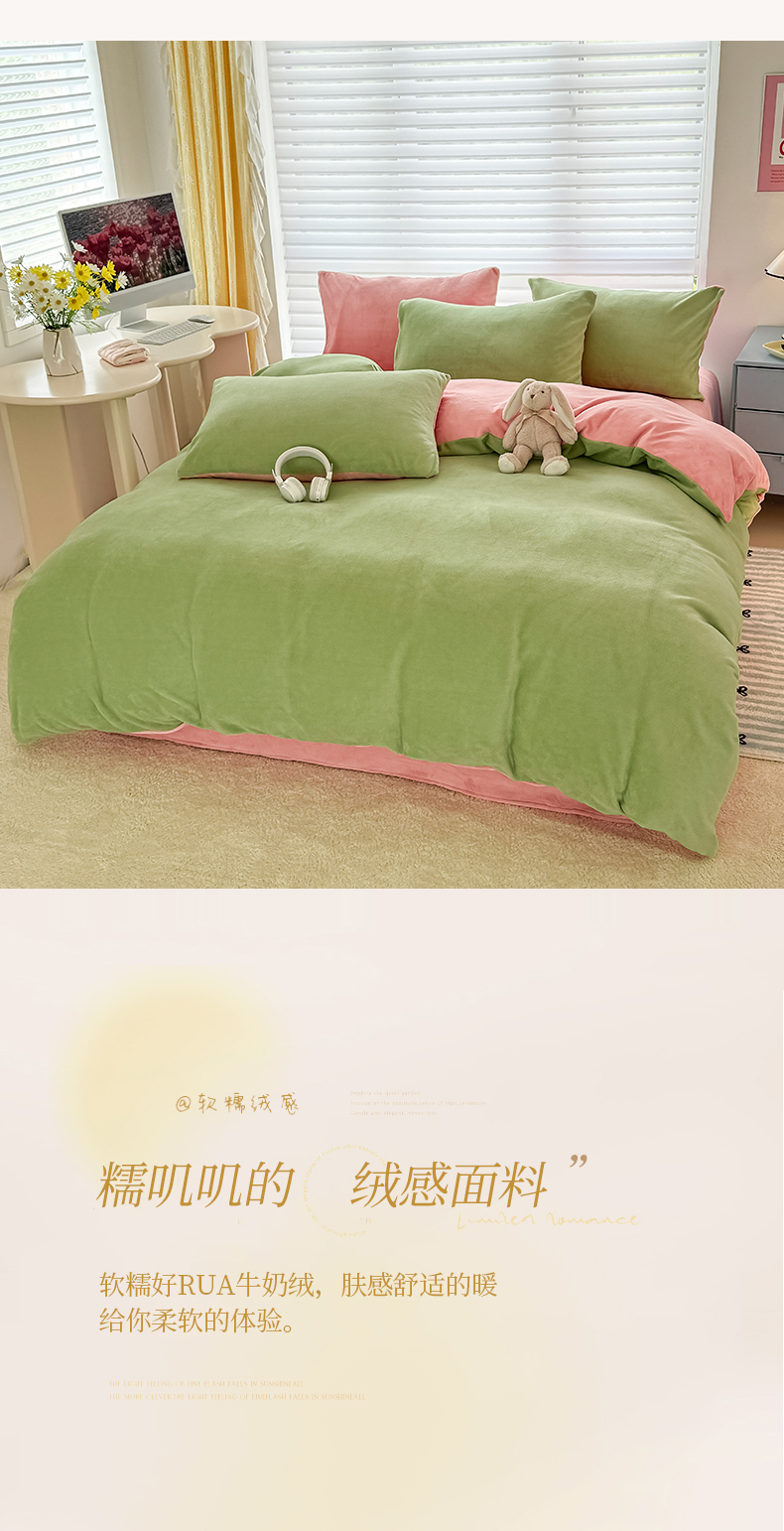 商品名称:觅妮家纺 2025新款全消光200g简约高克重秋冬加厚双拼牛奶绒单被套 果绿粉