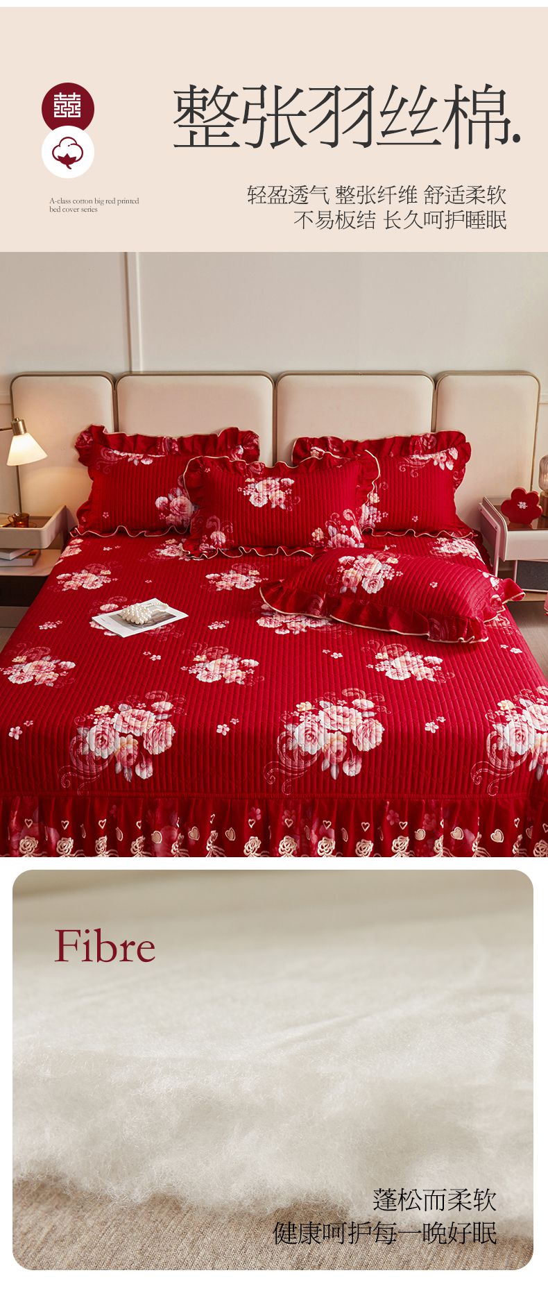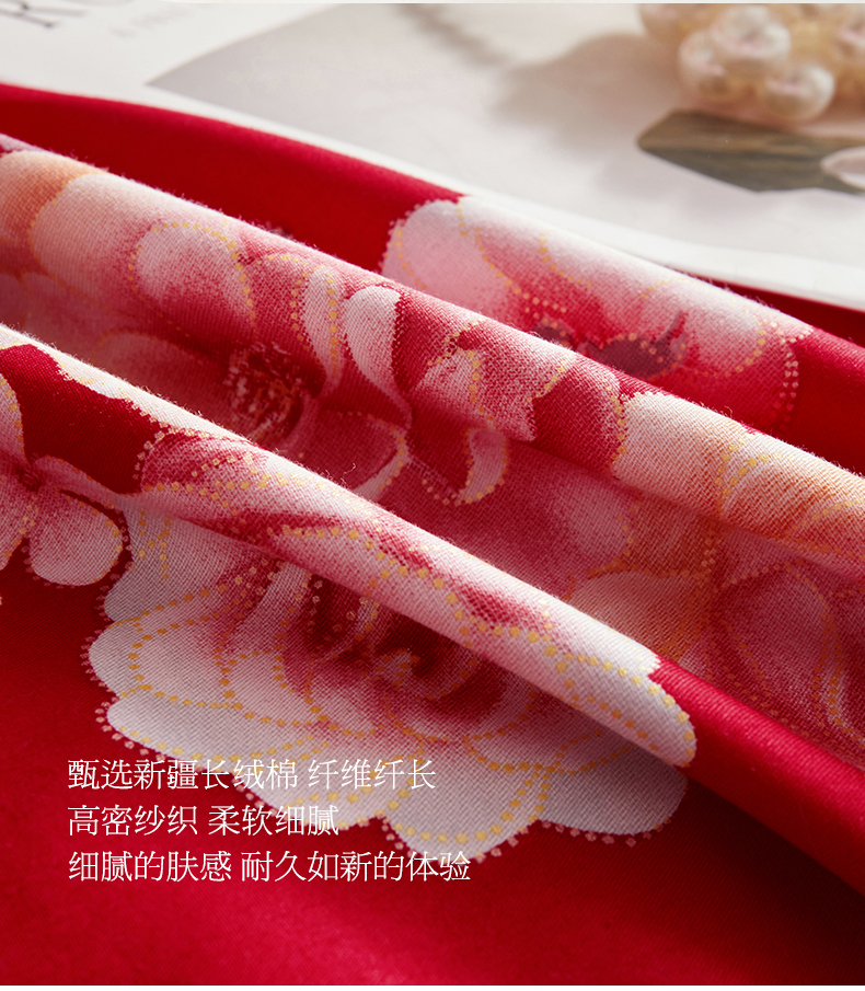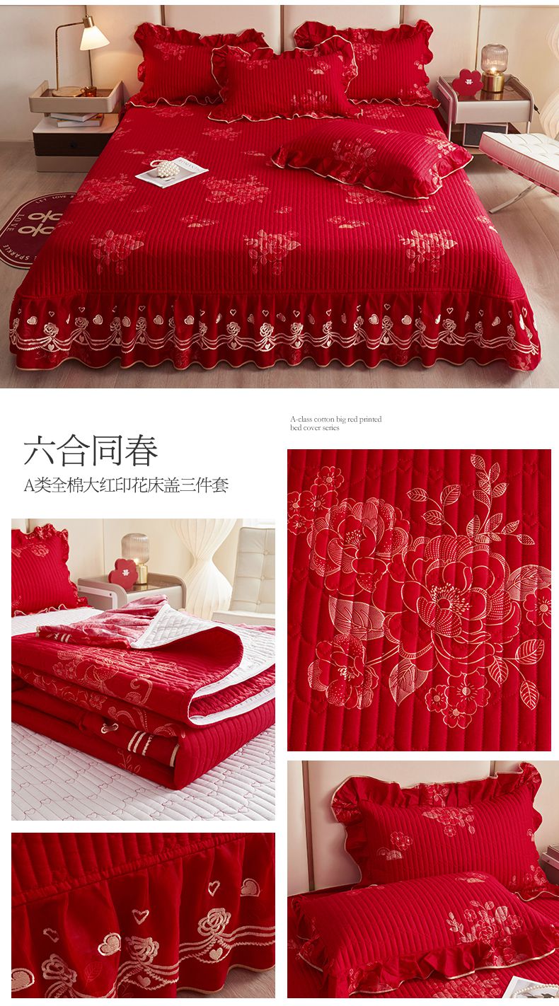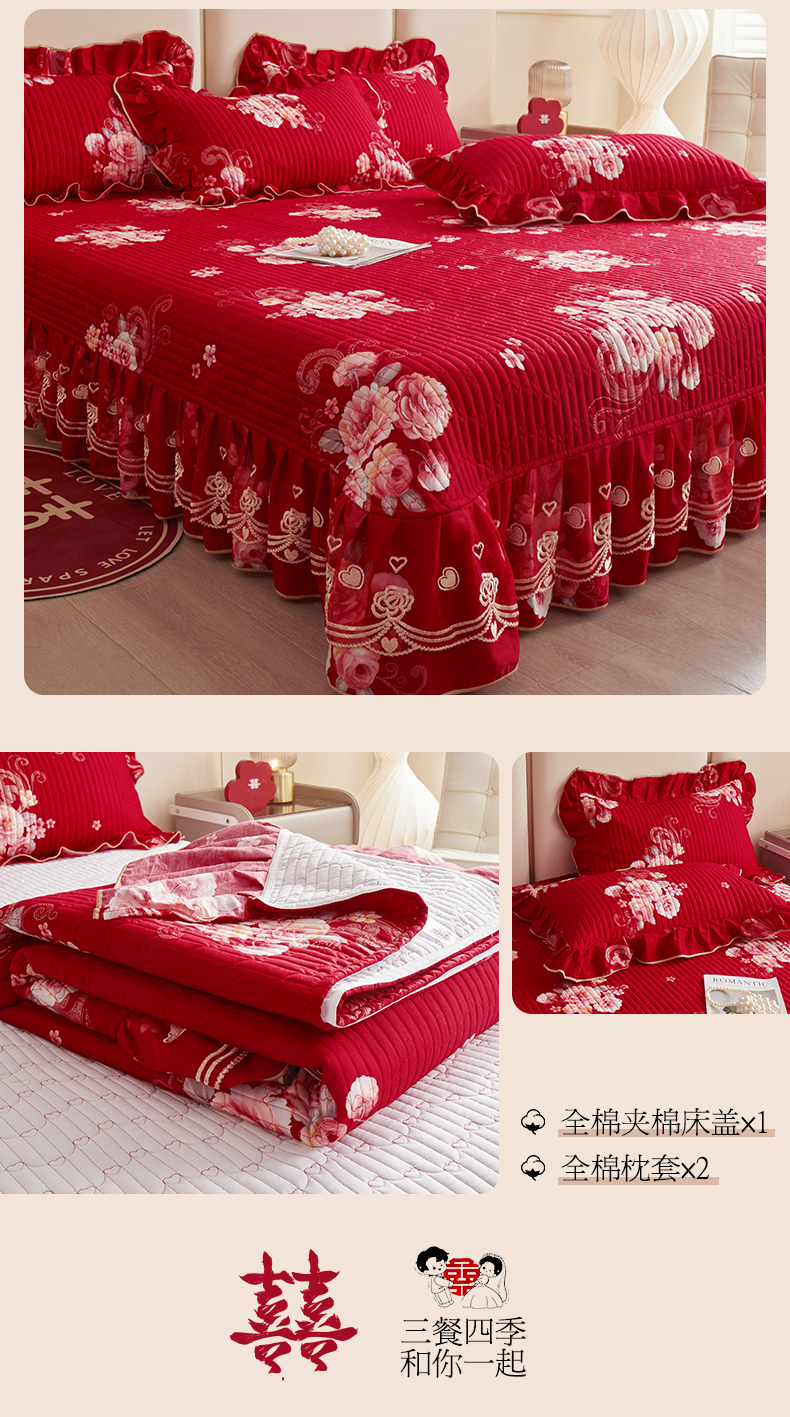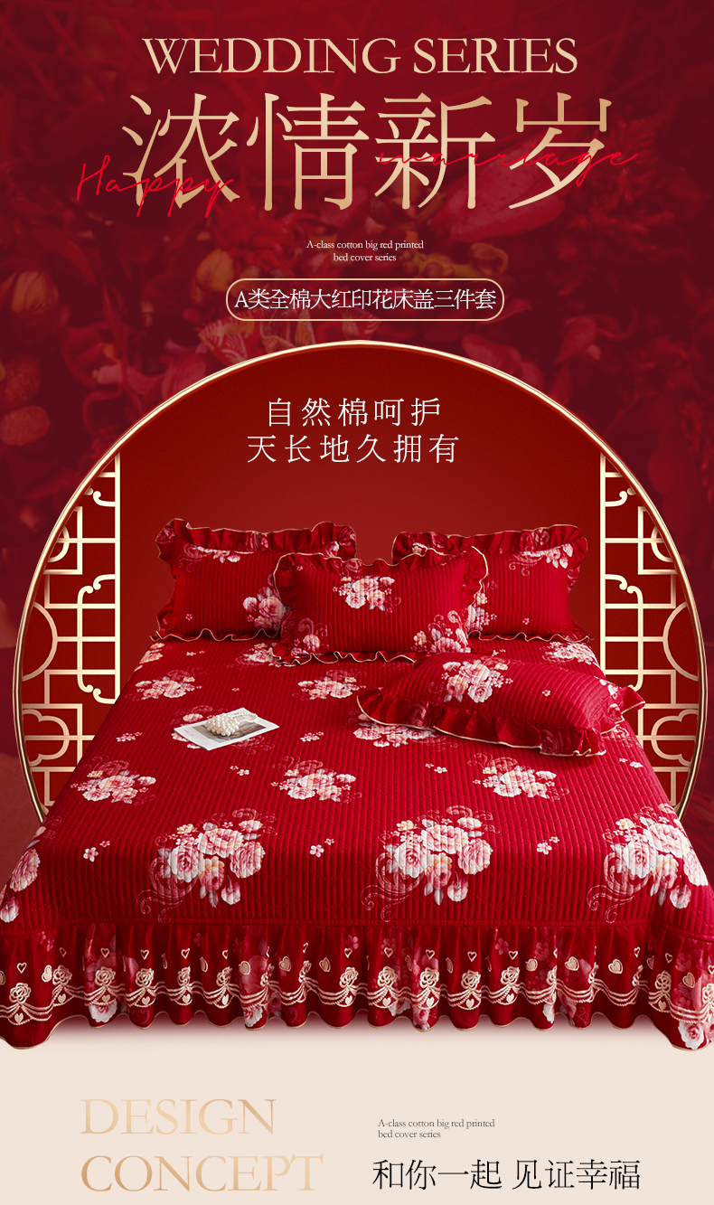 当前位置: 91家纺网 > 商品网购 > 床品套件 > 四件套 > 婚庆四件套 > 宜凡家纺 2024新款A类全棉大红印花床盖三件套 花开福满