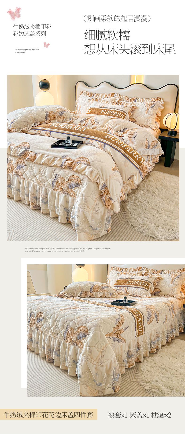 宜凡家纺 2024新款牛奶绒印花夹棉花边床盖四件套 欧曼情调