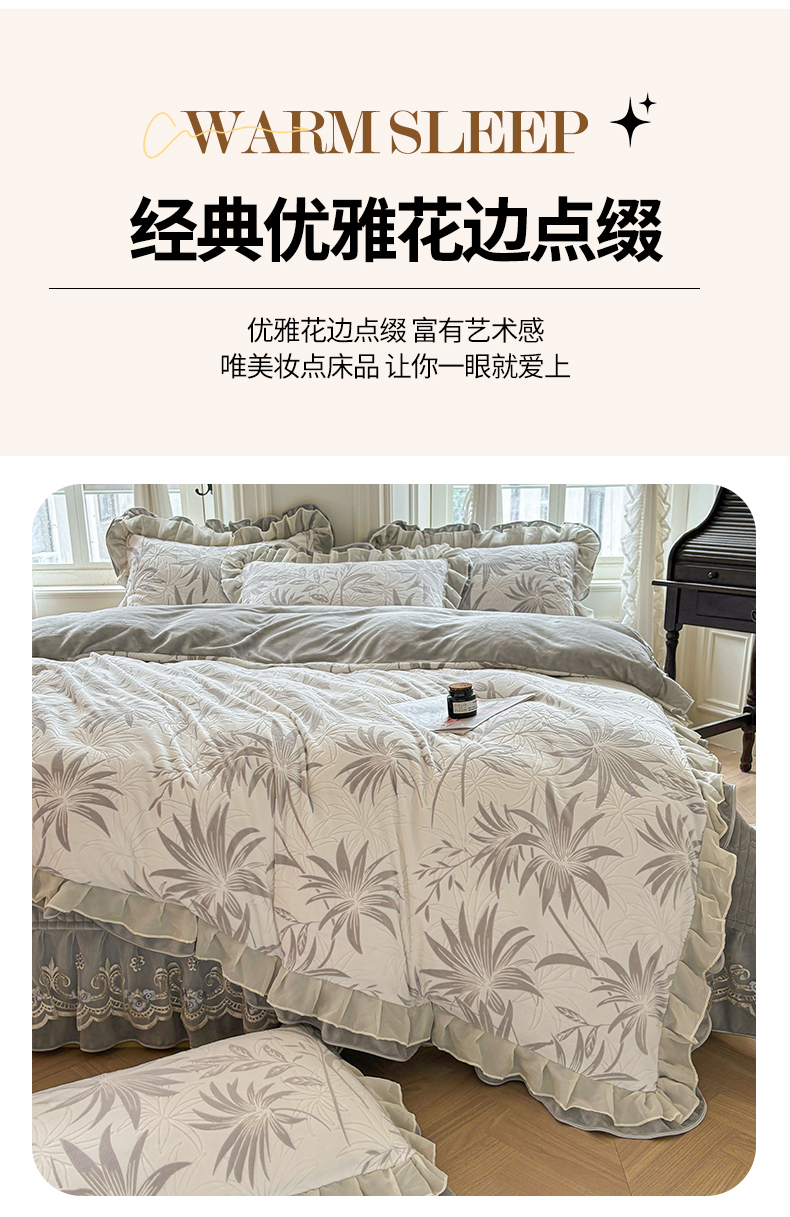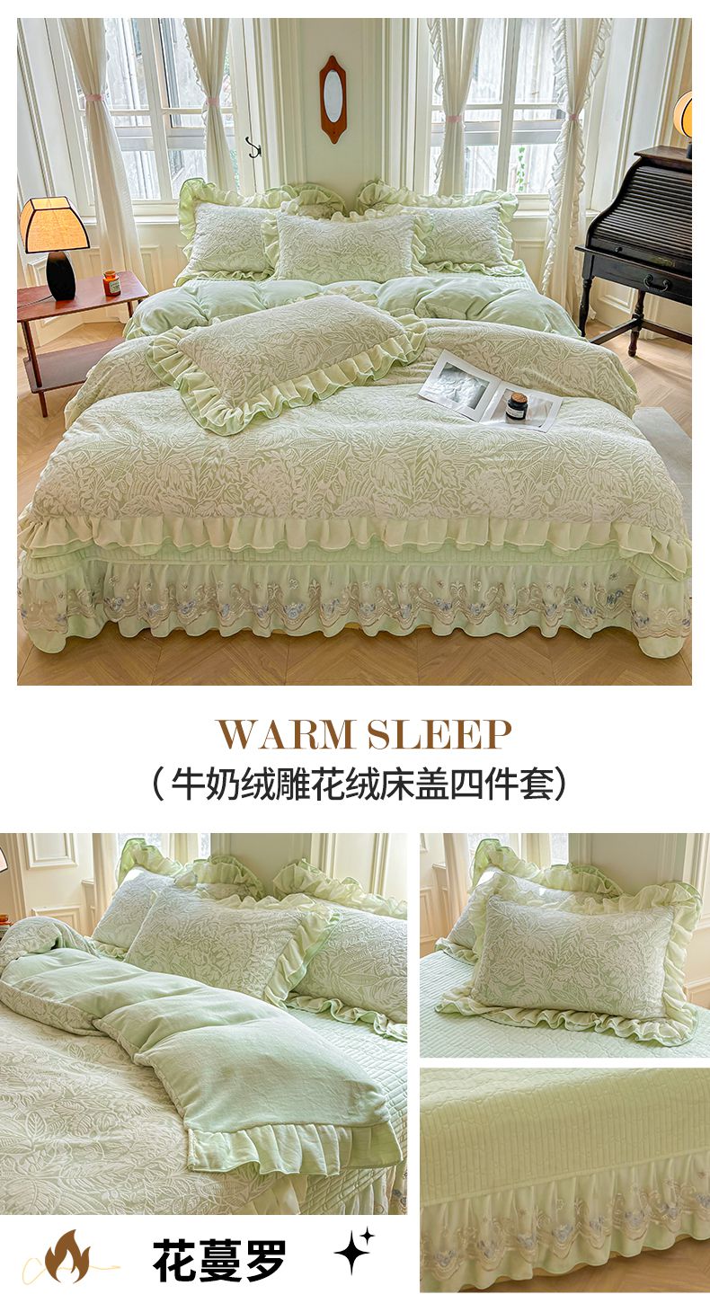 (总)宜凡家纺 2025新款牛奶绒雕花拼接刺绣床裙四件套,晨雾蔷薇,蝶恋花语,花野漫屿,蕾丝蝶音,洛可可影,雾蓝漫织,香槟漫月