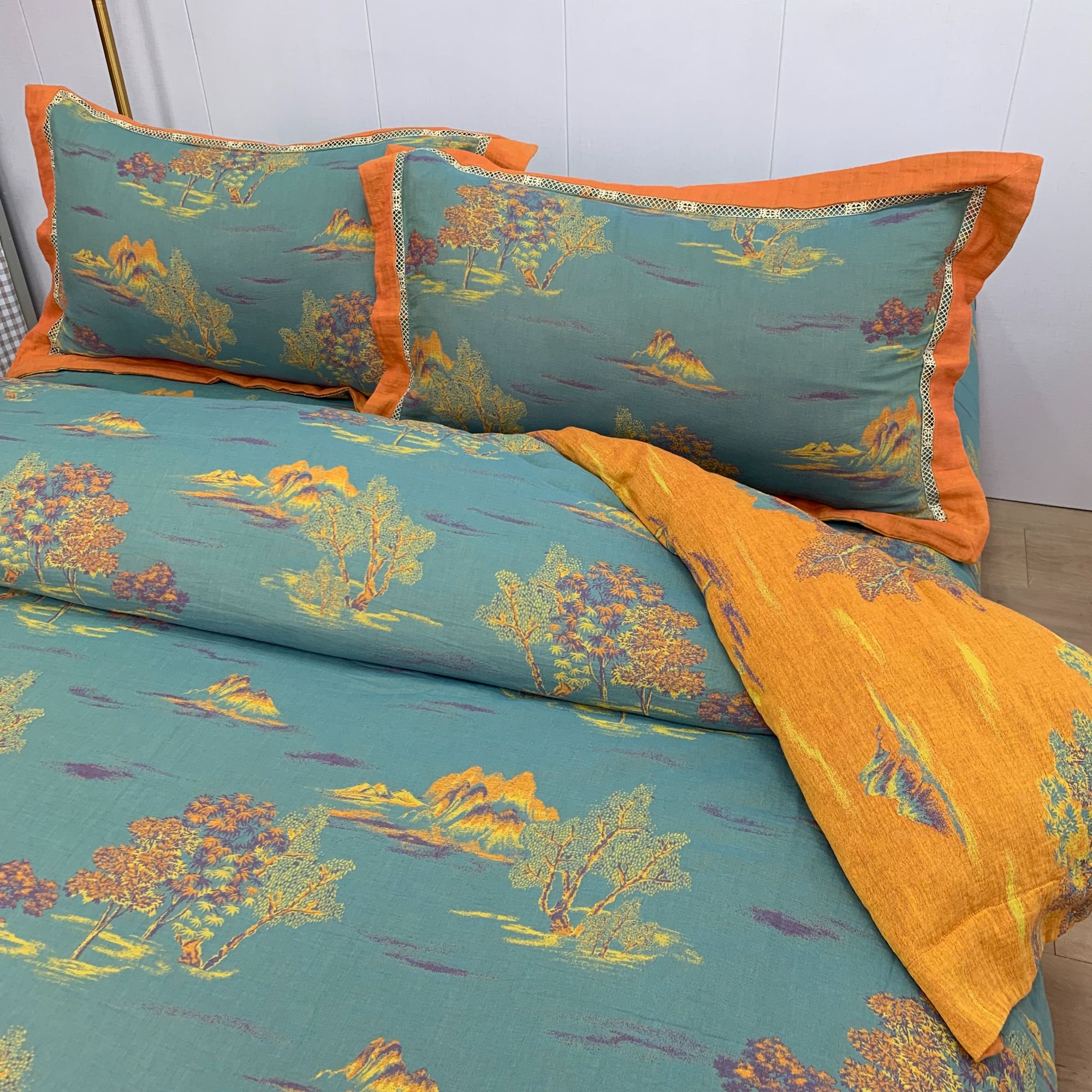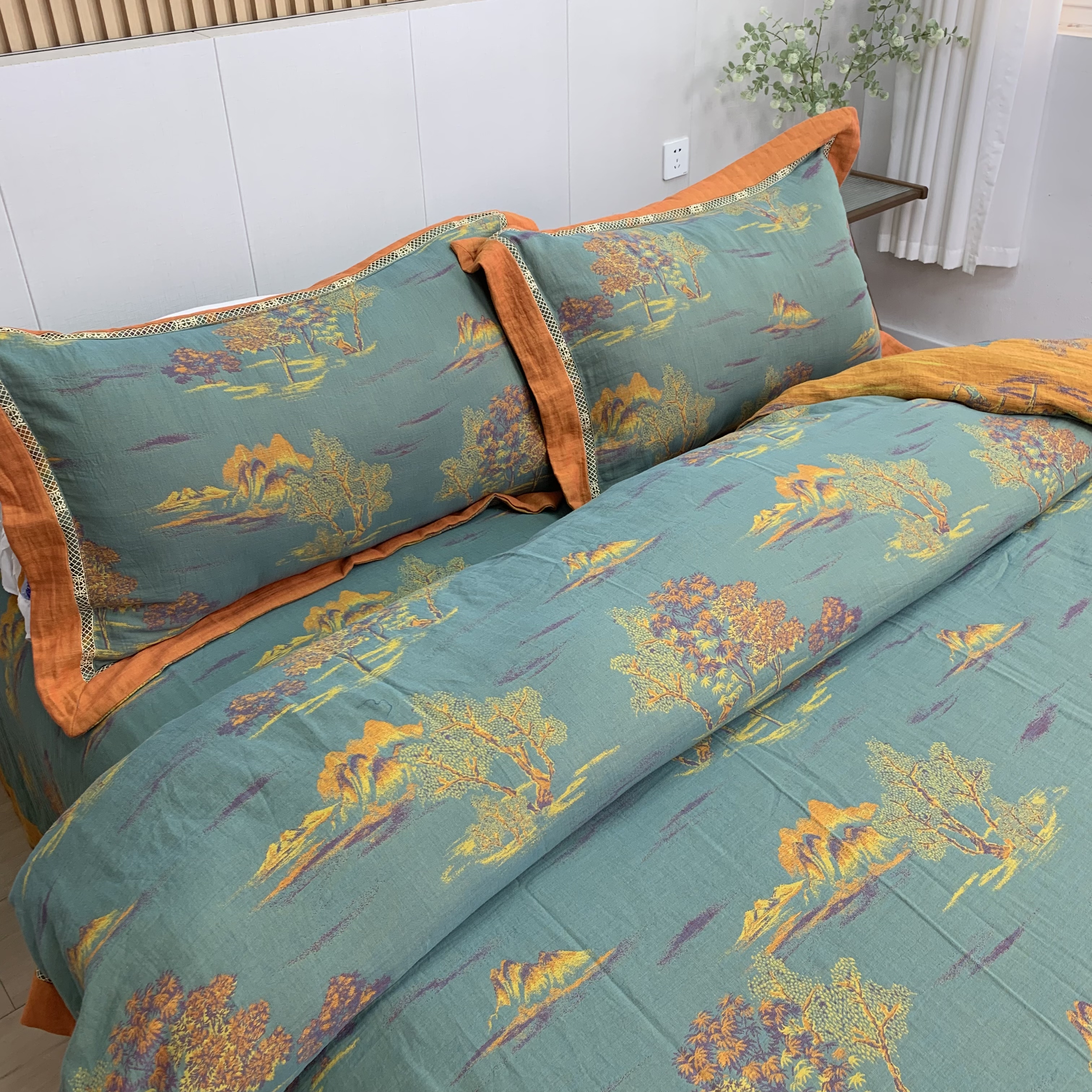 商品名称:鲁爱 2025新款全棉色织双层纱新款镂空四件套 彩韵-绿