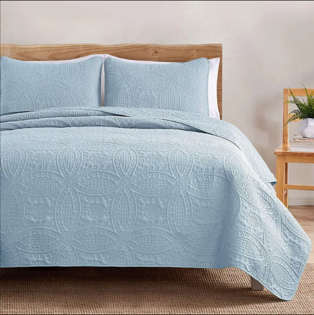 (总)跨境专供 2025新款化纤压花绗缝被可水洗床盖三件套,蒙特压花