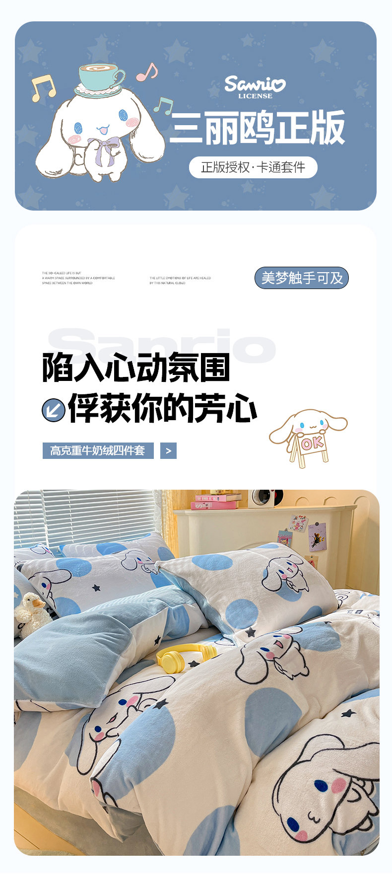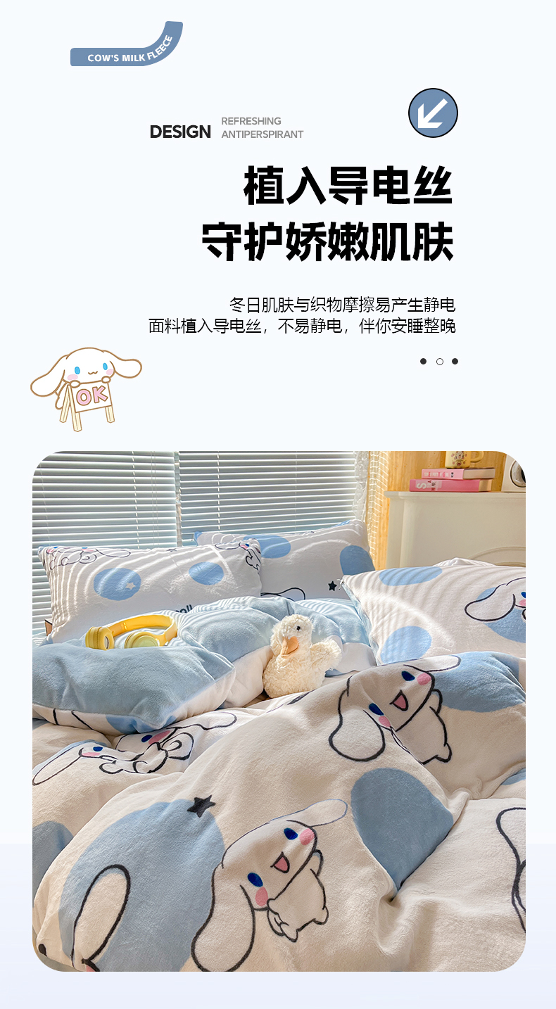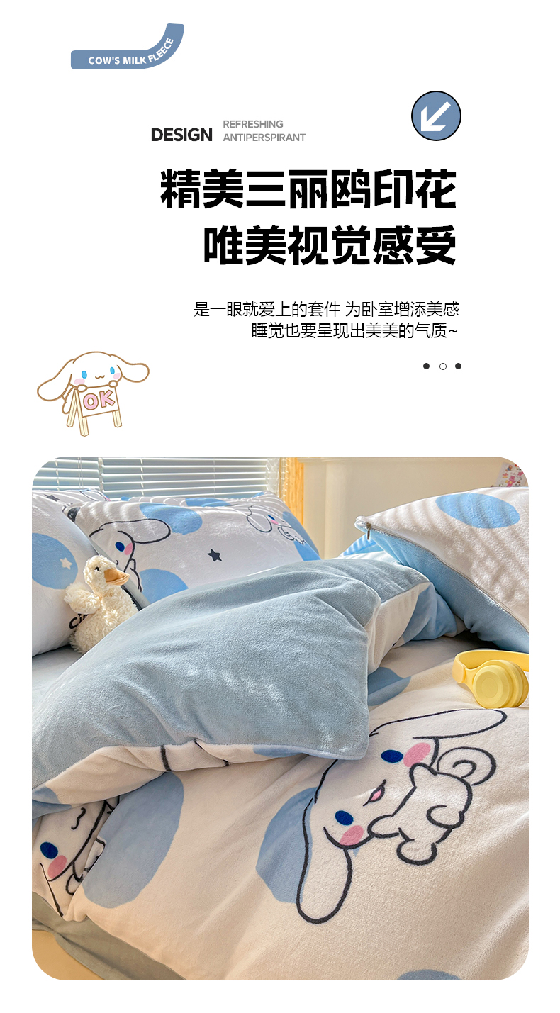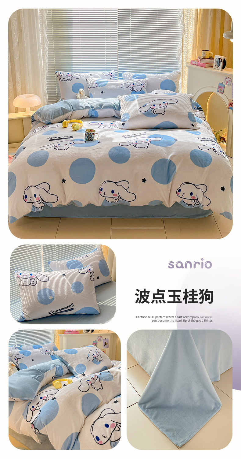 当前位置: 91家纺网 > 商品网购 > 床品套件 > 四件套 > 牛奶绒四件套 > 美澳家纺 2024新款200克三丽鸥系列卡通印花牛奶绒单被套三四件套 波点玉桂狗