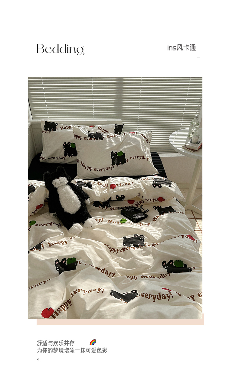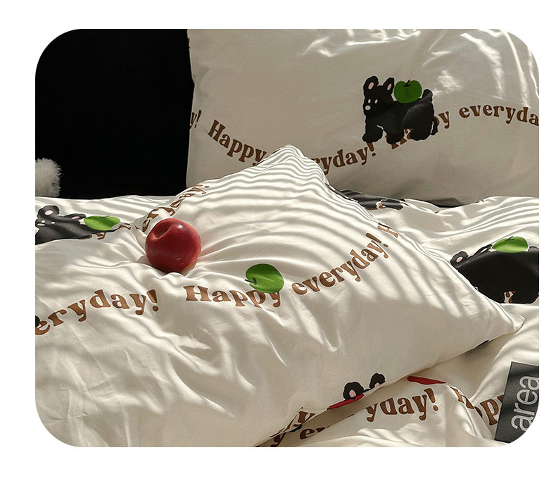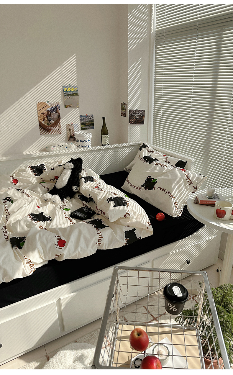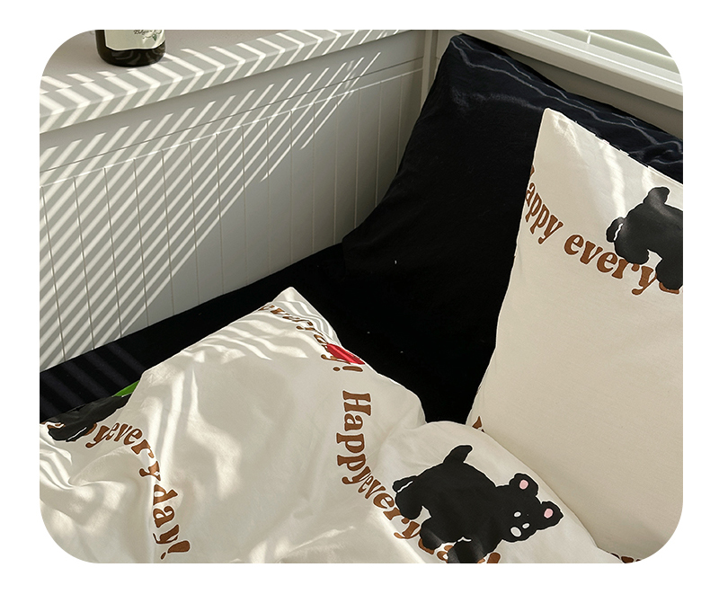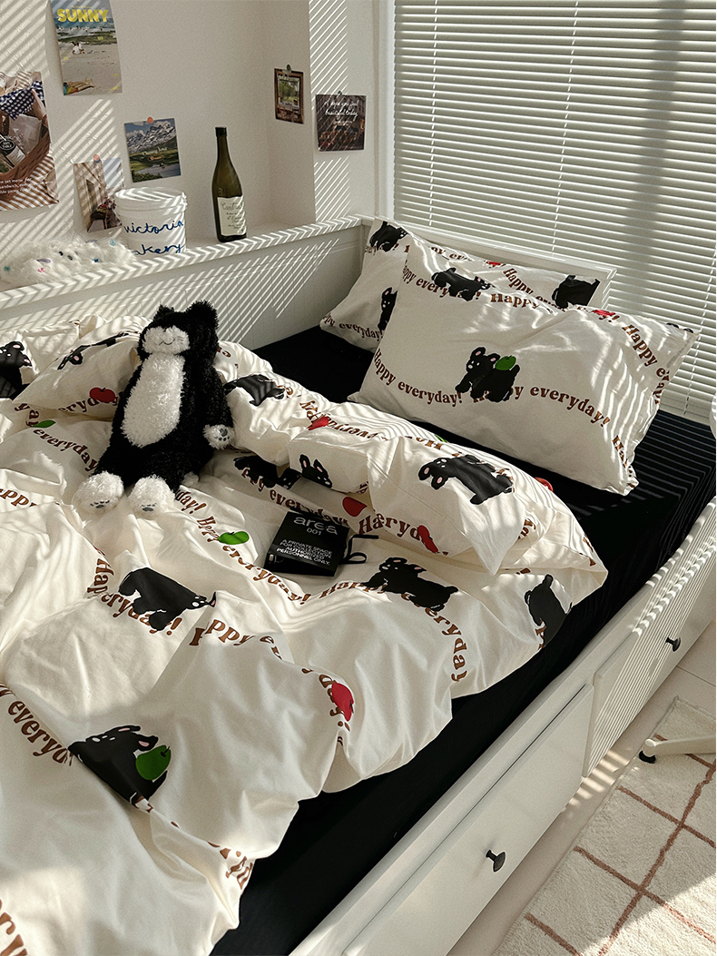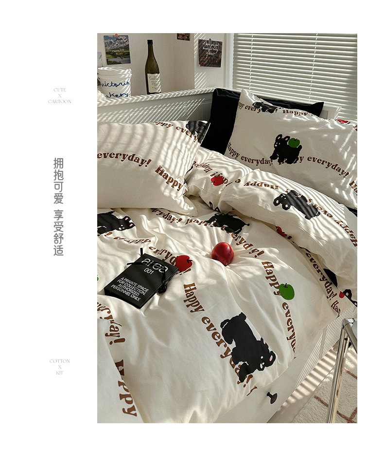 商品名称:尺素 2025年春夏新款全棉卡通四件套纯棉双人被套纯色床单床笠三件套儿童床上用品 纯爱小狗 黑