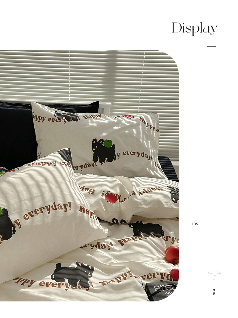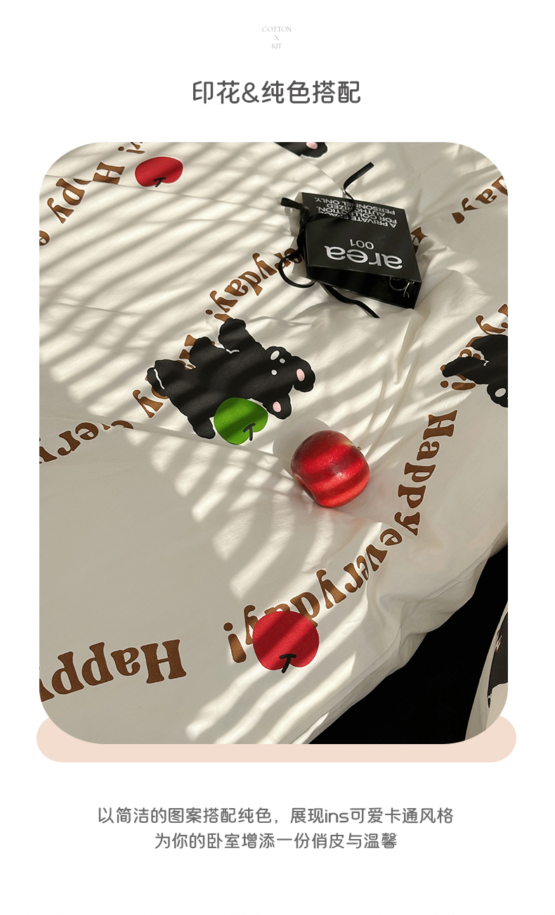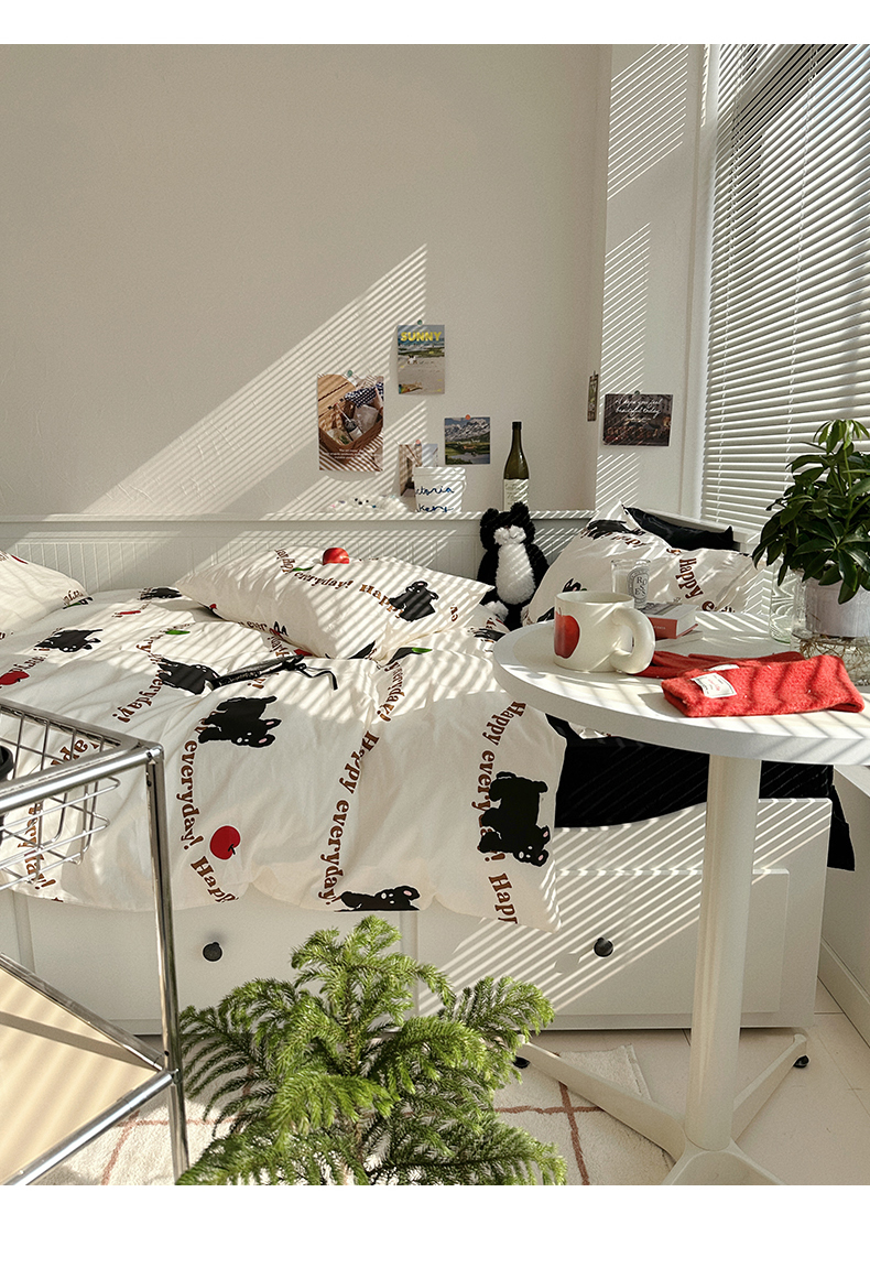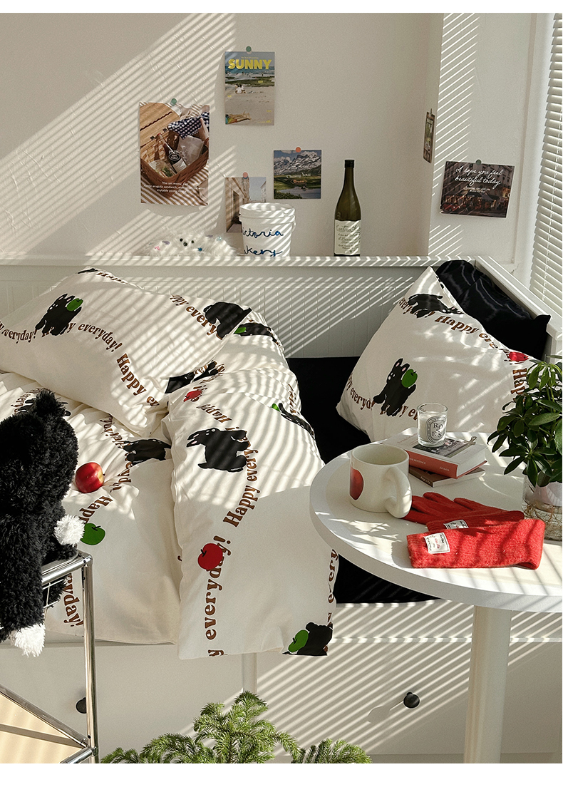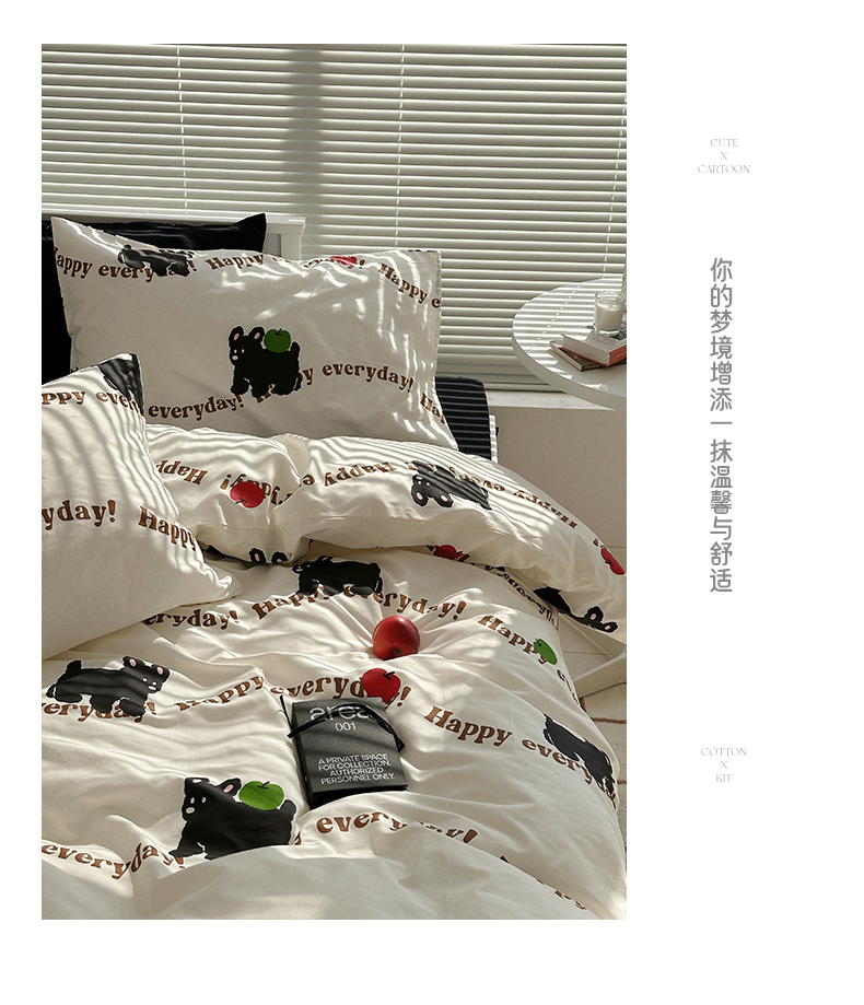 商品名称:尺素 2025年春夏新款全棉卡通四件套纯棉双人被套纯色床单床笠三件套儿童床上用品 纯爱小狗 黑