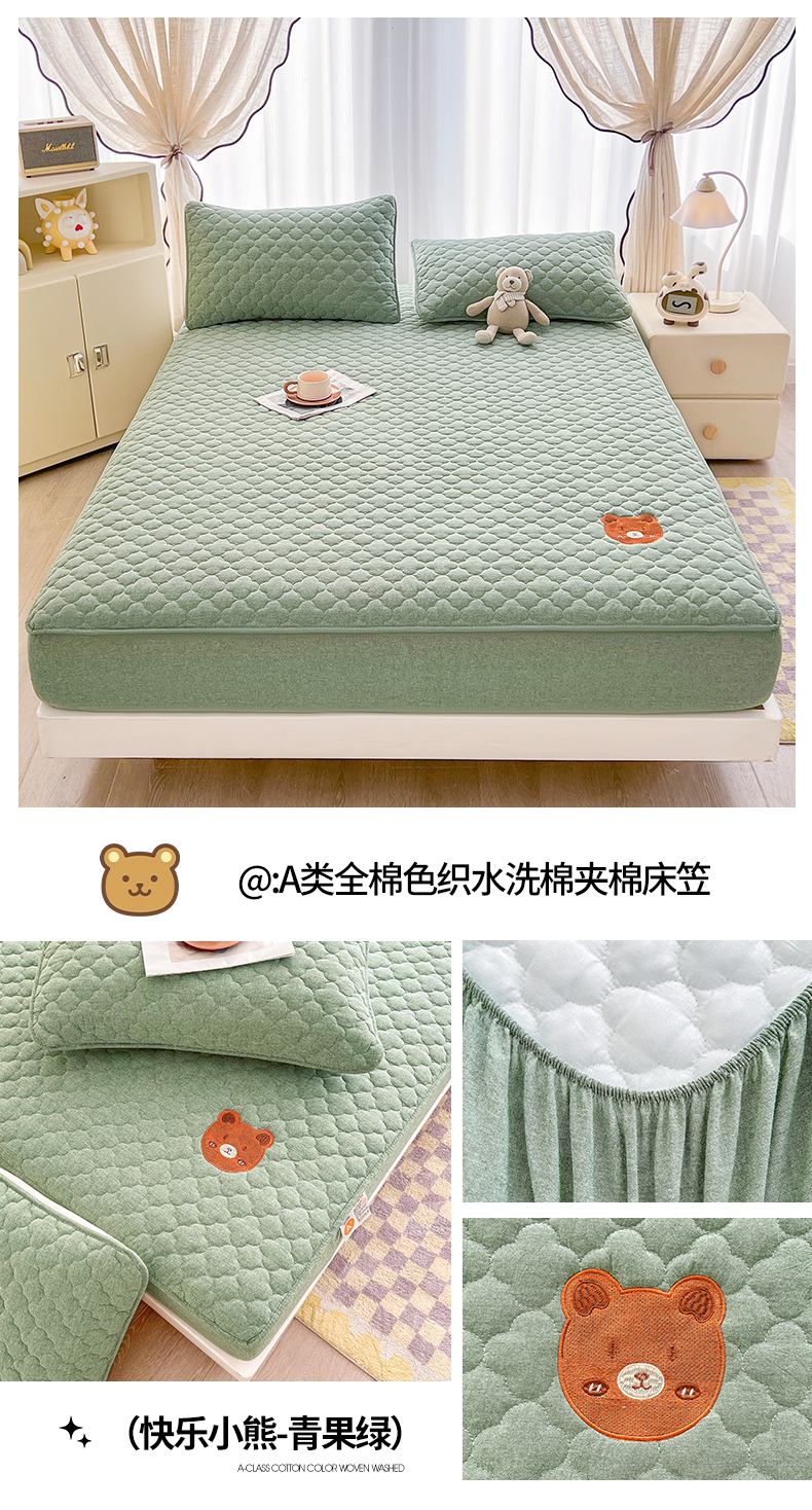 商品名称:伊人坊 2025新款全棉色织水洗棉夹棉床笠床垫保护套刺绣款 快乐小熊-青果绿