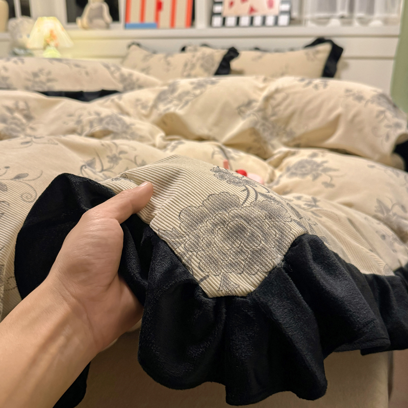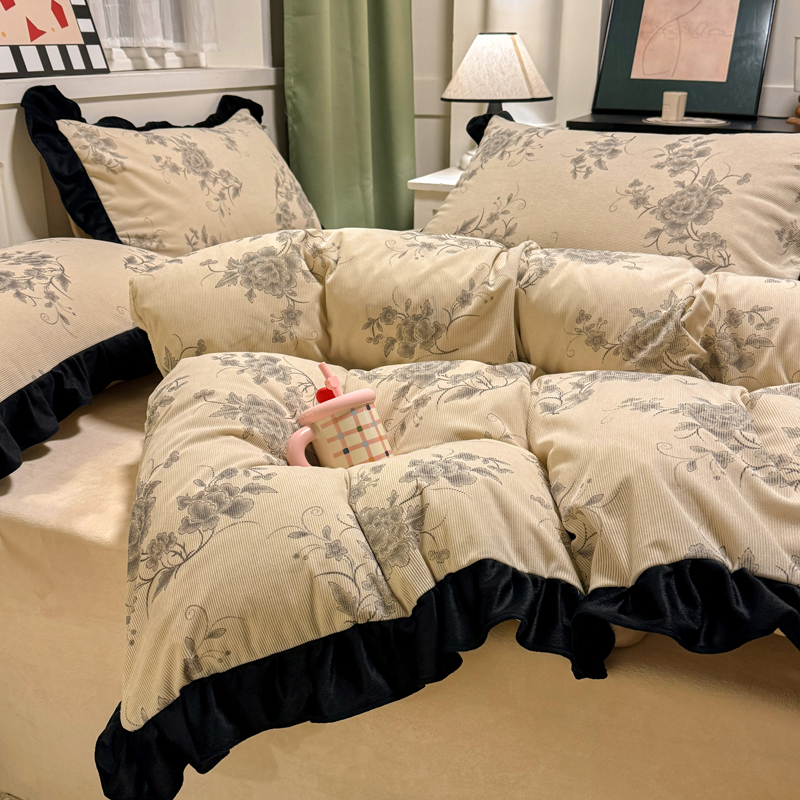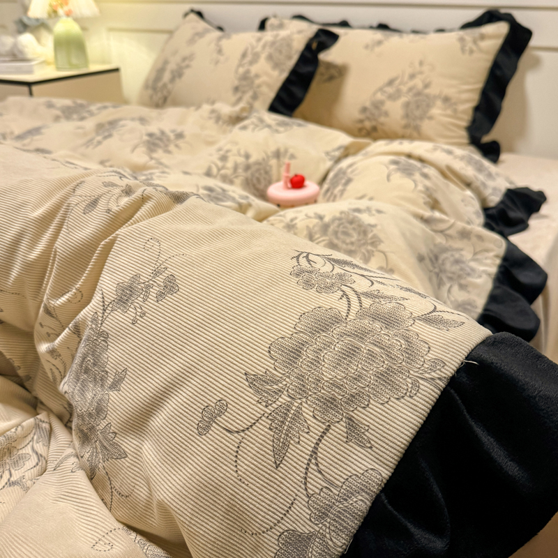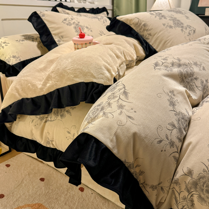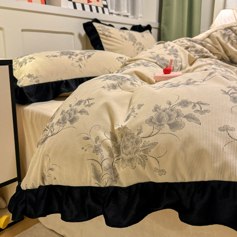 宅家居 2025新款轻法式小香风灯芯绒四件套提花立体韩版花边牛奶绒三件套-实拍风 牡丹