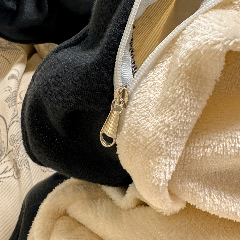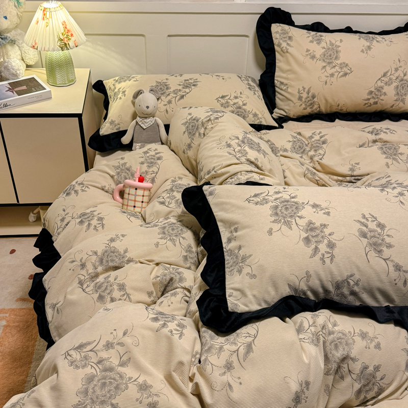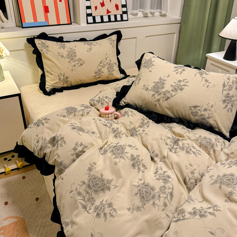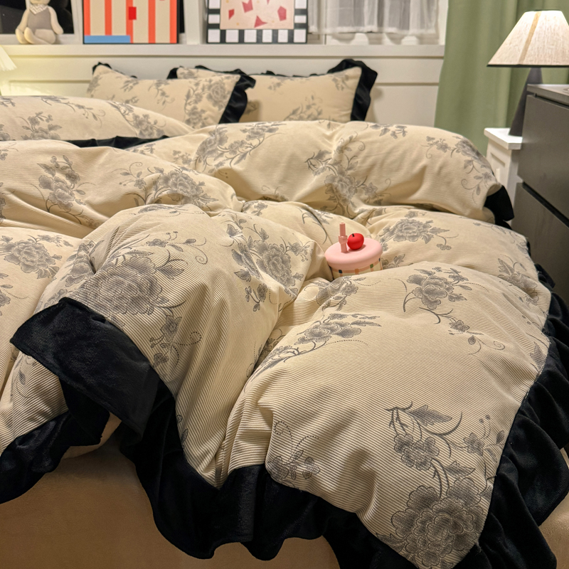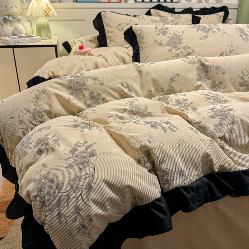 宅家居 2025新款轻法式小香风灯芯绒四件套提花立体韩版花边牛奶绒三件套-实拍风 牡丹