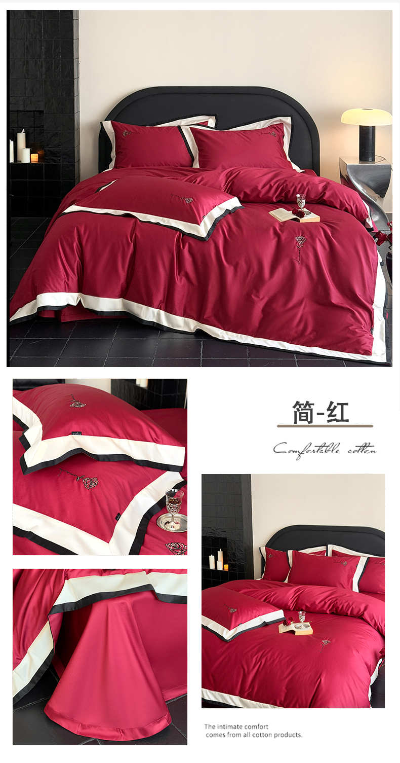 佳汐蓝家纺 2025新款100支澳棉刺绣拼接四件套-简 简-红色