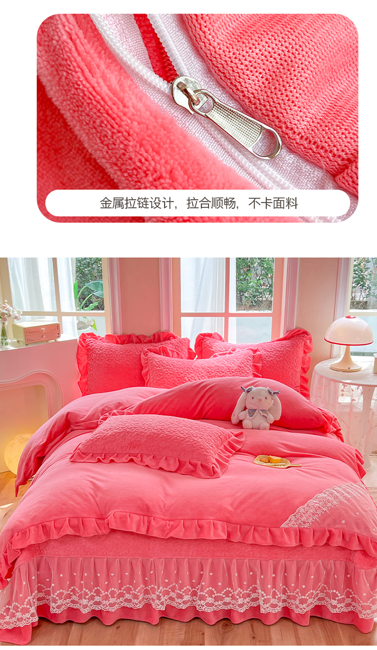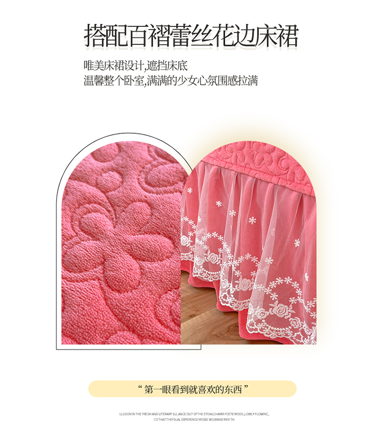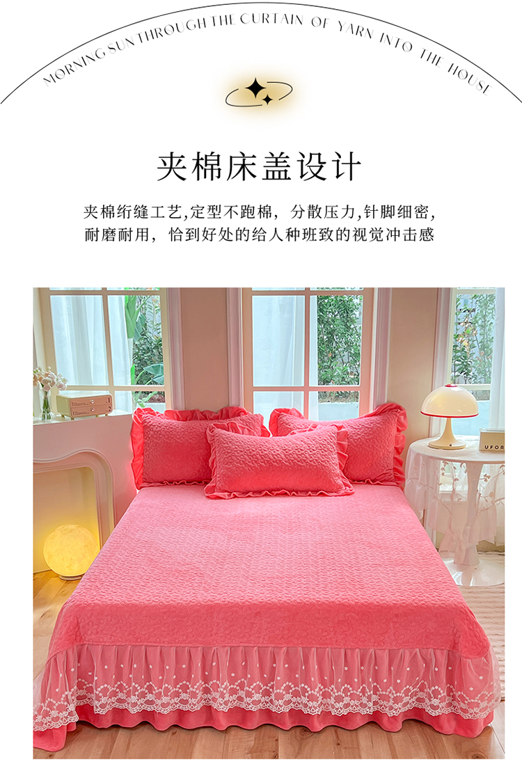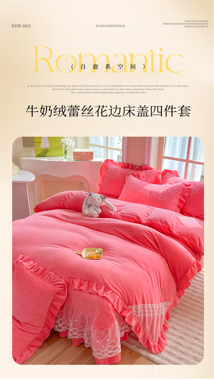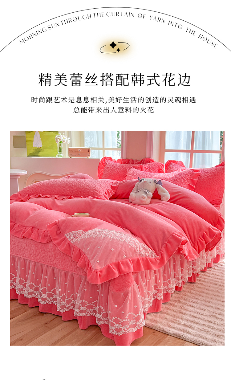 商品名称:2025秋冬新款220g全消光牛奶绒床盖四件套12斤重加厚婴儿绒法莱绒床裙款床盖款四件套 浪漫花语—豆沙红