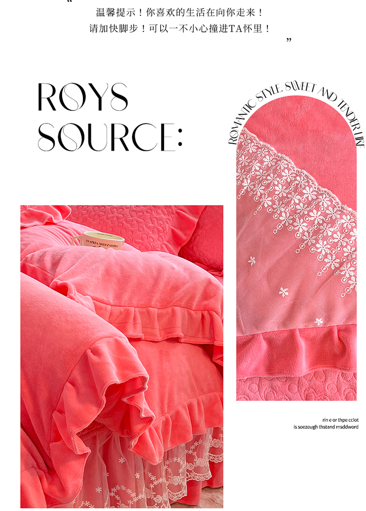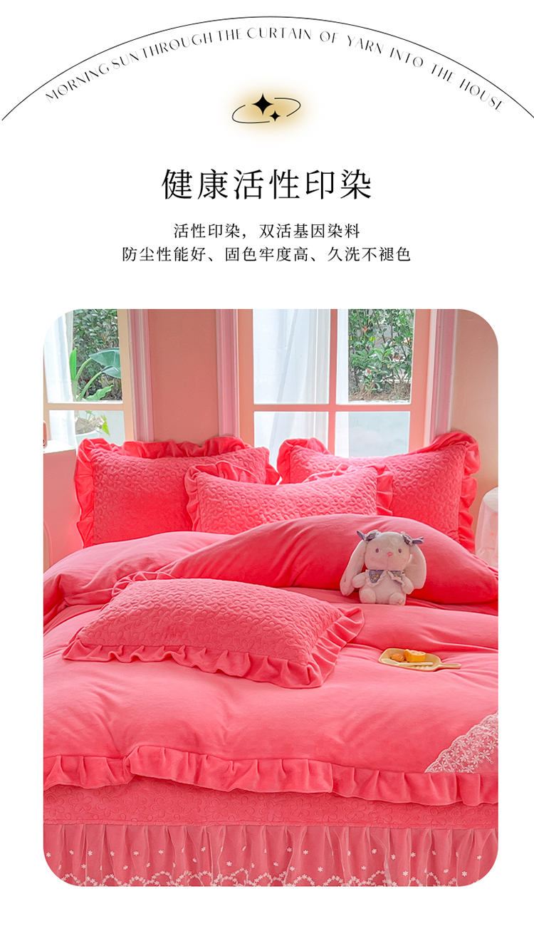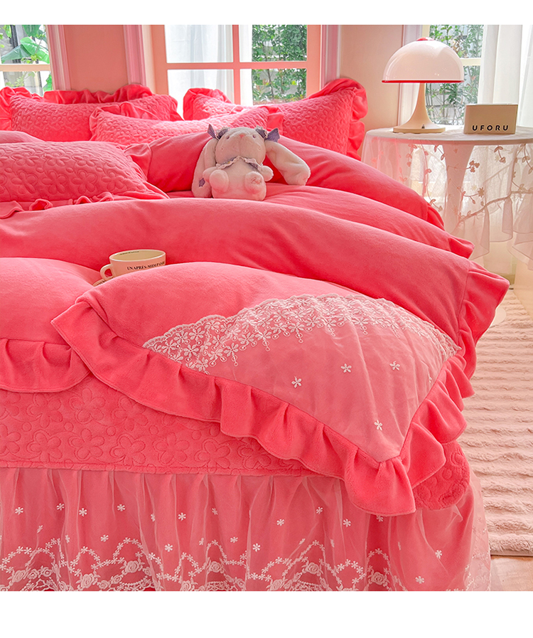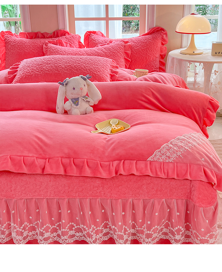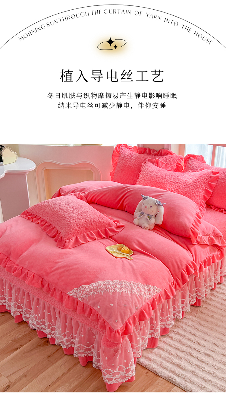 商品名称:2025秋冬新款220g全消光牛奶绒床盖四件套12斤重加厚婴儿绒法莱绒床裙款床盖款四件套 浪漫花语—豆沙红