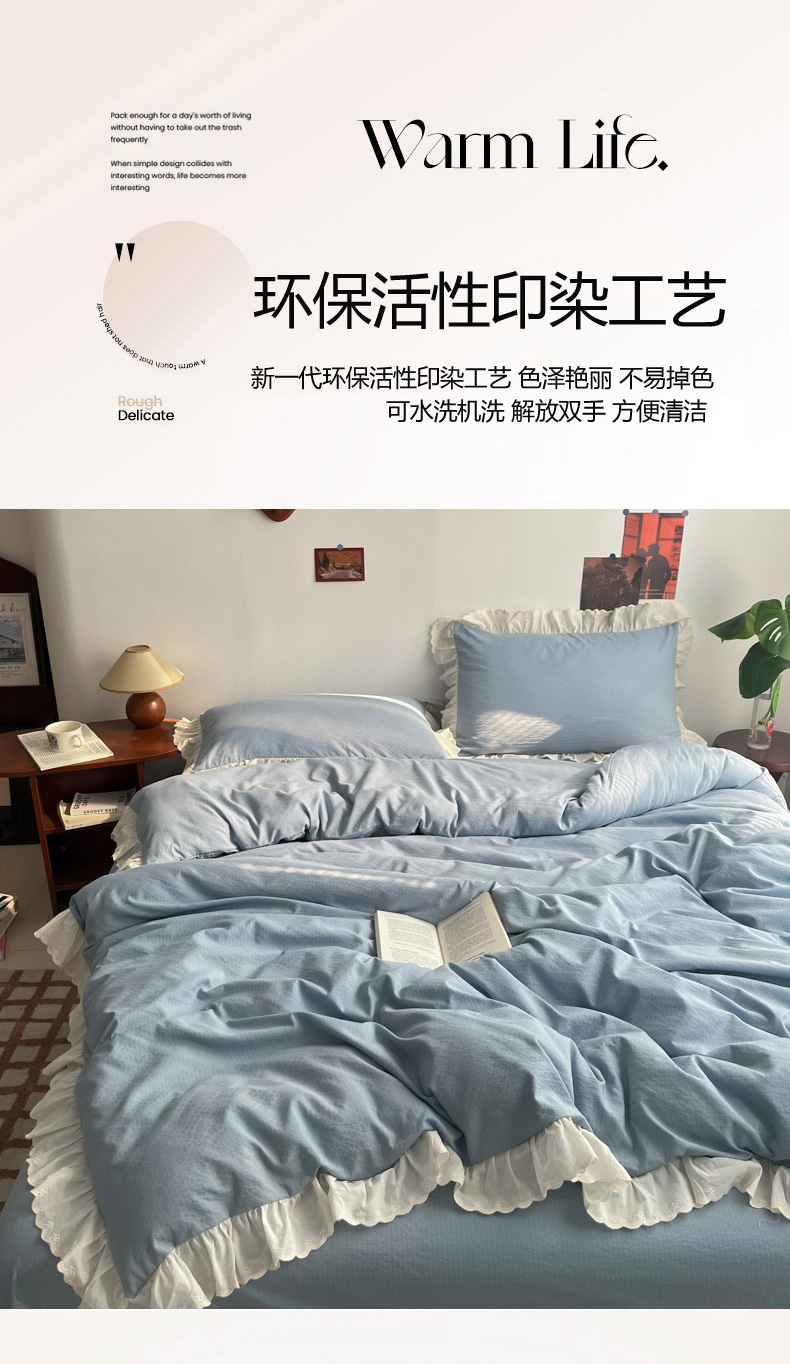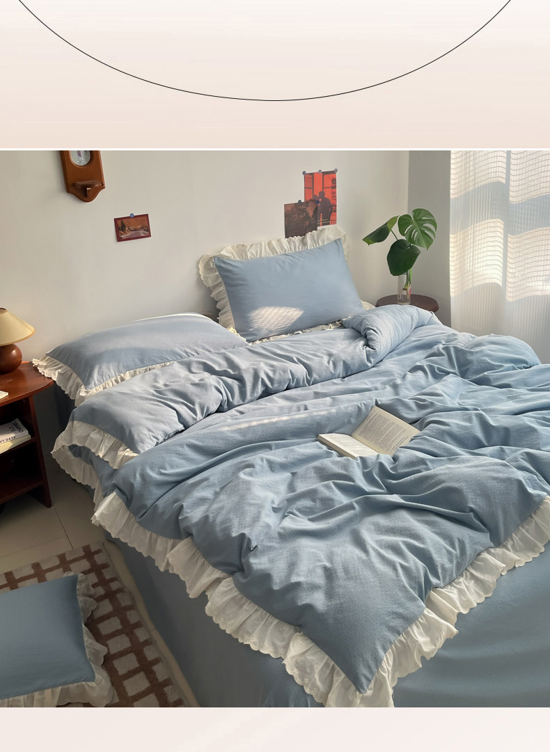 总慕澄家纺 2022新款韩版泡泡纱花边四件套(手机实拍),公主粉,极致灰,梨花白,梨花白+灰,奶油黄,宁静蓝,优雅紫