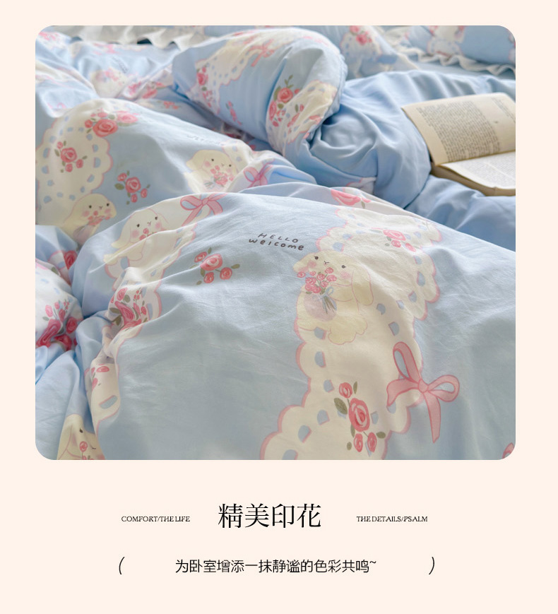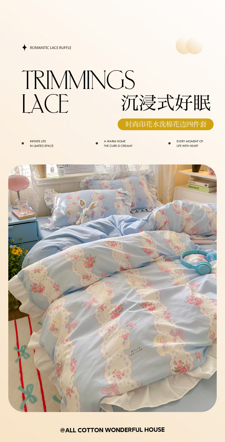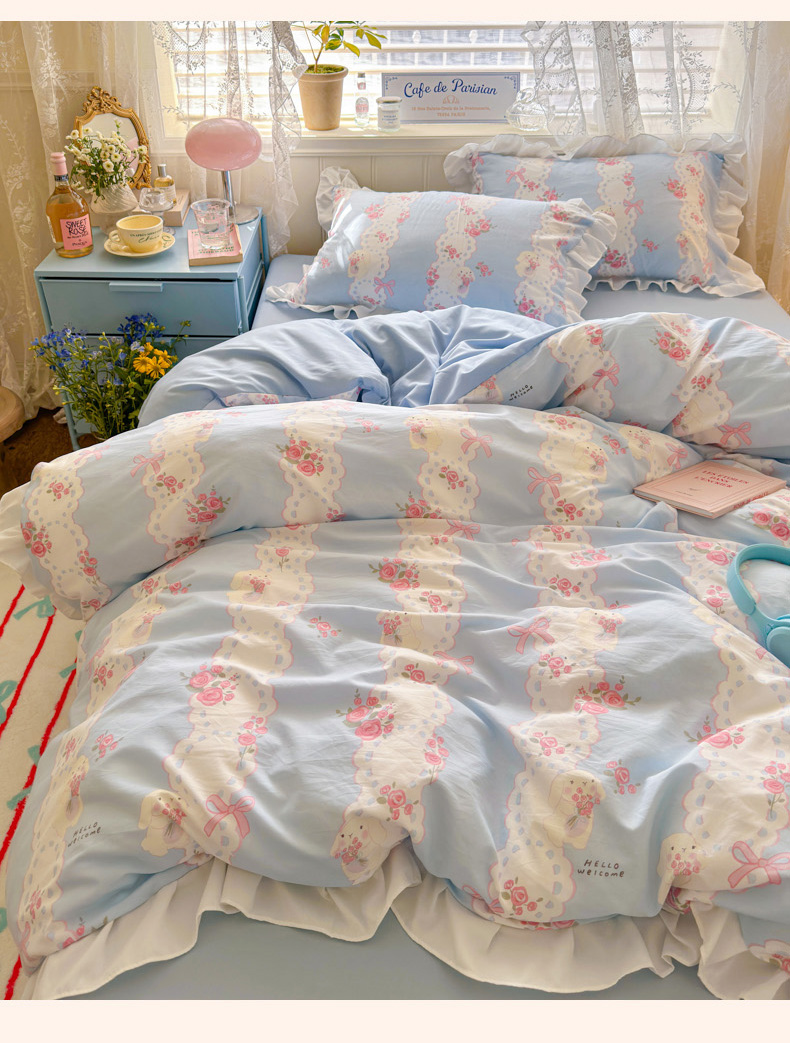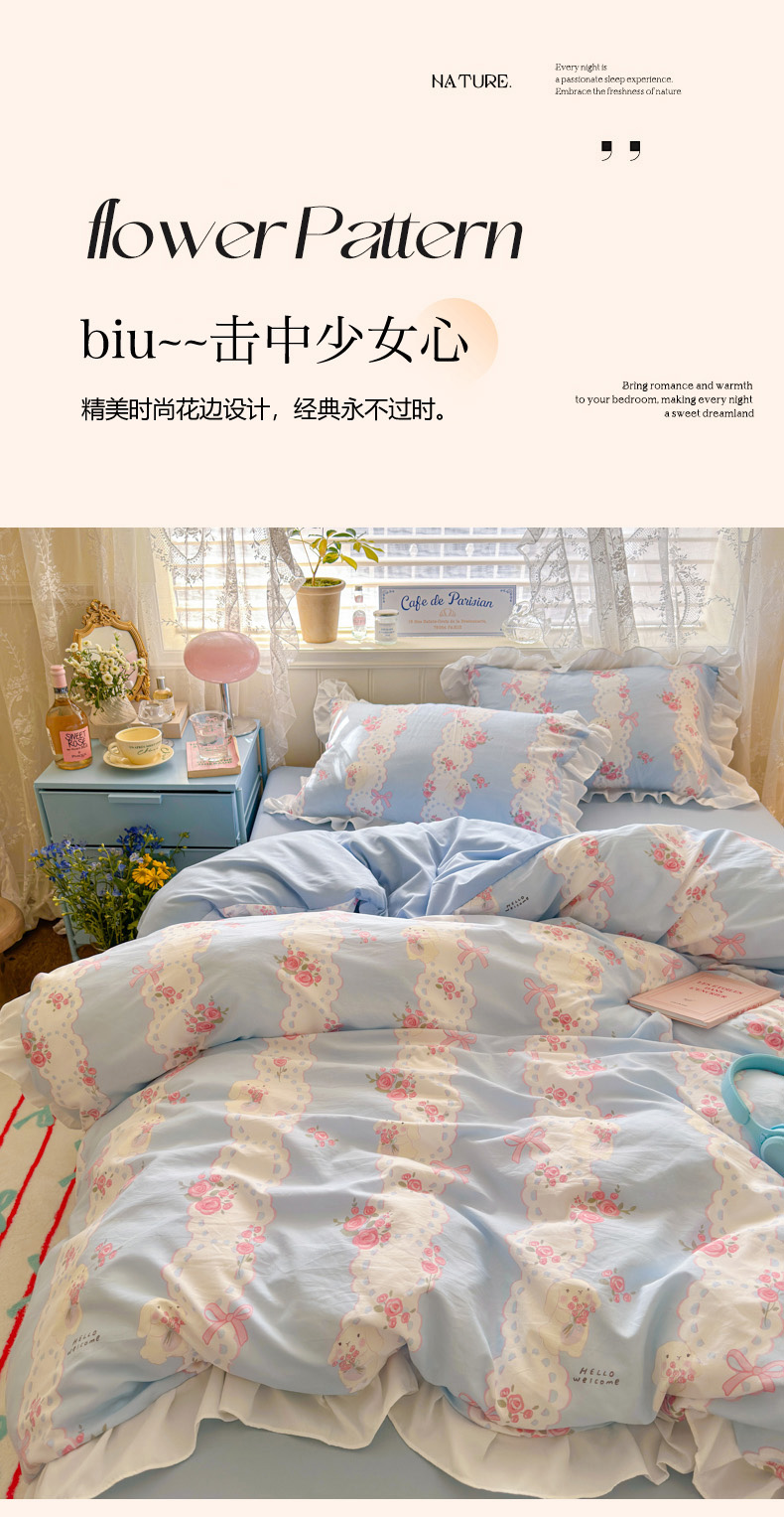 当前位置: 91家纺网 > 商品网购 > 床品套件 > 四件套 > 水洗棉四件套 > 慕澄家纺 2025新款法式浪漫风花边款水洗棉四件套 花边款-蓝色花语