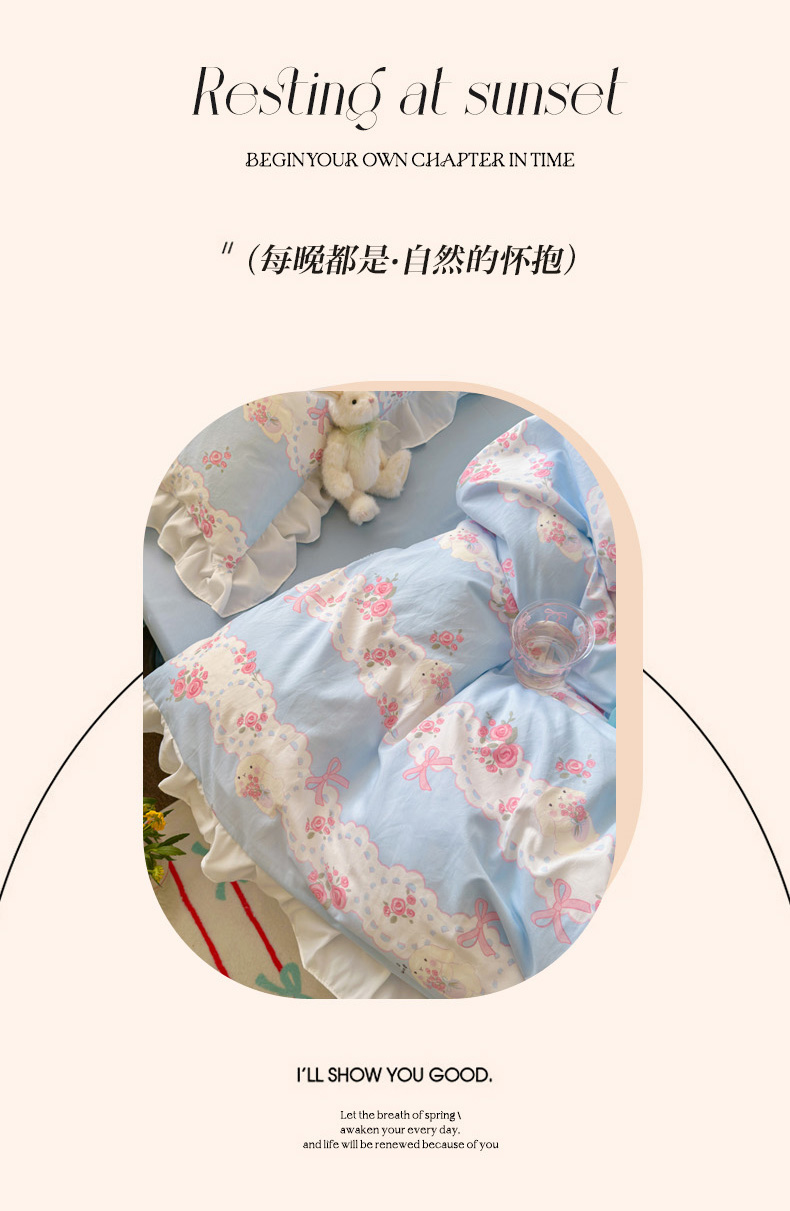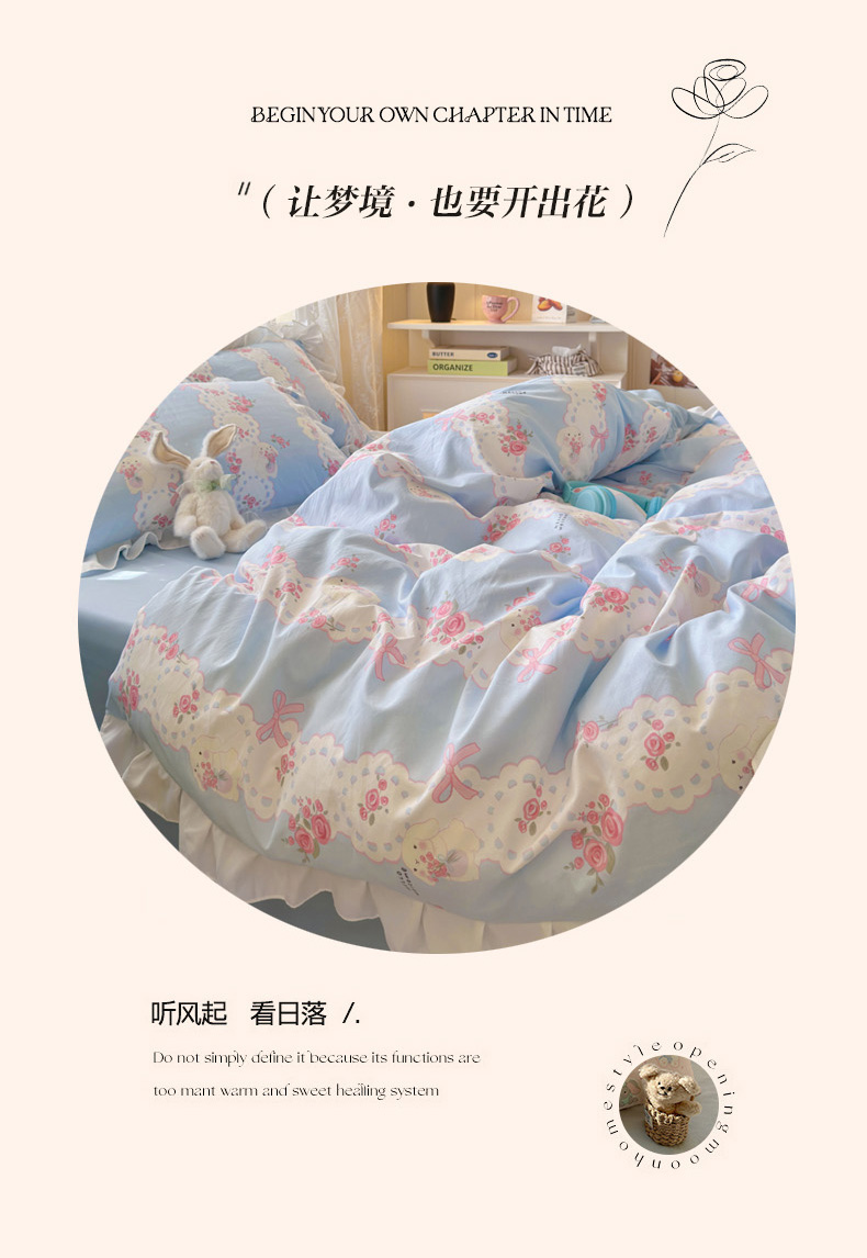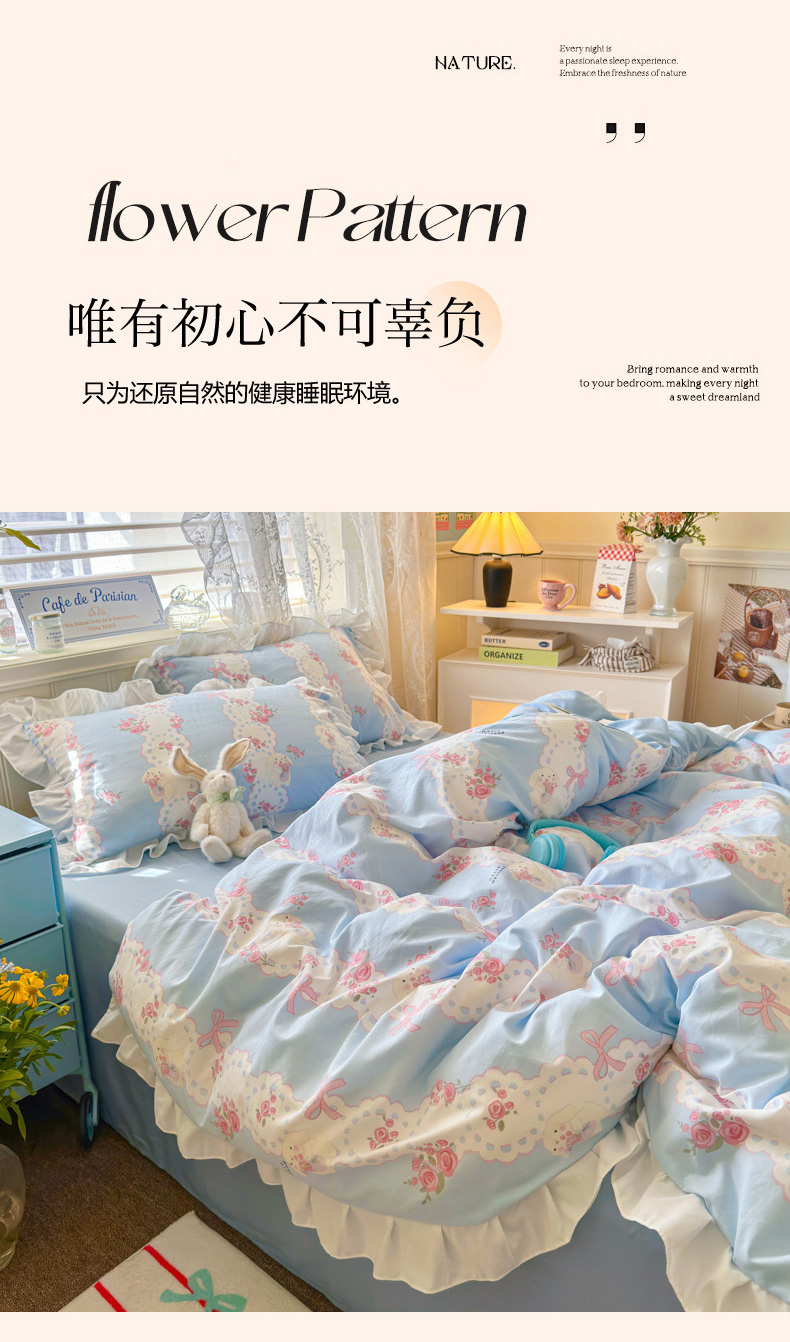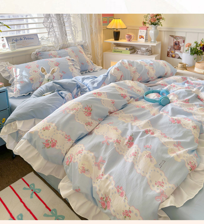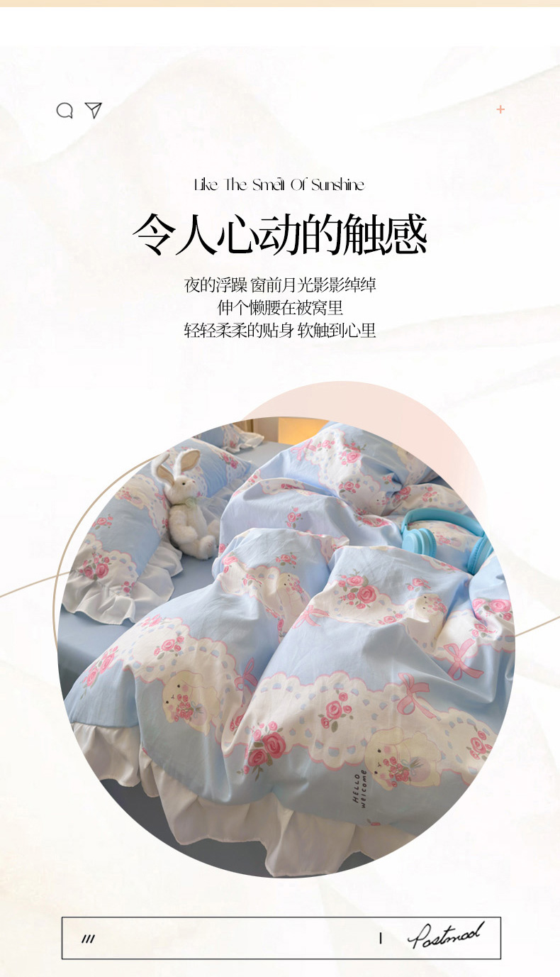 当前位置: 91家纺网 > 商品网购 > 床品套件 > 四件套 > 水洗棉四件套 > 慕澄家纺 2025新款法式浪漫风花边款水洗棉四件套 花边款-蓝色花语
