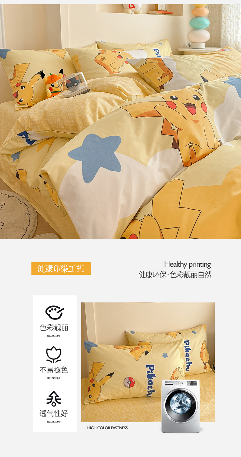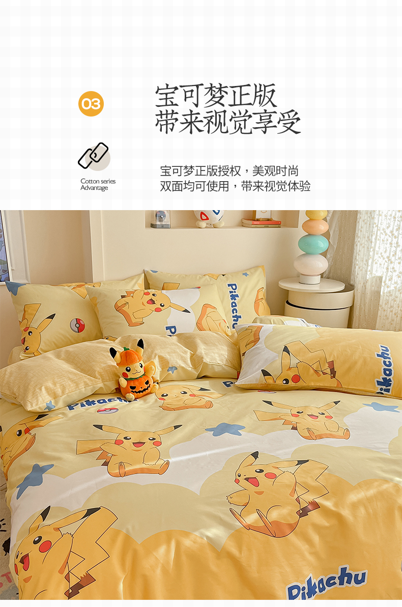 当前位置: 91家纺网 > 商品网购 > 床品套件 > 四件套 > 全棉普通四件套 > 桃子家居 2025新款宝可梦正版授权皮卡丘纯棉印花系列四件套 棉宝可梦-宝贝皮卡丘