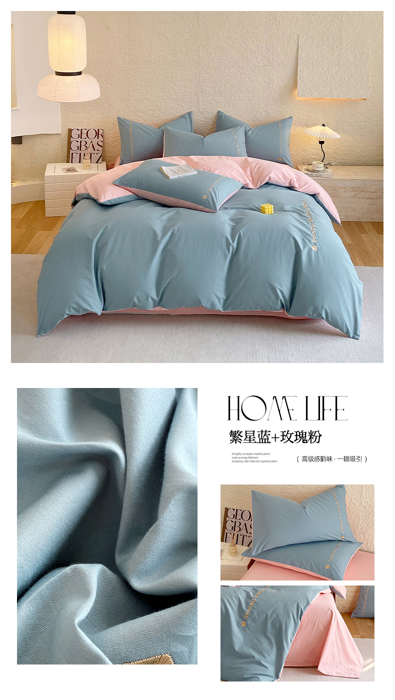 当前位置: 91家纺网 > 商品网购 > 床品套件 > 四件套 > 水洗棉四件套 > 拼社家纺 2025新款母婴及全棉水洗棉刺绣四件套纯棉床上用品 繁星蓝+玫瑰粉