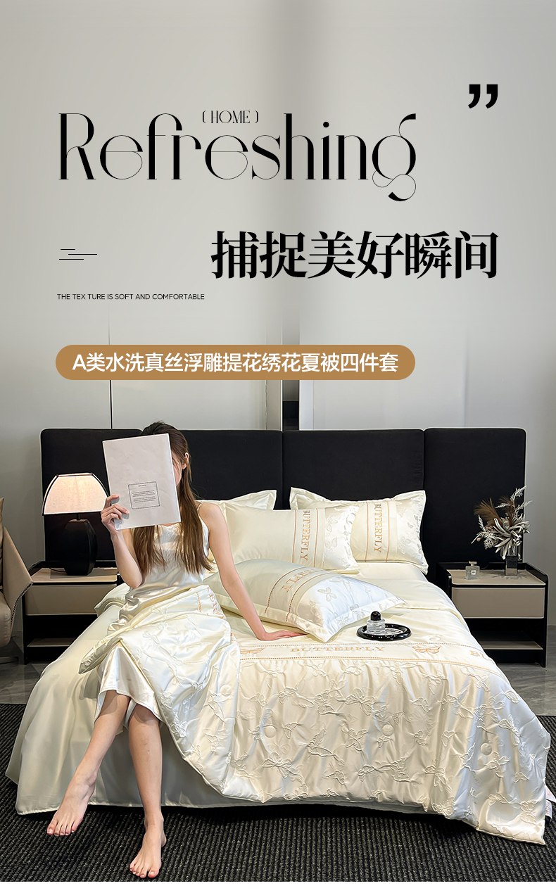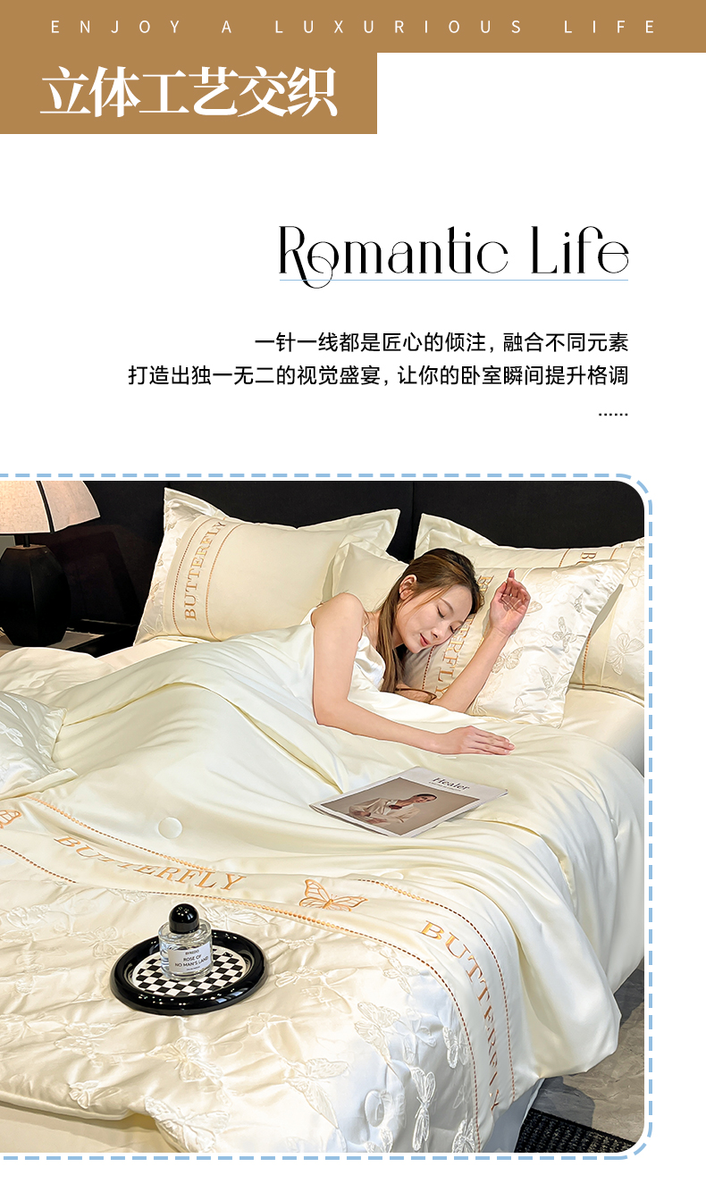 当前位置: 91家纺网 > 商品网购 > 床品套件 > 四件套 > 夏被四件套 > 宇航家纺 2025新款水洗真丝浮雕提花绣花夏被四件套 褔蝶-香槟
