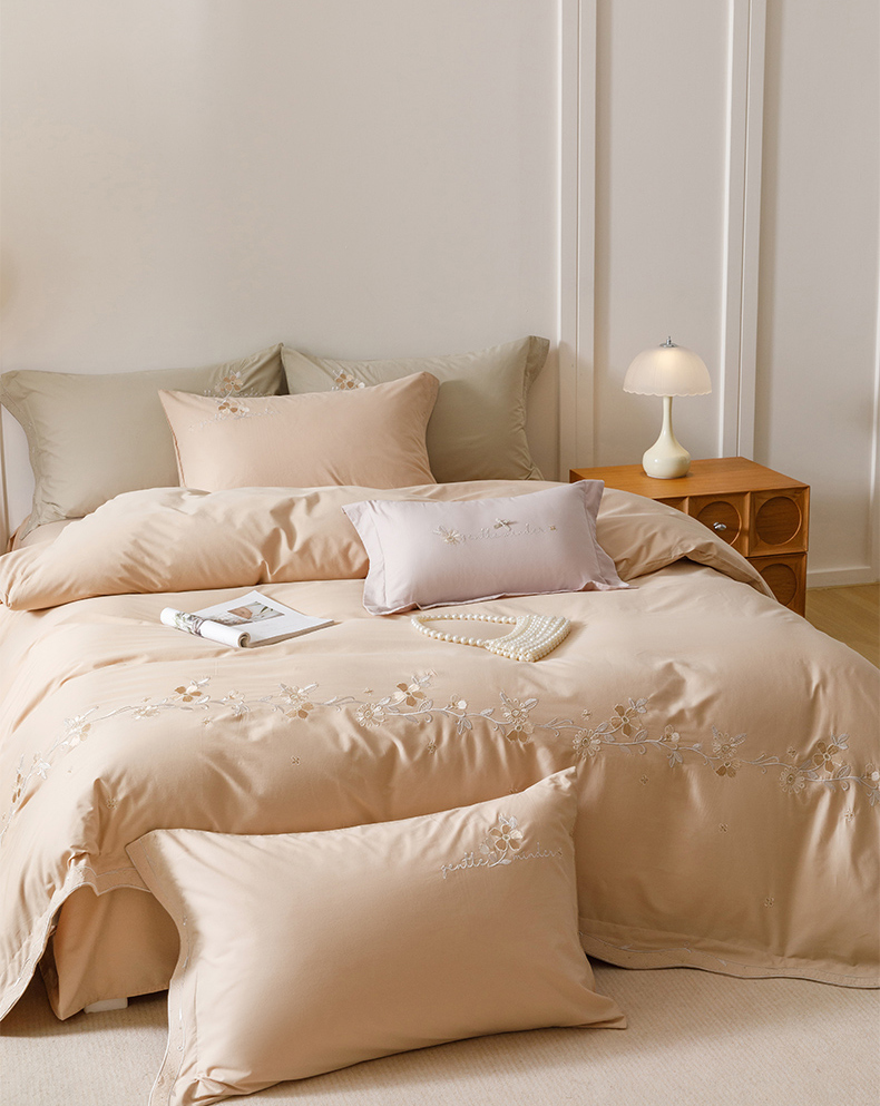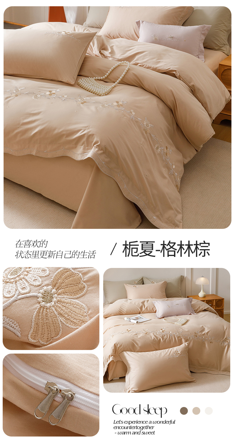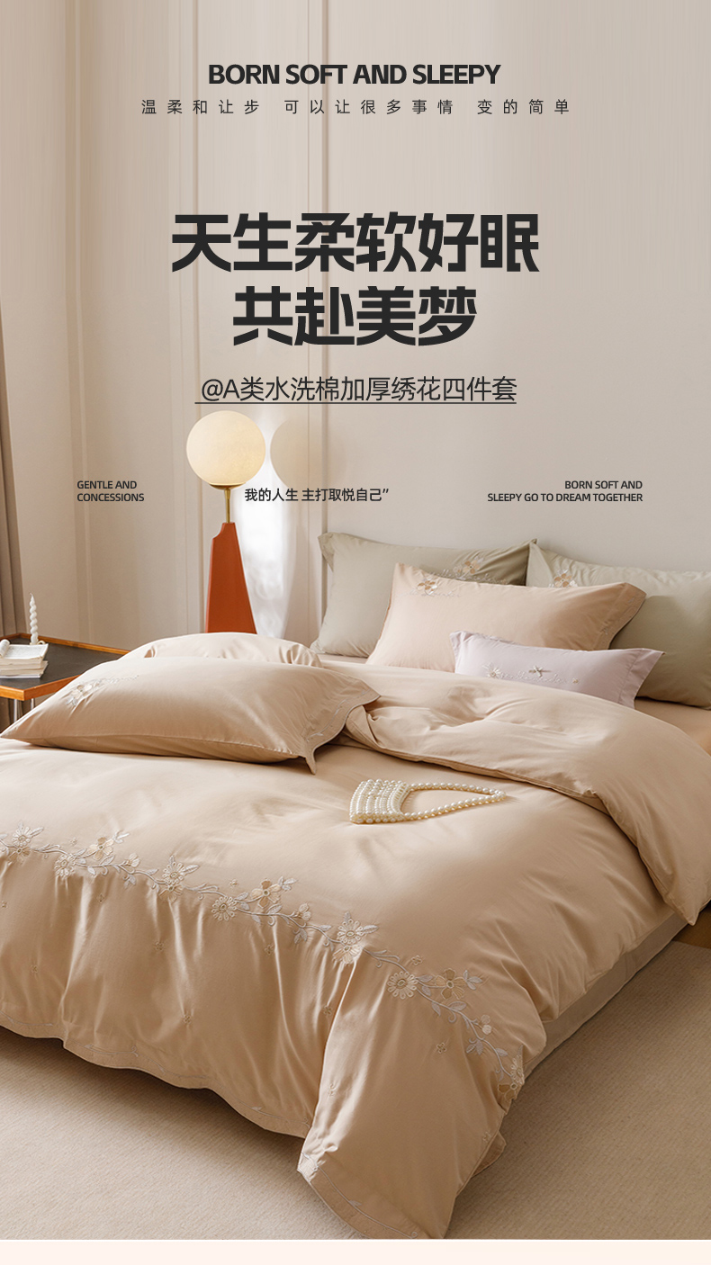 艾莱家纺 2025新款A类水洗棉加厚绣花四件套-栀夏 栀夏-格林棕