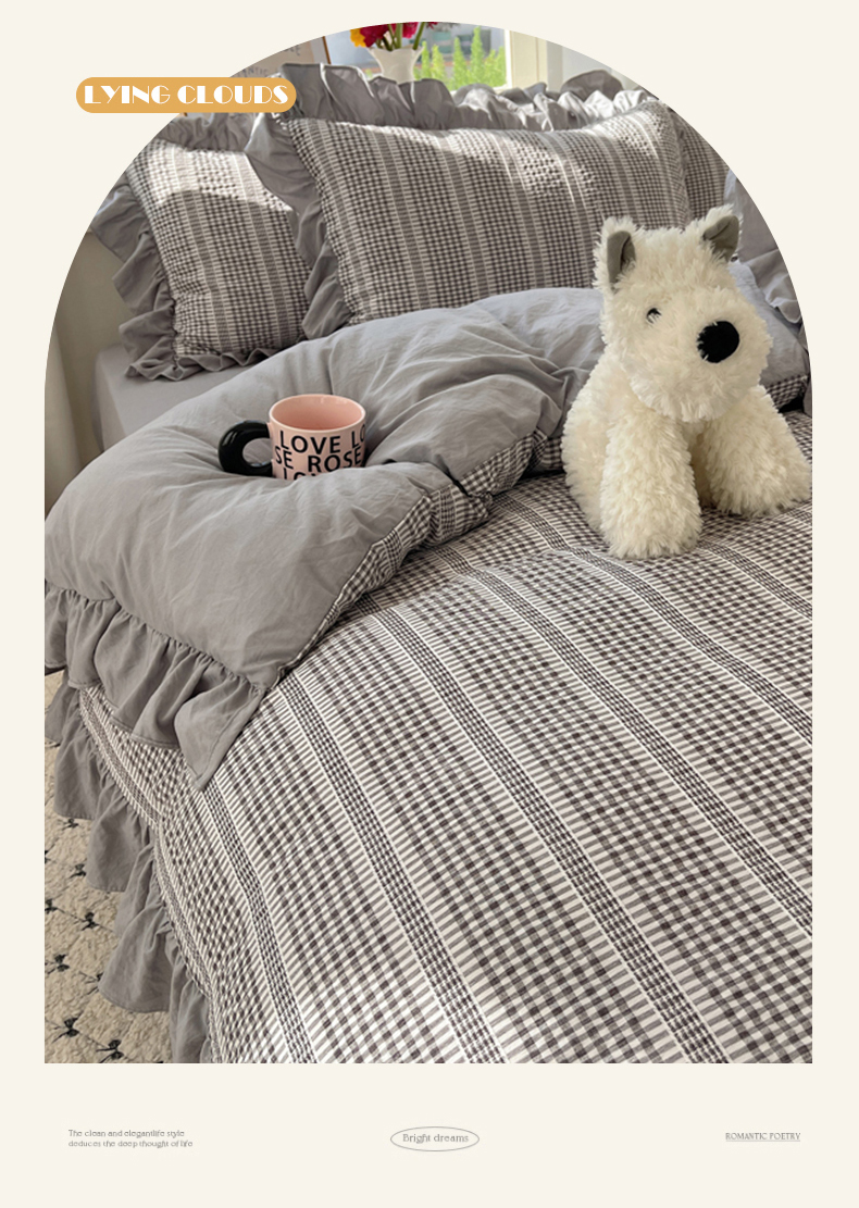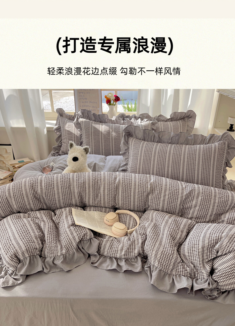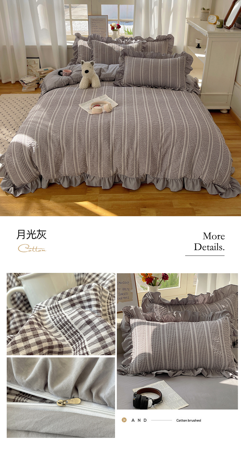 商品名称:十里居 2025新款泡泡纱提花韩版公主格水洗棉花边款四件套 月光灰