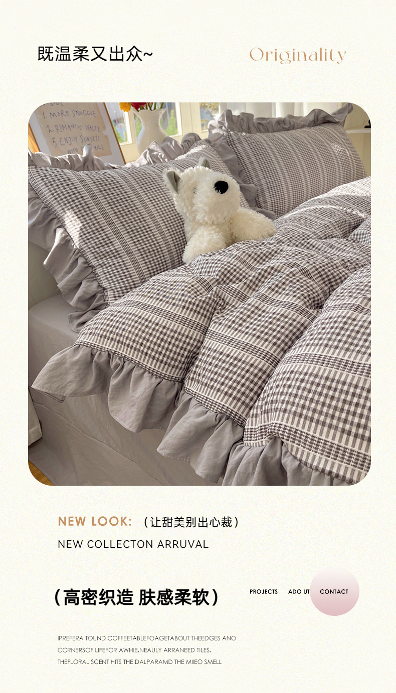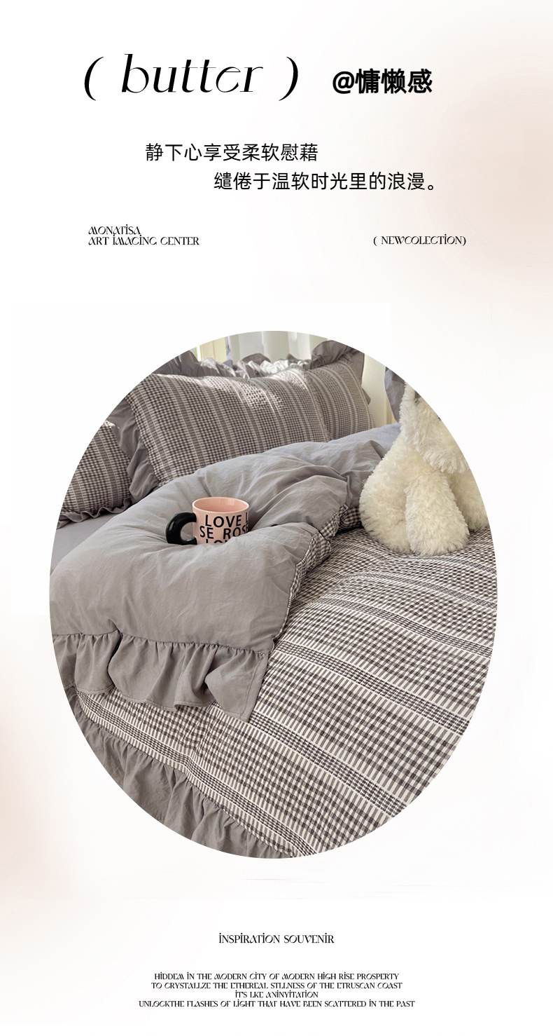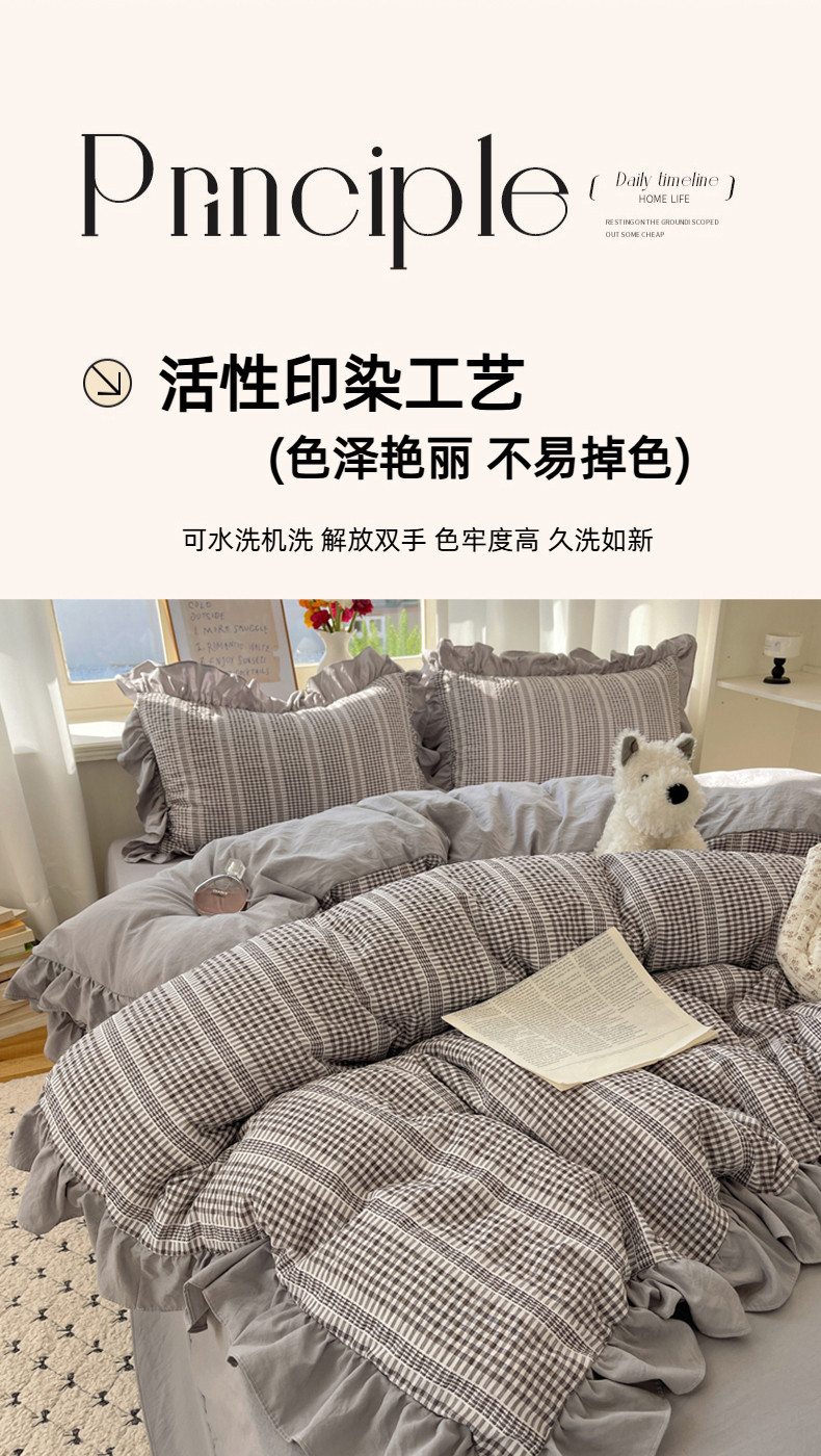 商品名称:十里居 2025新款泡泡纱提花韩版公主格水洗棉花边款四件套 月光灰