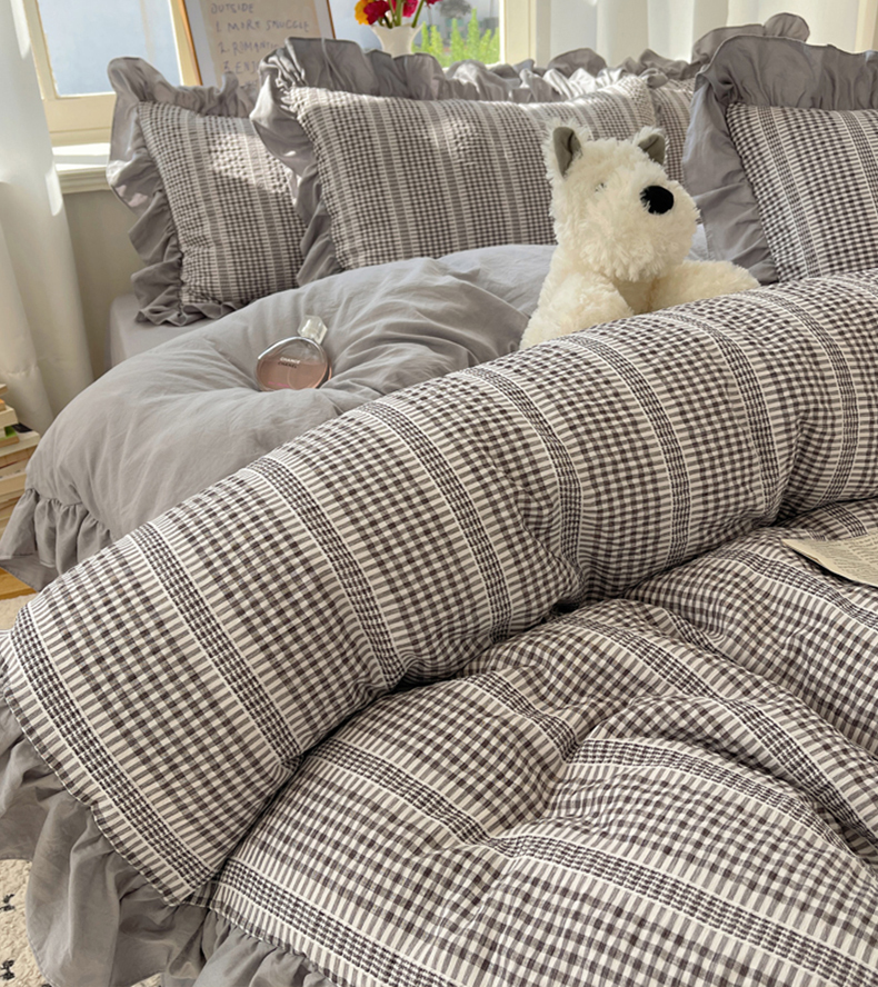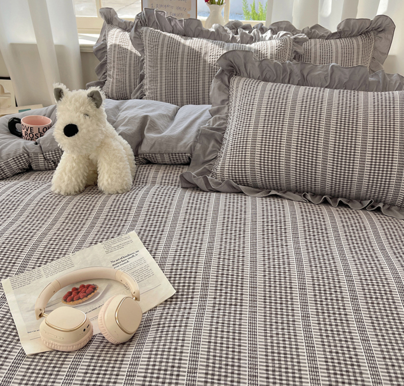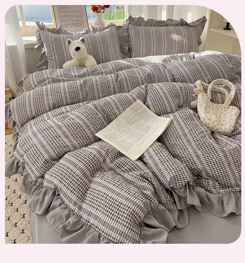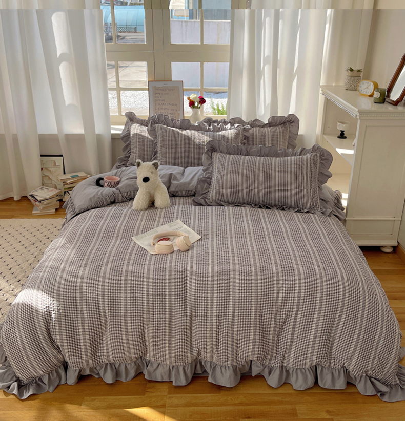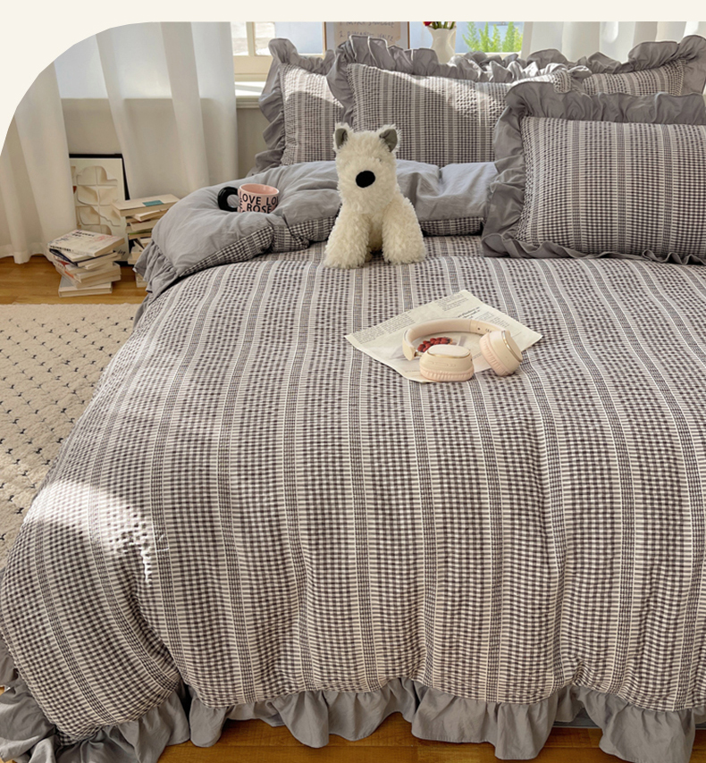 十里居 2025新款泡泡纱提花韩版公主格水洗棉花边款四件套 月光灰