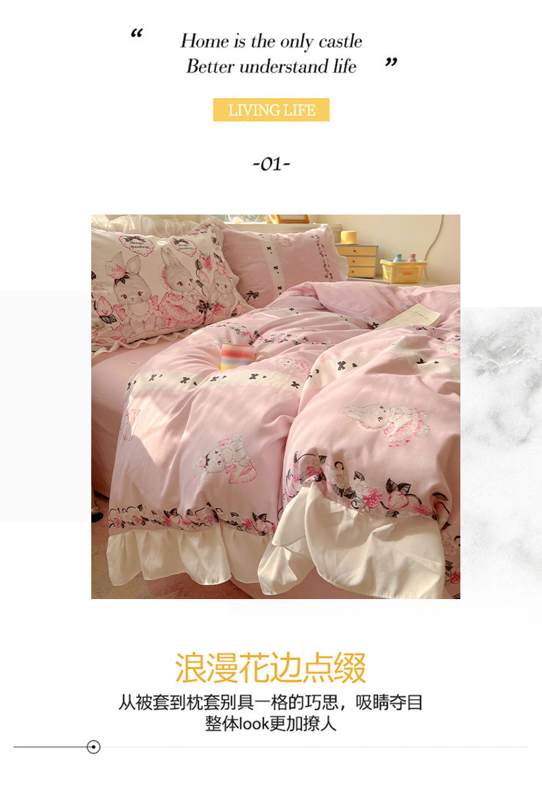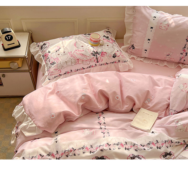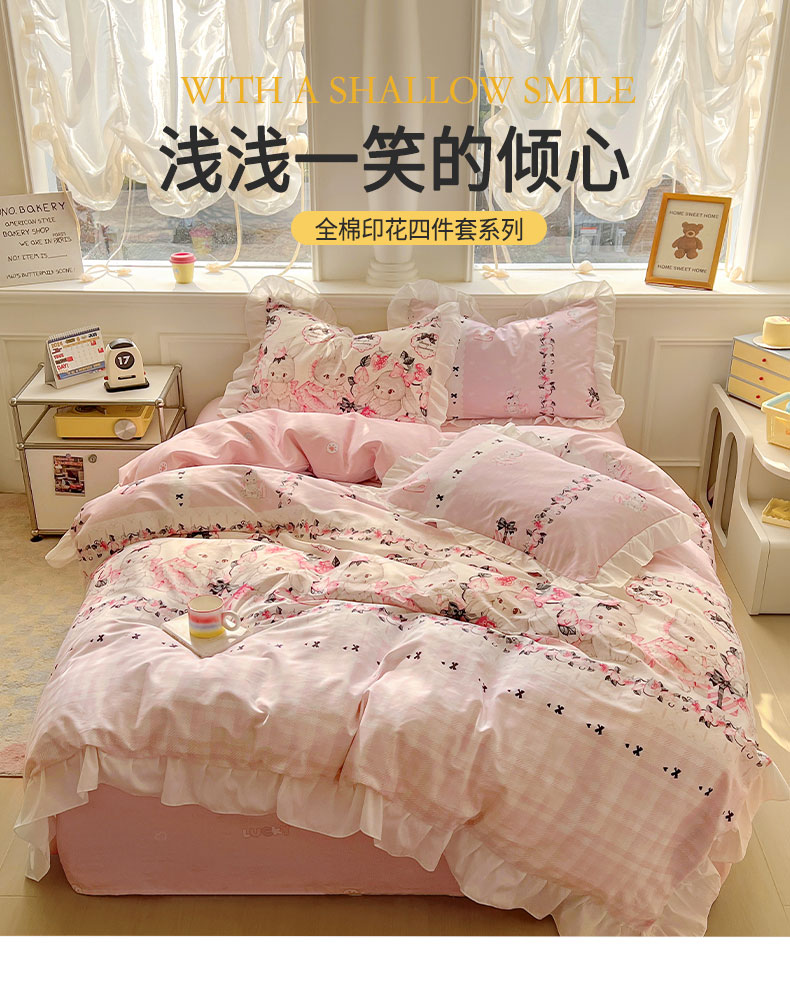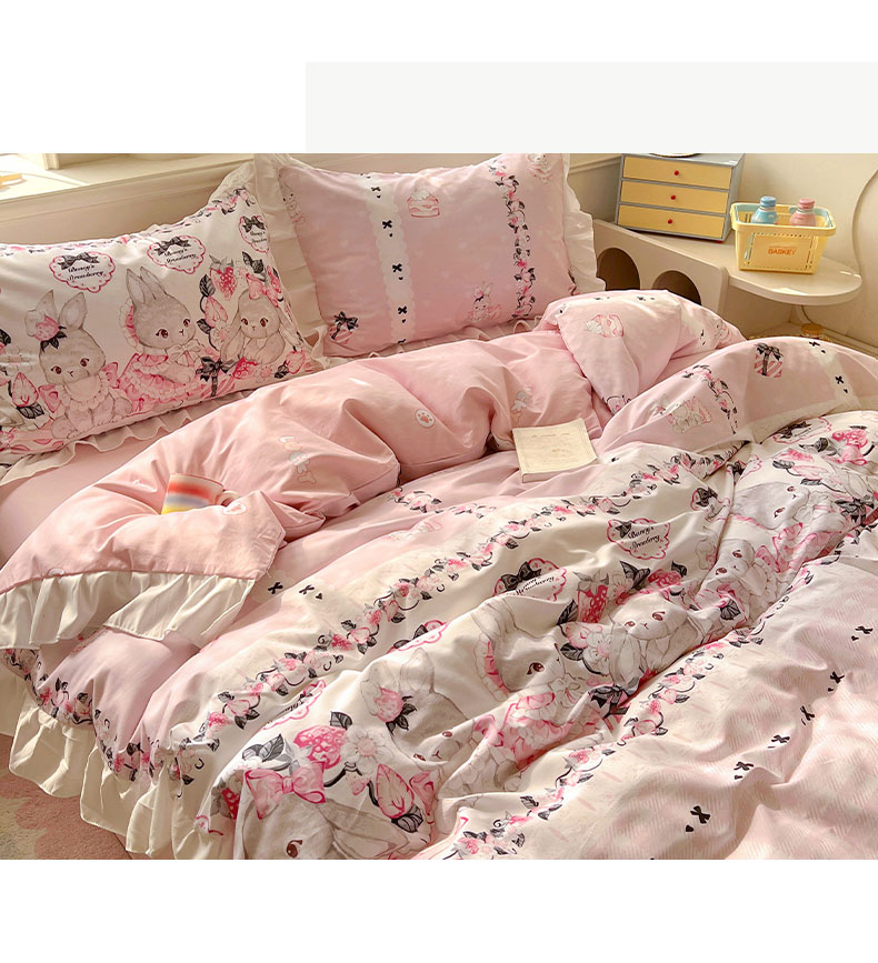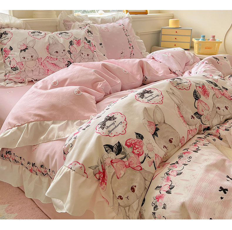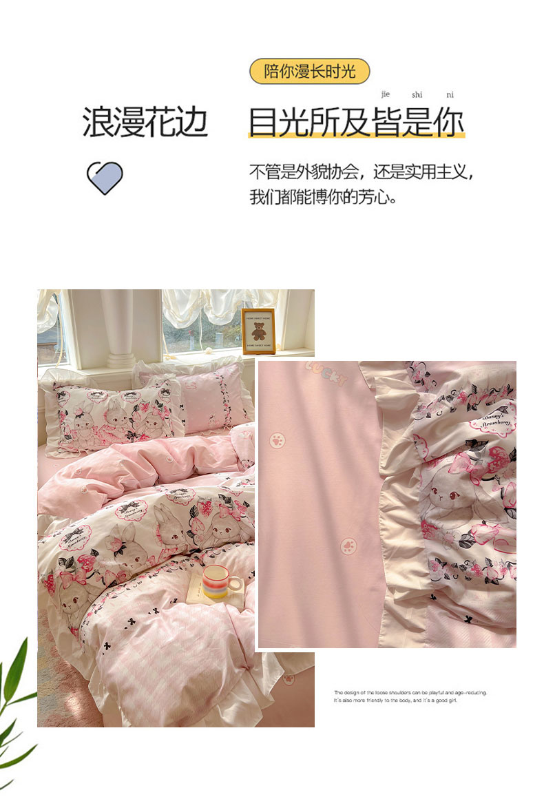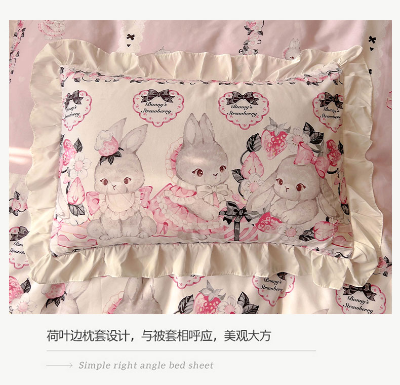 当前位置: 91家纺网 > 商品网购 > 床品套件 > 四件套 > 全棉普通四件套 > 浩诚 2025新款洛丽塔纯棉花边款四件套 粉红草莓兔