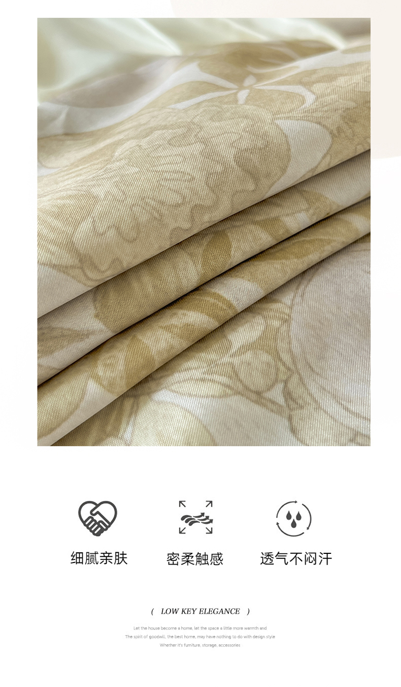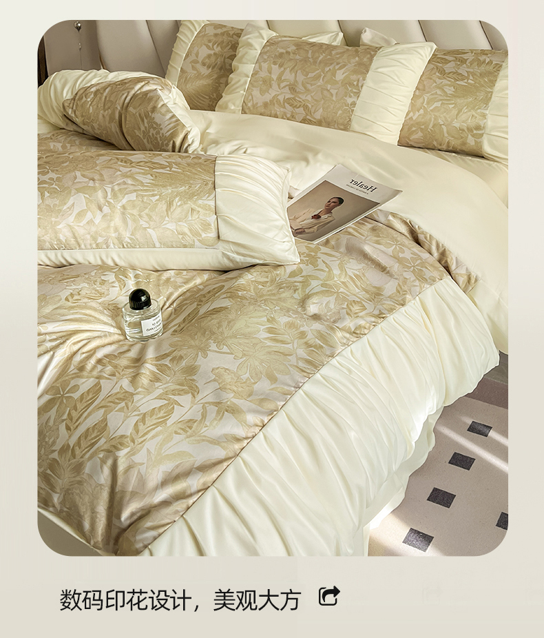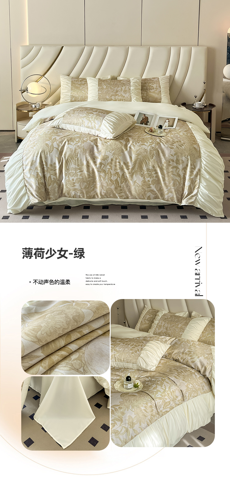 商品名称:千希家纺 2025新款120克斜纹水洗棉数码印花拼接荷叶边工艺款四件套 薄荷少女-绿