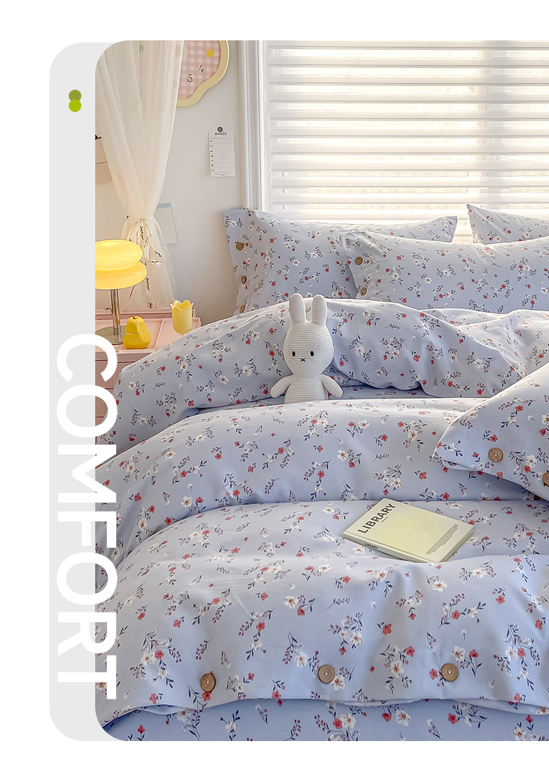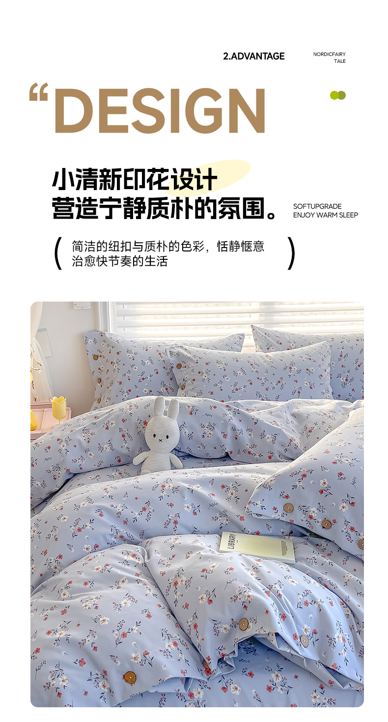 星窝家纺 2025新款纽扣款水洗棉印花四件套 花上枝蓝