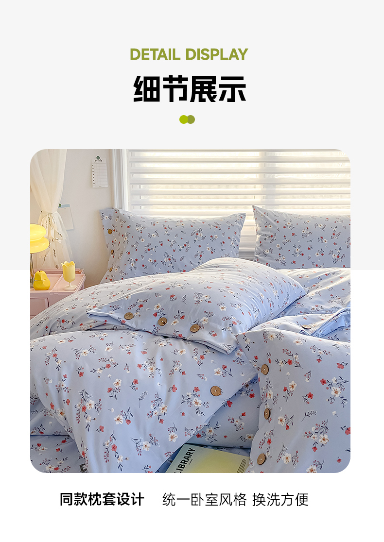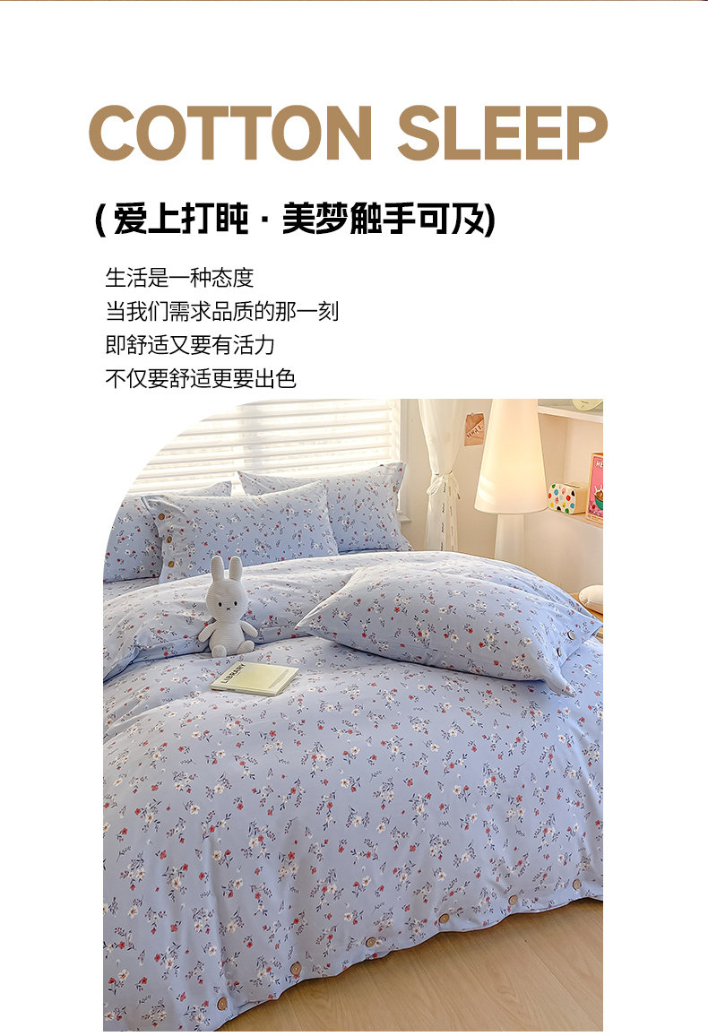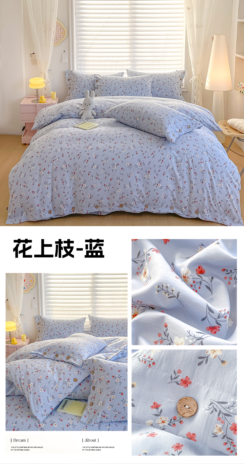 商品名称:星窝家纺 2025新款纽扣款水洗棉印花四件套 花上枝蓝