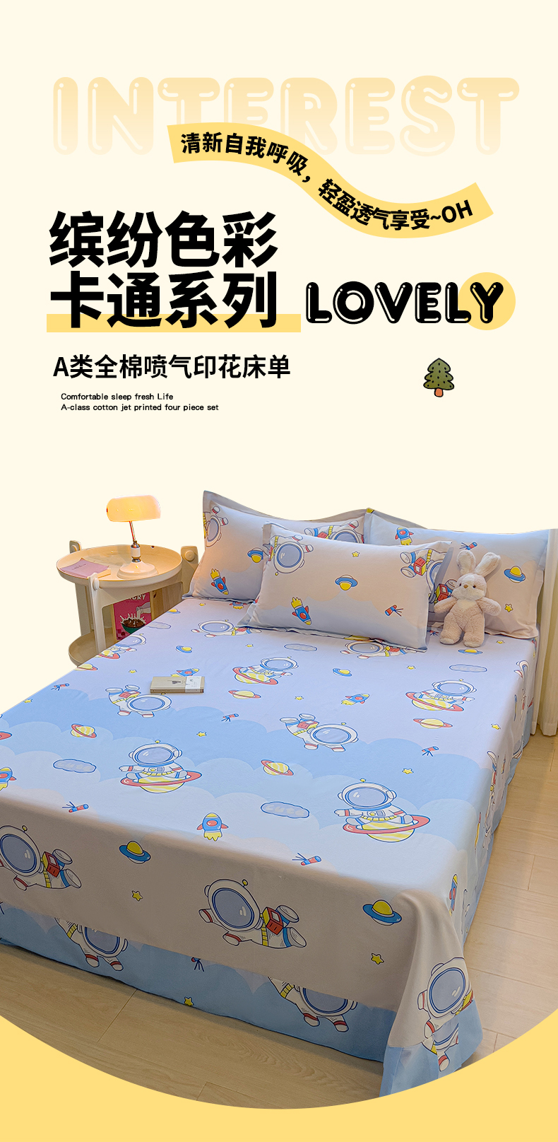 (总)拾物记 2026新款第一批12868A类全棉单品床单系列,森林伙伴,爱心喵,彩虹兔,草莓小狗,乘风宇宙,刺绣潮声,点点森林熊,粉粉猫咪酱,滚滚绣球团,花漫歌,简笔小汪,镜子海洋粉,开心派对,快乐宇航员,蓝星动物园,美梦花园,咪咕日常,太空卫士,太空熊,糖果幼儿园,糖纸童年,甜蜜纪念日,挽星河,星际仔仔,星星柯基,星星童话园,元气小布,云间甜梦,组合图
