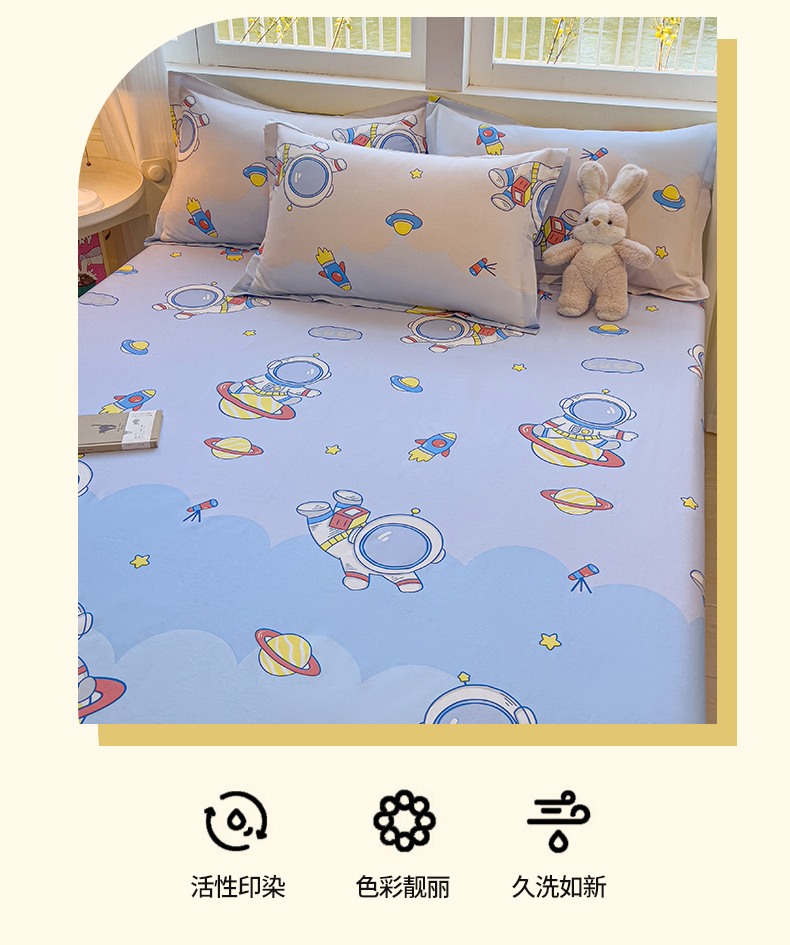 • 91家纺网 家纺一手货源 找家纺 (总)拾物记 2026新款第一批12868A类全棉单品床笠系列(床笠宽度预留10厘米缩水尺寸, 90x200床笠高度15厘米,适合4-15厘米学生床垫使用,其他尺寸床笠高28cm 适合4-28厘米,森林伙伴,挽星河,爱心喵,彩虹兔,草莓小狗,乘风宇宙,刺绣潮声,点点森林熊,粉粉猫咪酱,滚滚绣球团,花漫歌,简笔小汪,镜子海洋粉,开心派对,快乐宇航员,蓝星动物园,美梦花园,咪咕日常,太空卫士,太空熊,糖果幼儿园,糖纸童年,甜蜜纪念日,星际仔仔,星星柯基,星星童话园,元气小布,云间甜梦