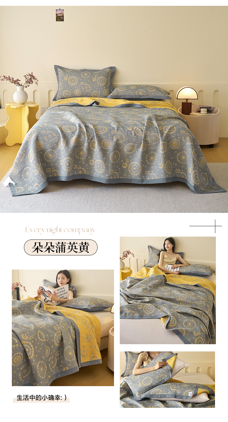 • 91家纺网 家纺一手货源 找家纺 棠薇家纺2025新款简约风多功能纱布盖毯纱布毯子毛巾被床盖沙发巾单毯枕巾枕套三件套 朵朵蒲英黄
