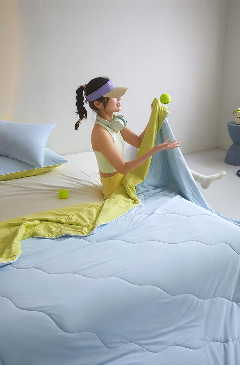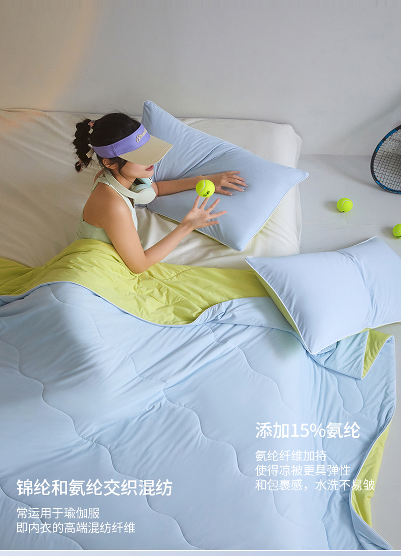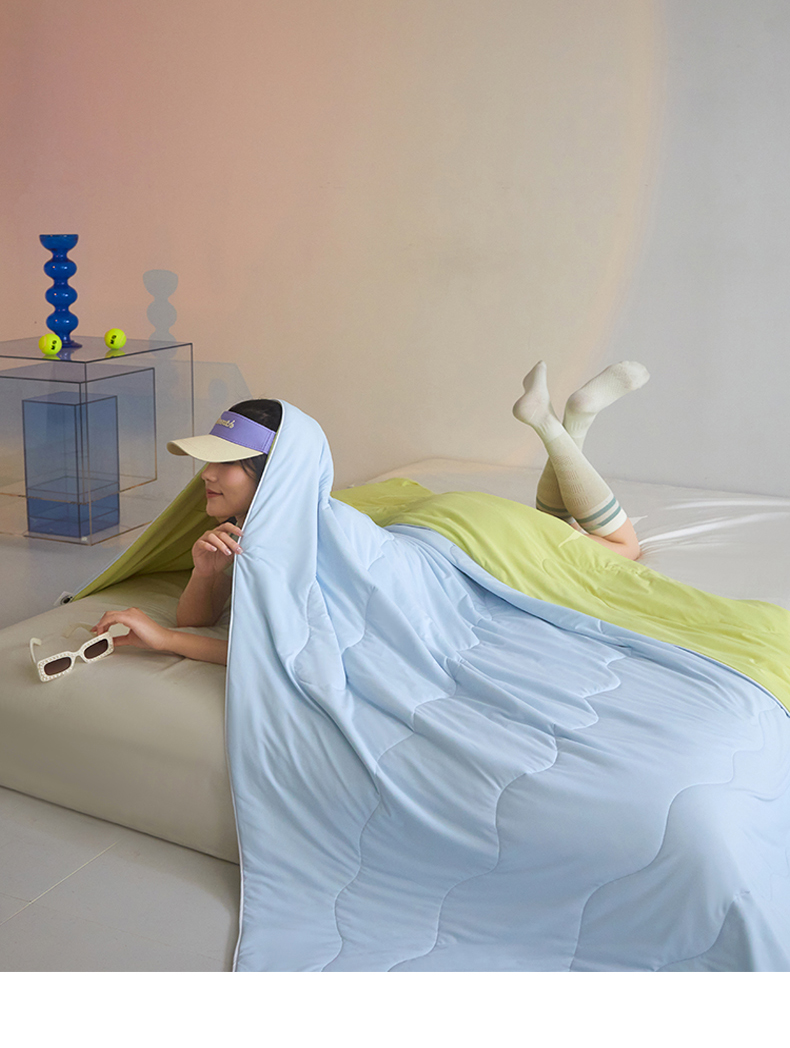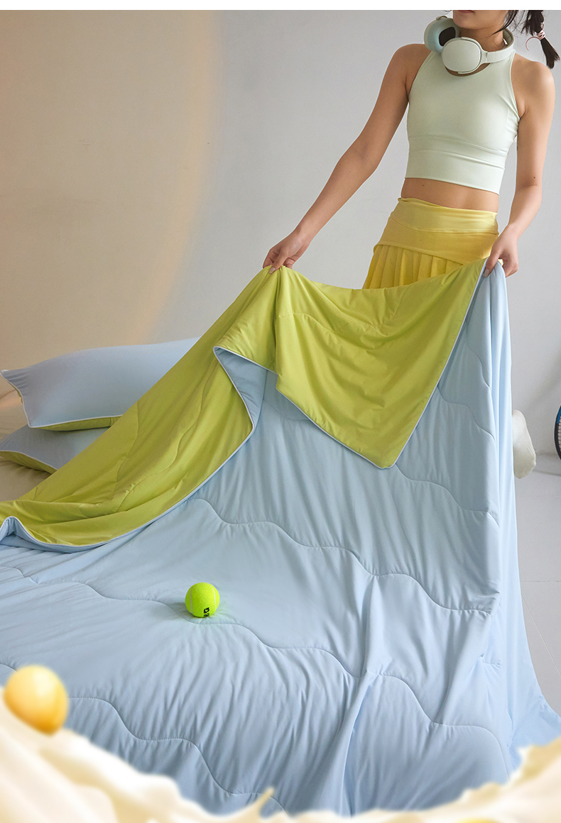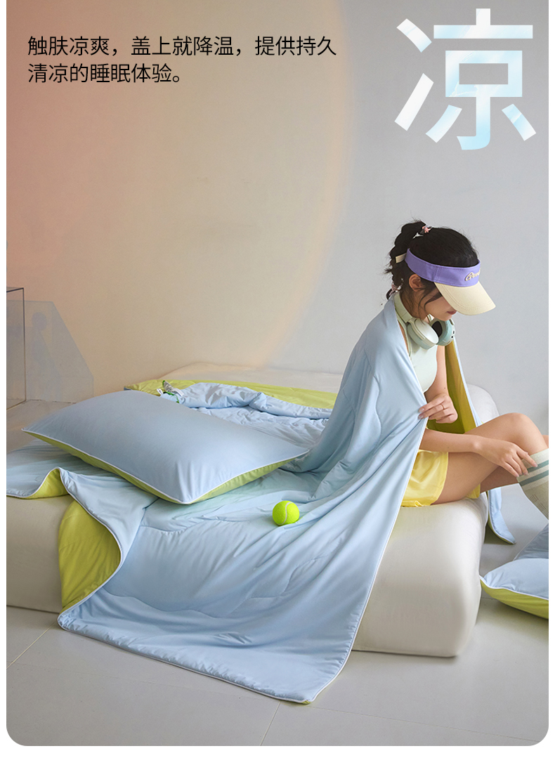 被子 > 夏被 > 头等舱 2025新款4.0版凉感A类锦氨(165克)55大豆抗菌夏凉被夏被配礼盒模特图 典雅兰拼黄绿