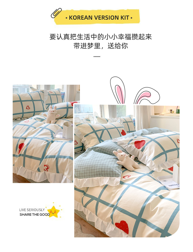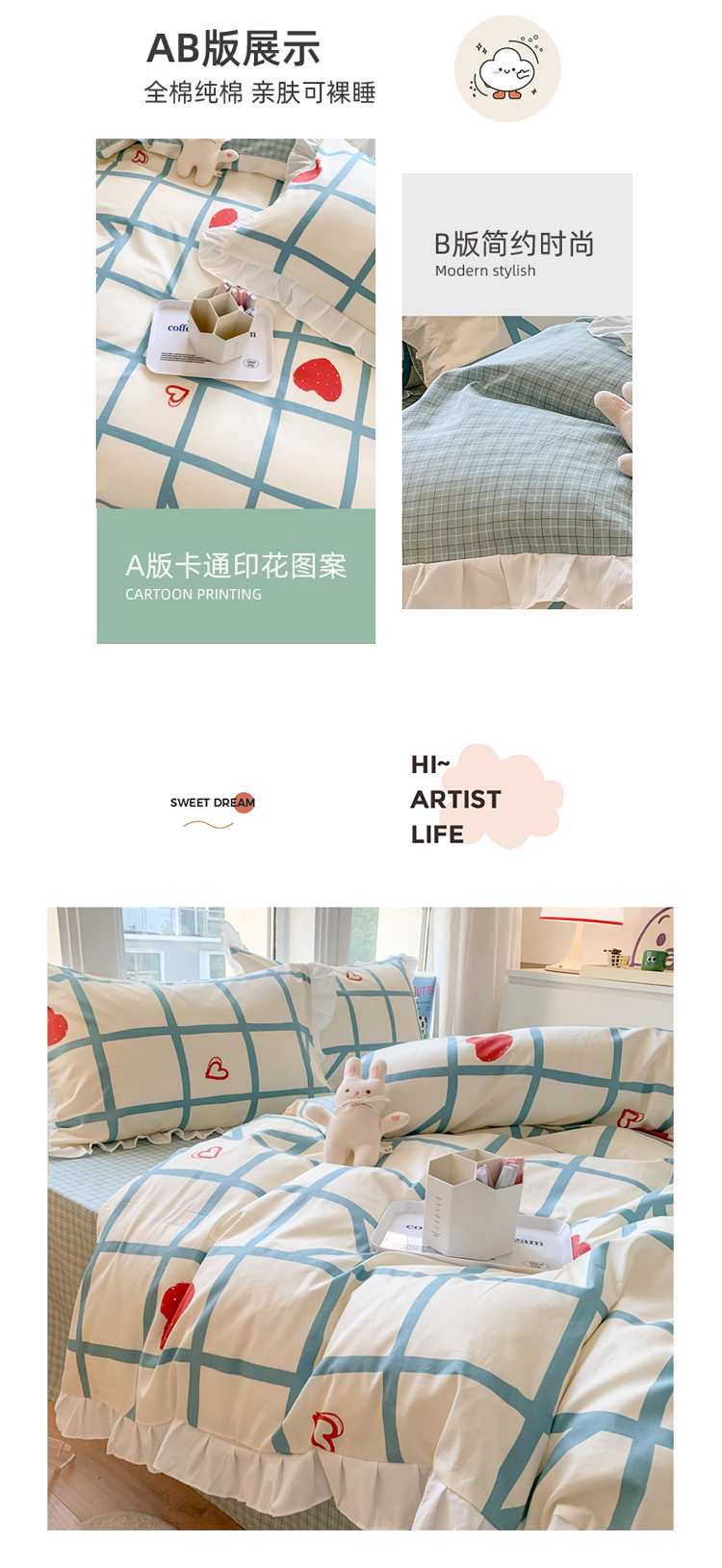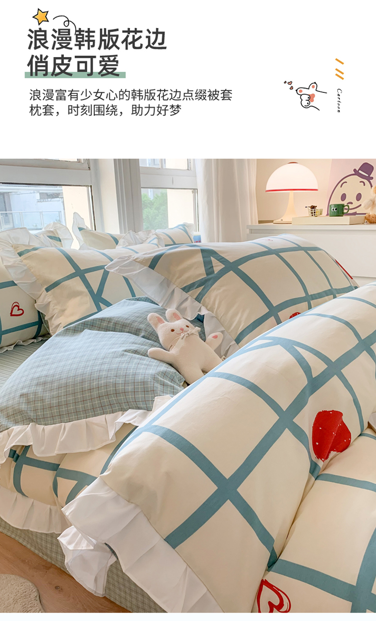 当前位置: 91家纺网 > 商品网购 > 床品套件 > 四件套 > 全棉普通四件套 > 2025新款公主风四件套全棉纯棉白花边被套床单款式三件套 心心格