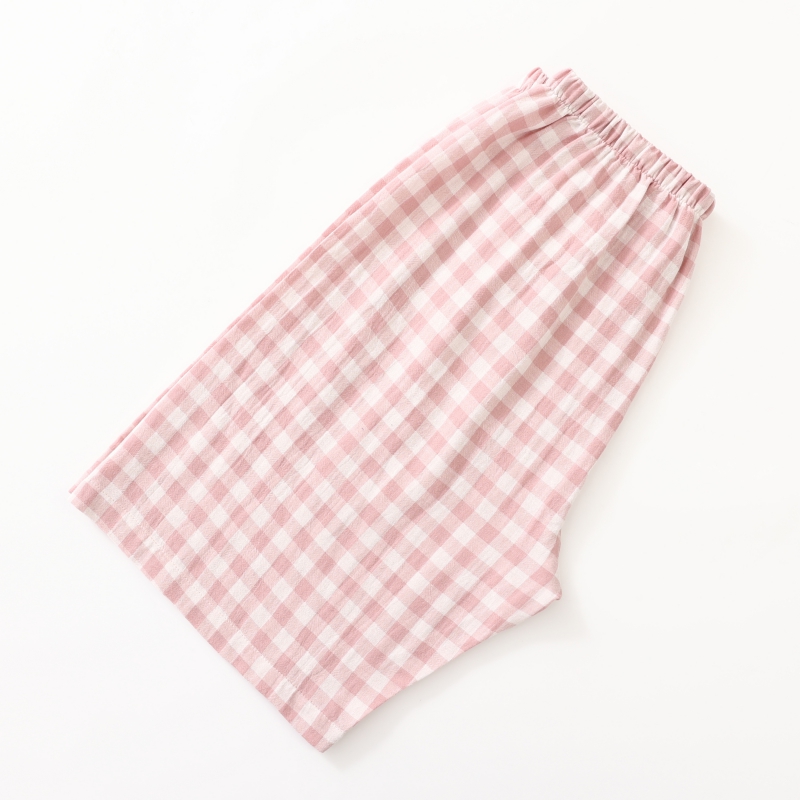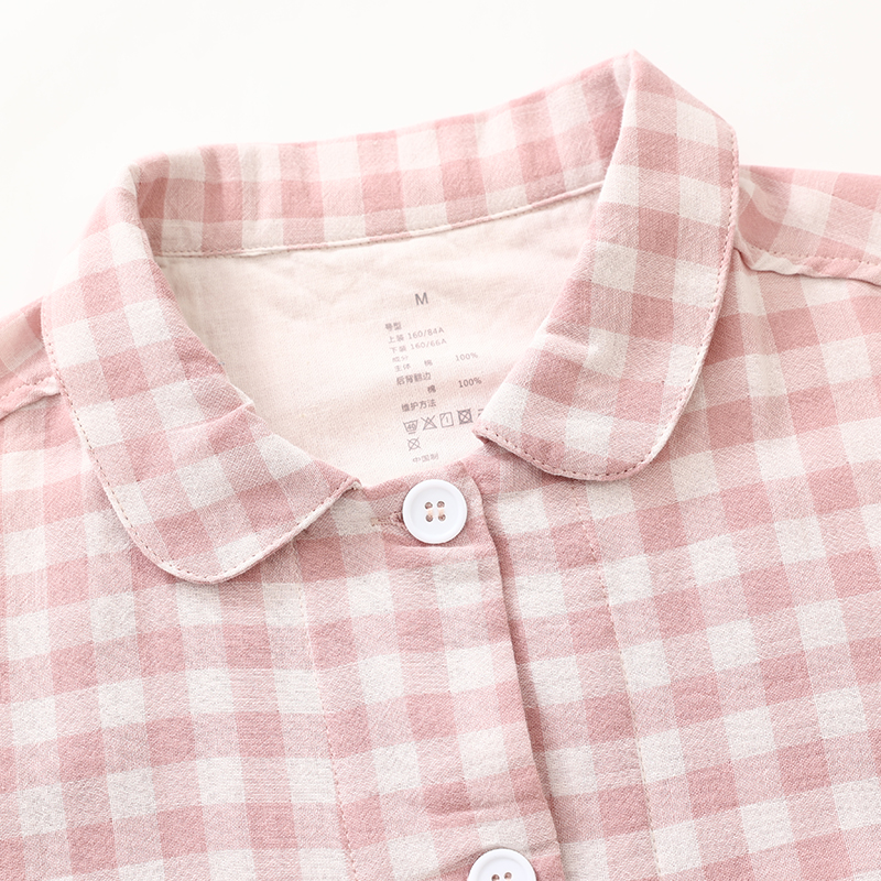 商品名称:伊嫚家居 2025新款日式无印风良品全棉双层纱睡衣女纯棉短袖短裤睡衣夏季纯棉短袖家居服 粉小格女