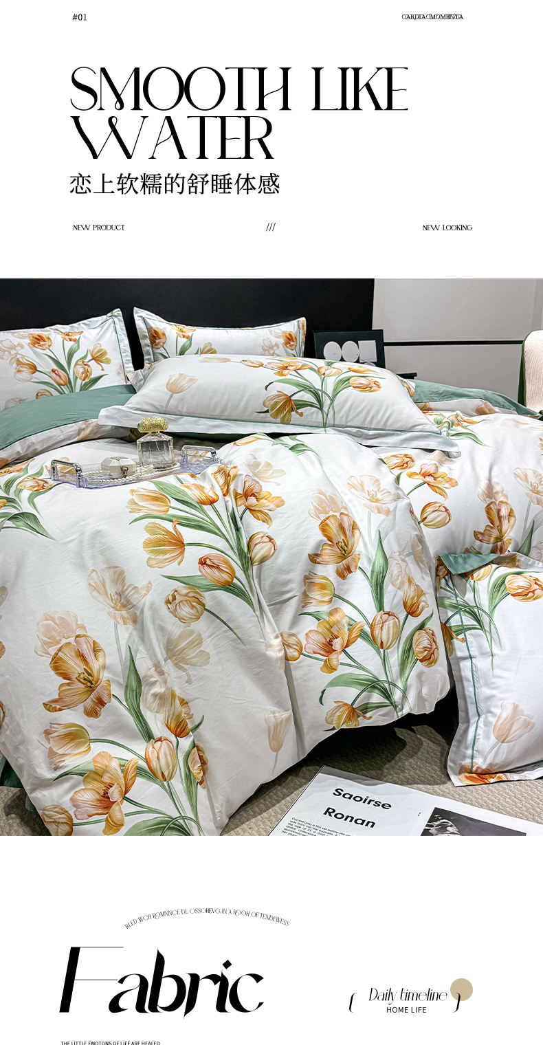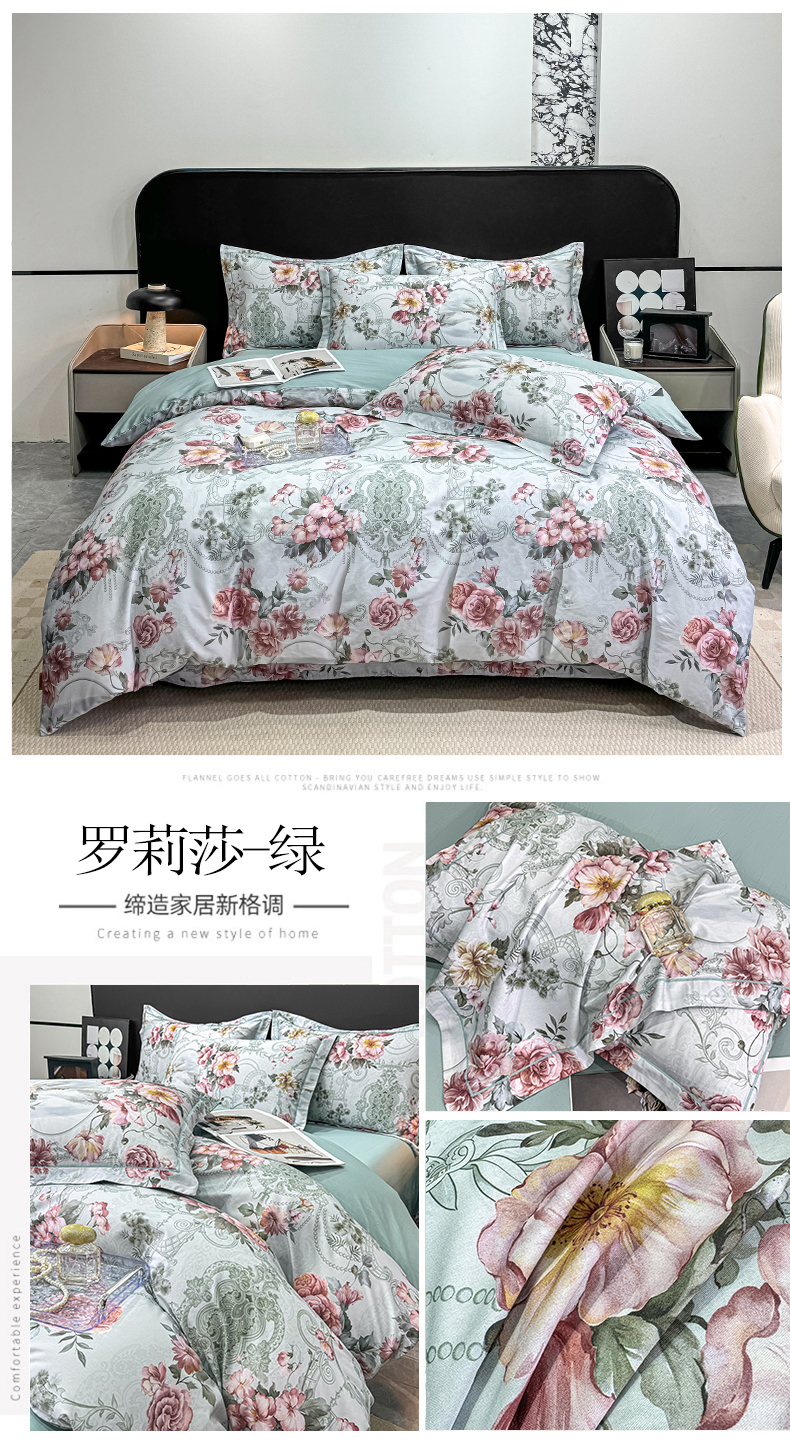(总)红日子纺织品 2025新款全棉纯棉数码印花四件套,花暖容颜-绿,波斯记忆-蓝,茶山露水-桔,淡雅清风-蓝,芳若-绿,花情共舞-米,焕彩玫瑰-黄,美尼尔-粉,莫兰迪-紫,莫妮花园-粉,浓情蜜意-粉,翩翩花语-绿,秋日盛情-黄,日落花雨-灰,如若梦境-绿,诗丹娜-深蓝,邂逅柔情-蓝,秀雅佳人-灰