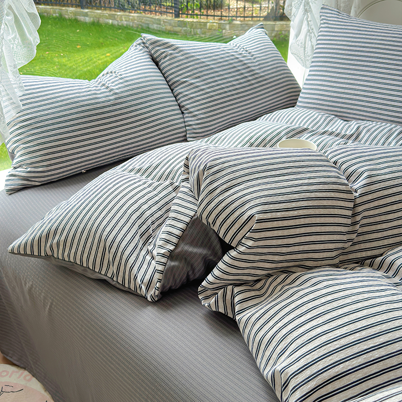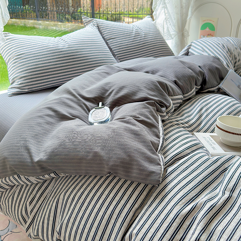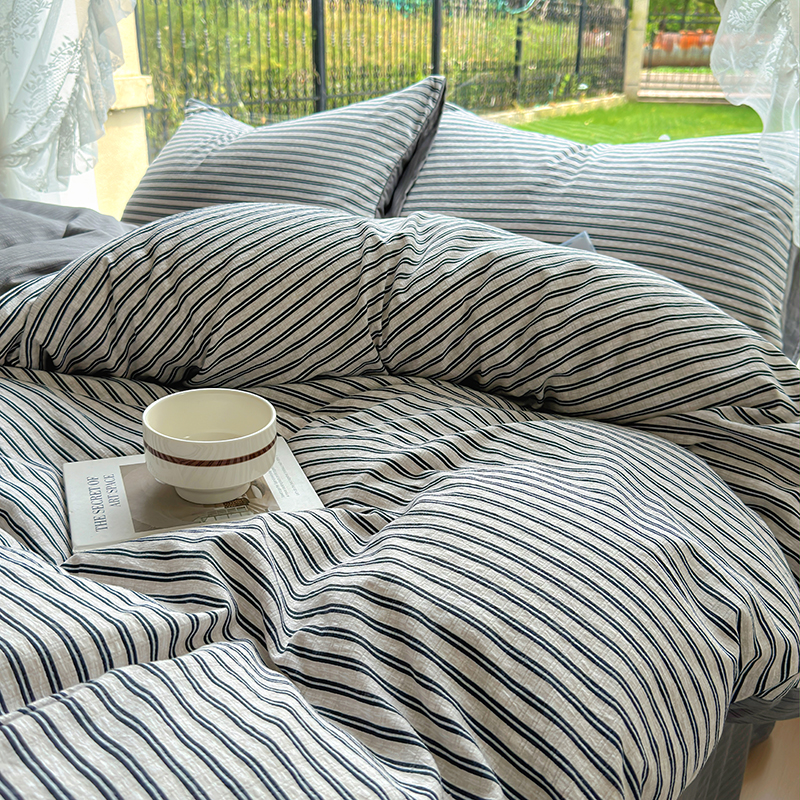 王朝国际 2026爆款皱皱双层纱四件套 棕绿条纹,棕绿条纹
