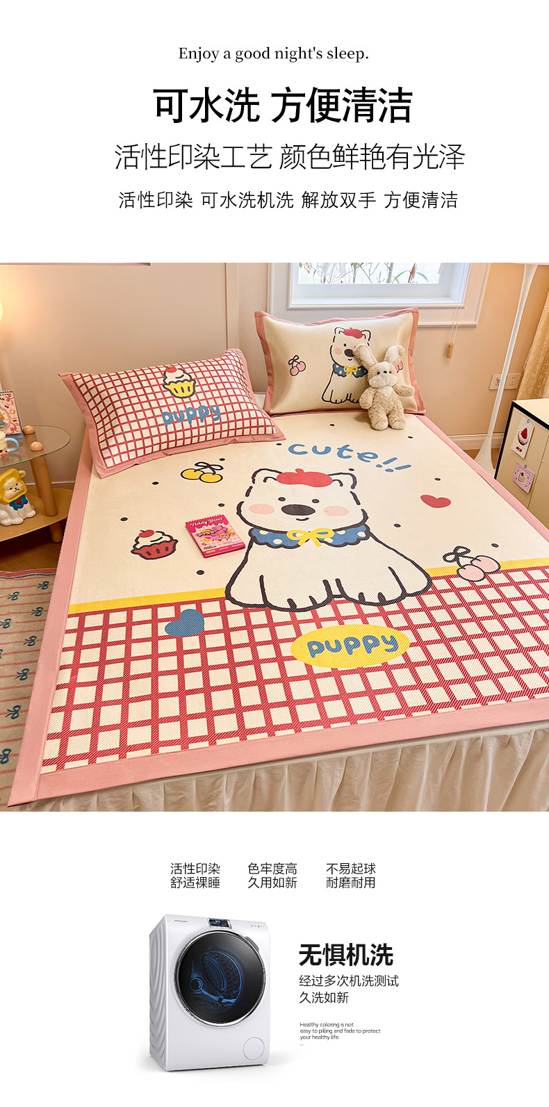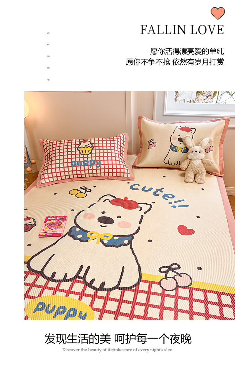 (总)慕尚家纺 2025新款全棉印花学生三件套套件,艾米熊,彩色爱心狗,铃兰花,美食派对,萌宠乐园,书生猫咪,桃心狗,汪可爱,旺旺,樱桃