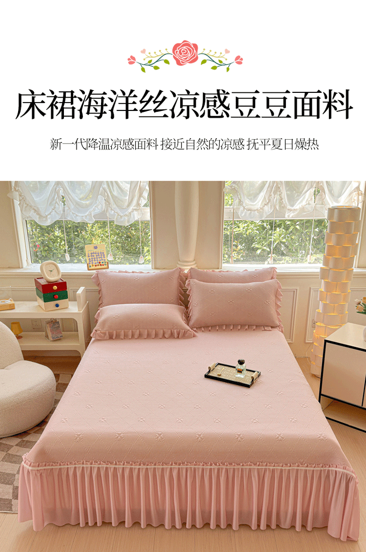 商品名称:漫布云 2025新款凉豆豆PE凉感丝花边床裙款冰豆豆凉席床盖三件套 樱桃-梦幻紫