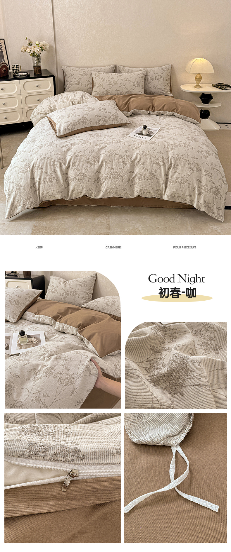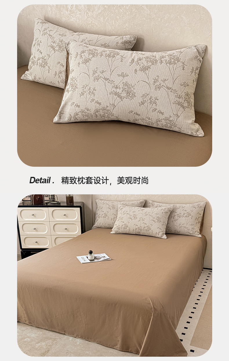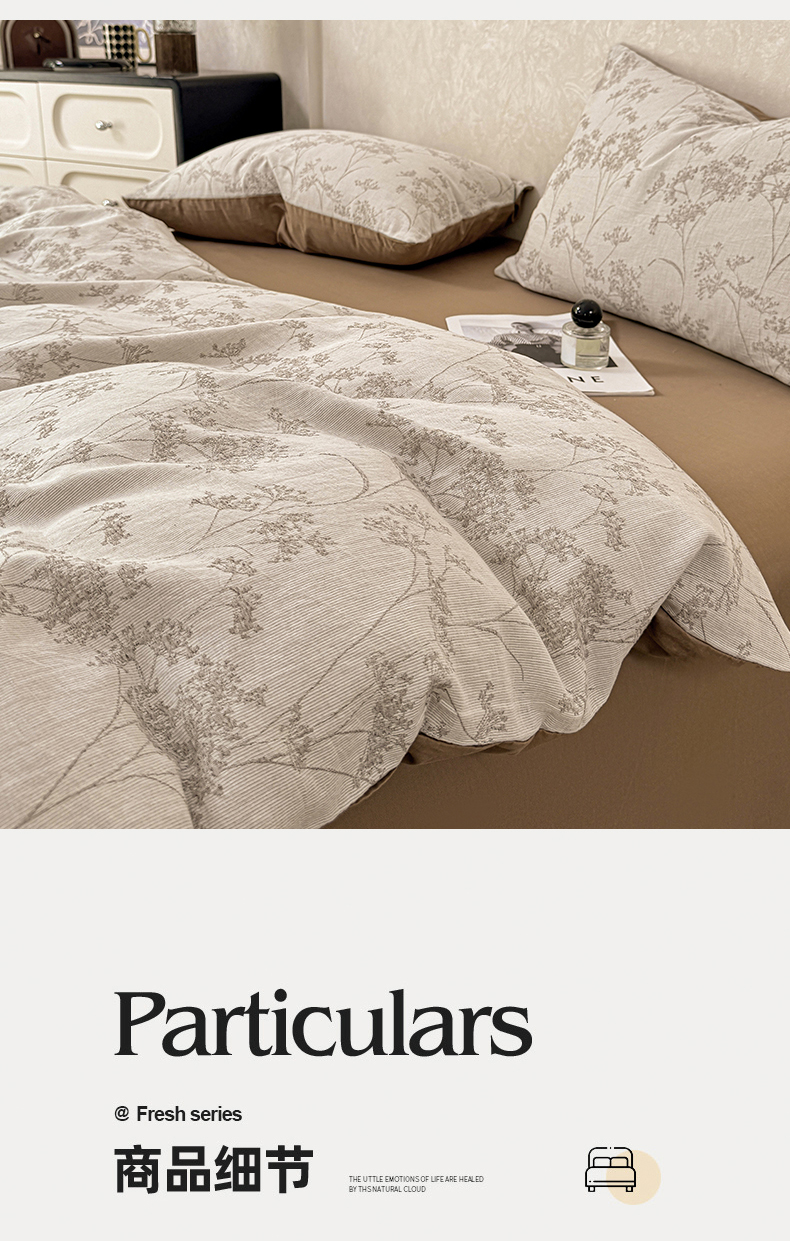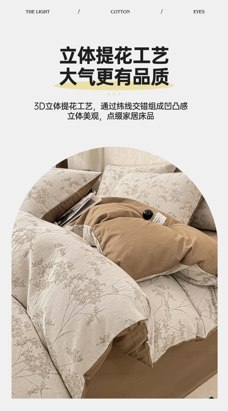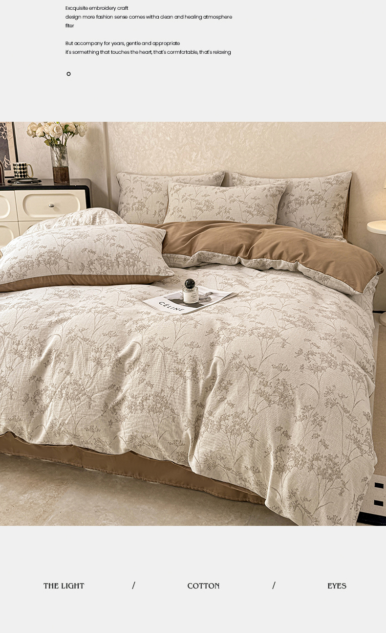 当前位置: 91家纺网 > 商品网购 > 床品套件 > 四件套 > 色织四件套 > 灰鲸2025新款A类全棉三层纱色织提花系列四件套 初春-咖