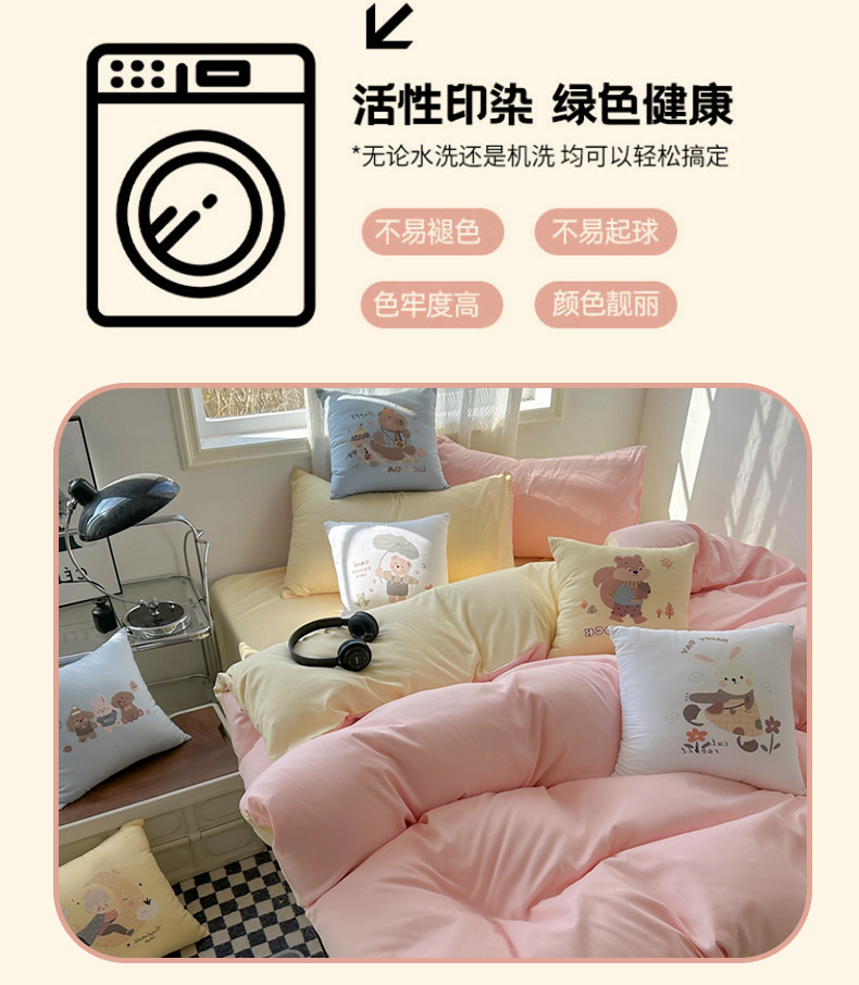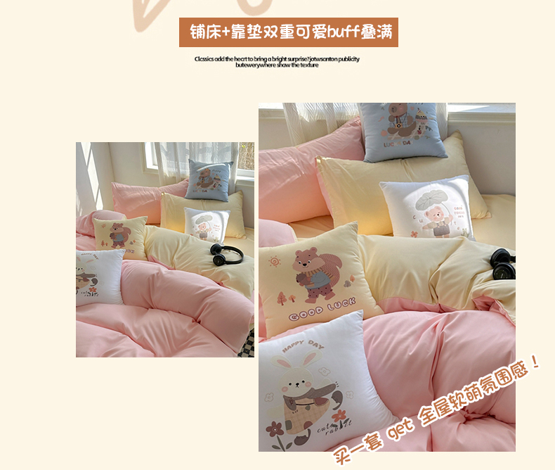 商品名称:(总)2025新款纯色双拼水洗棉四件套搭配抱枕组合多巴胺风软糯裸睡床单被套抱枕床上用品