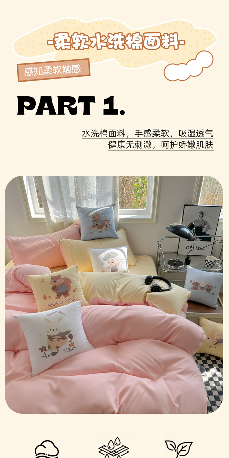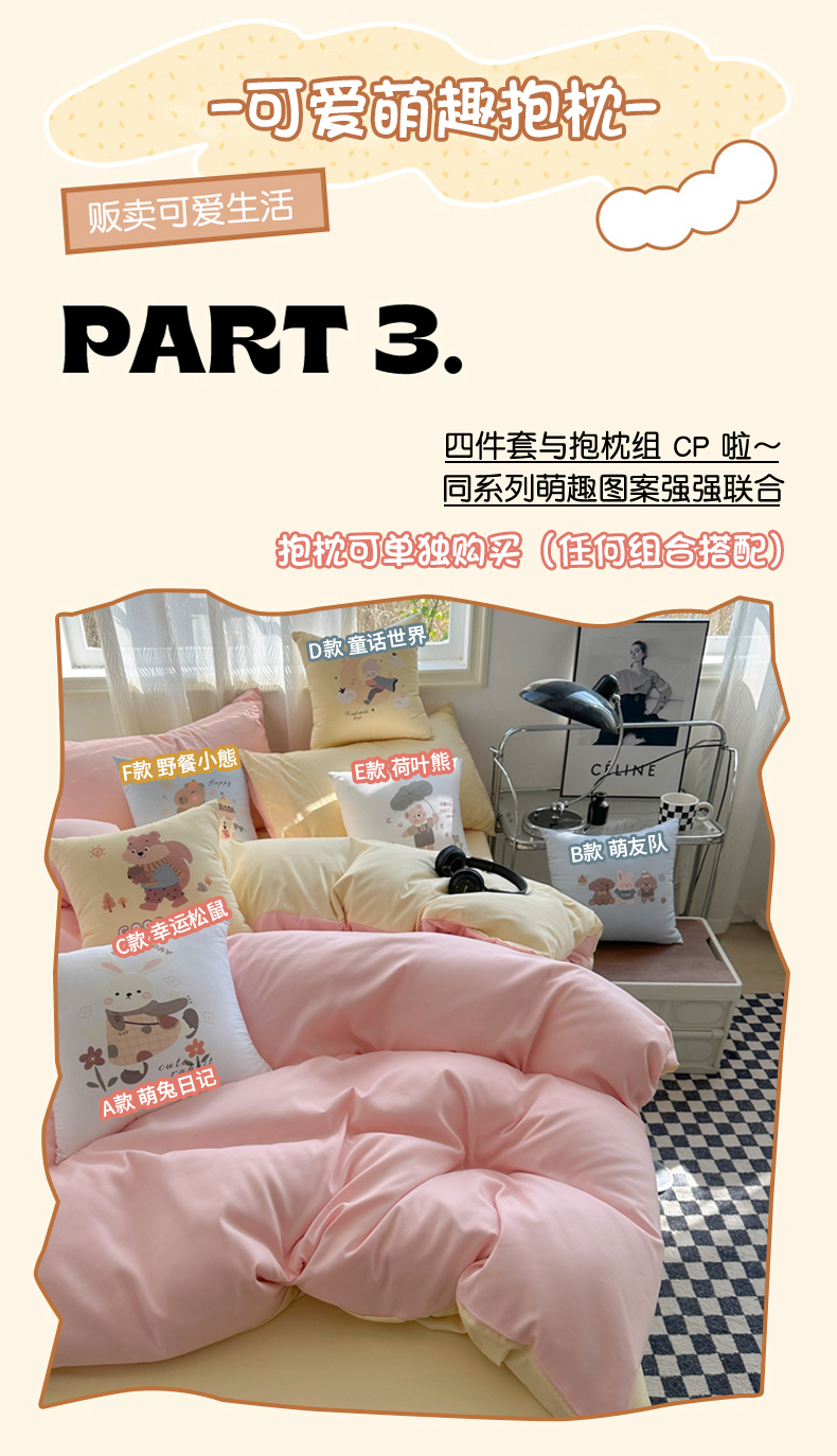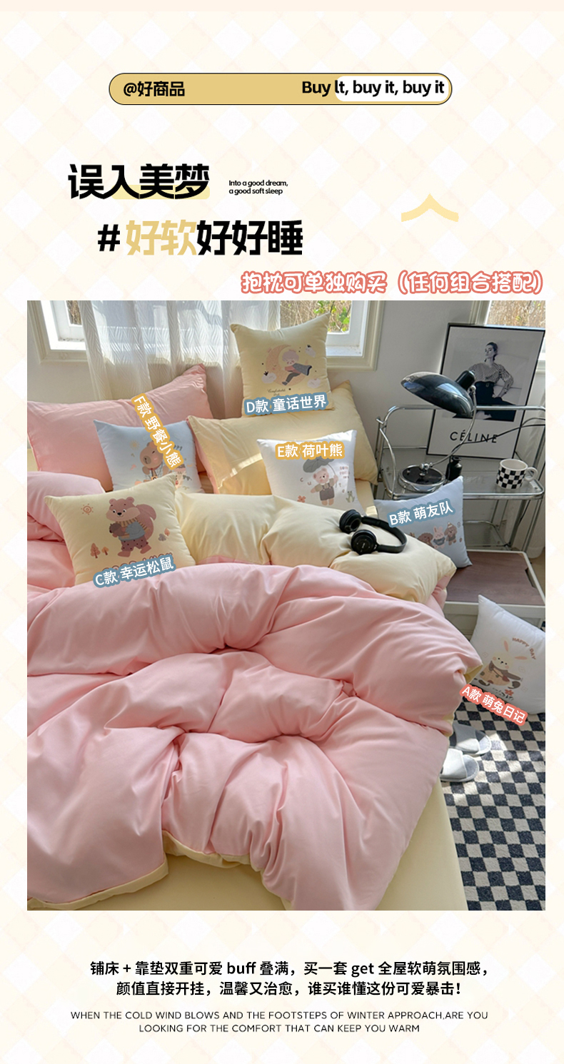 (总)2025新款纯色双拼水洗棉四件套搭配抱枕组合多巴胺风软糯裸睡床单被套抱枕床上用品