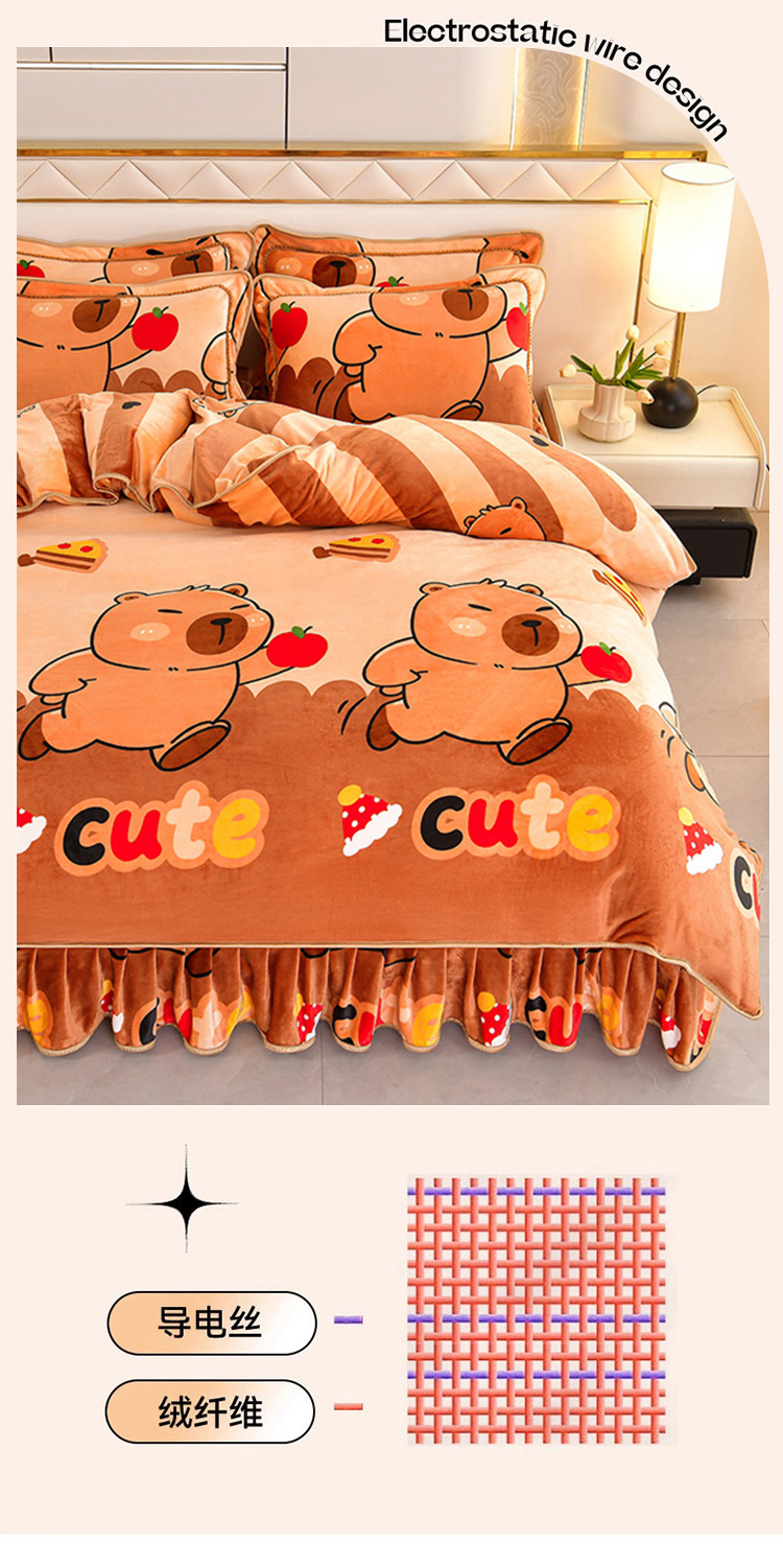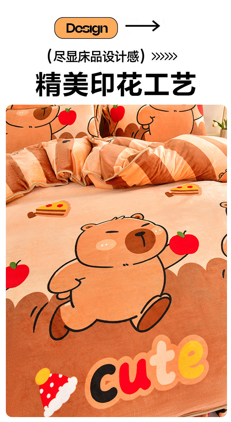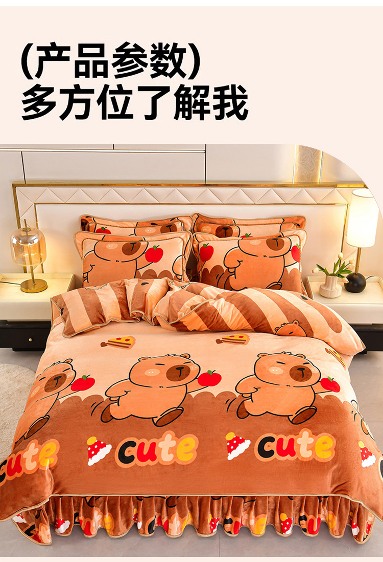 商品名称:硕喜 2025新款新8.5斤法莱绒四件套珊瑚牛奶金貂绒四件套床裙款 卡皮巴拉