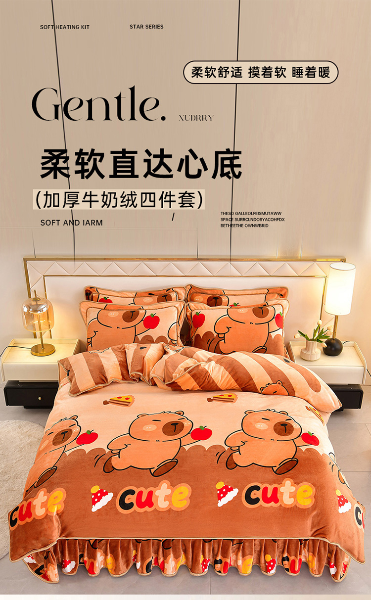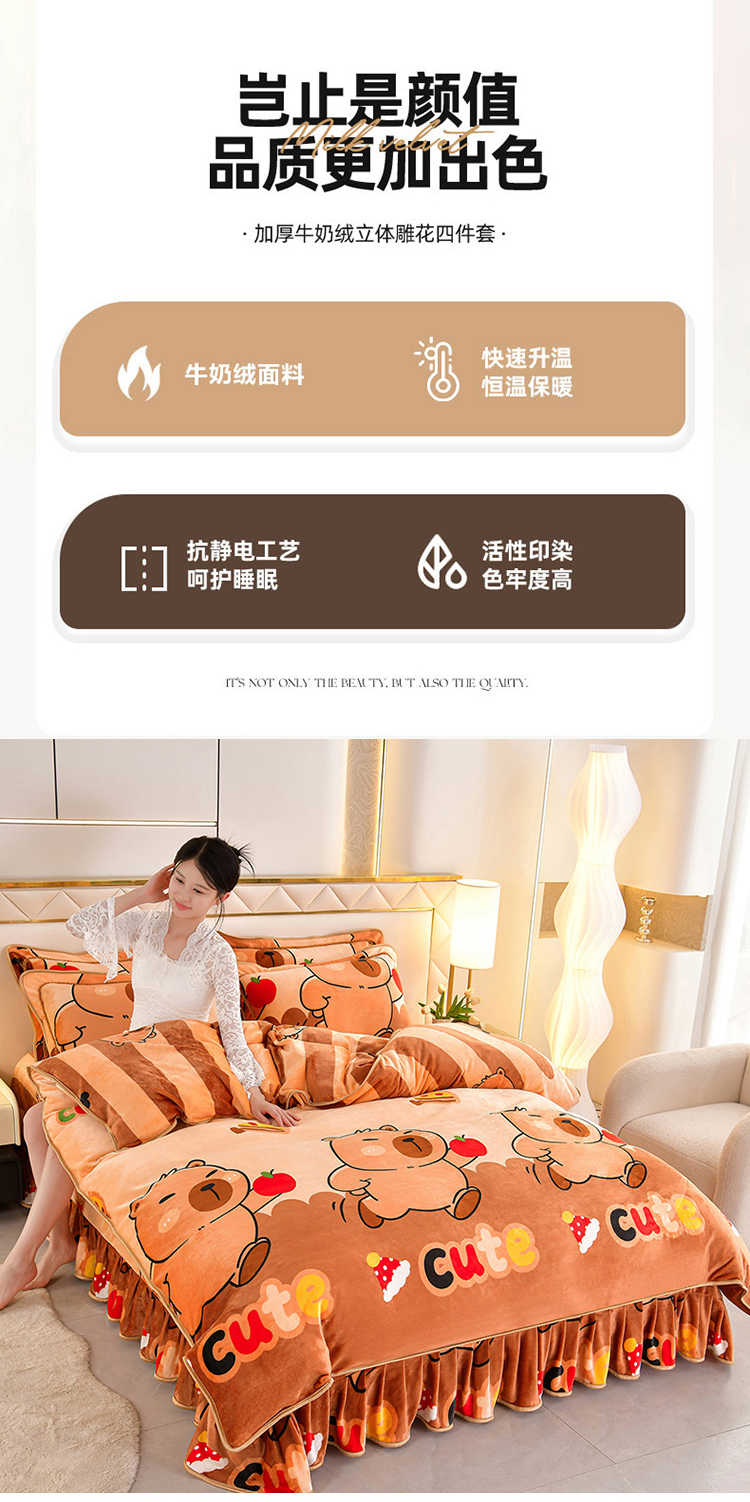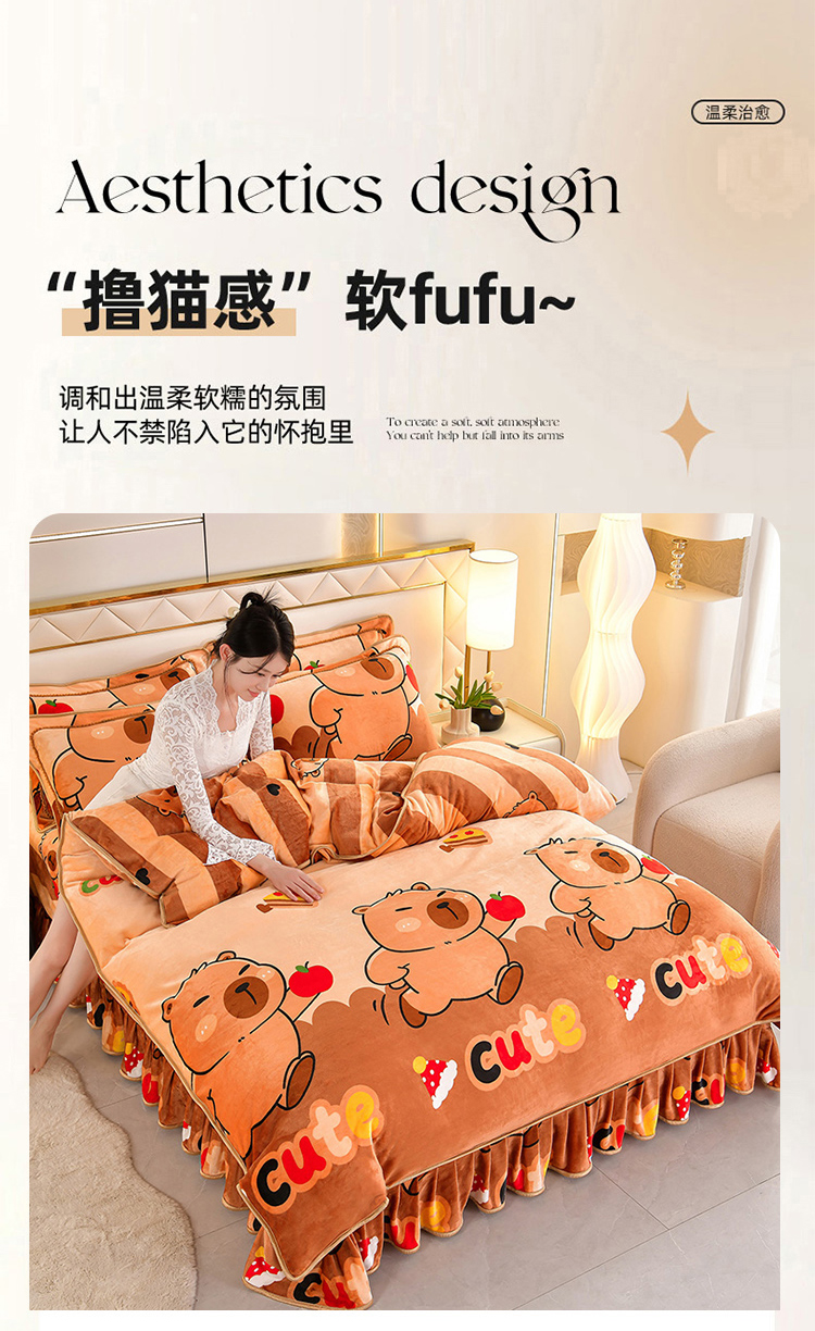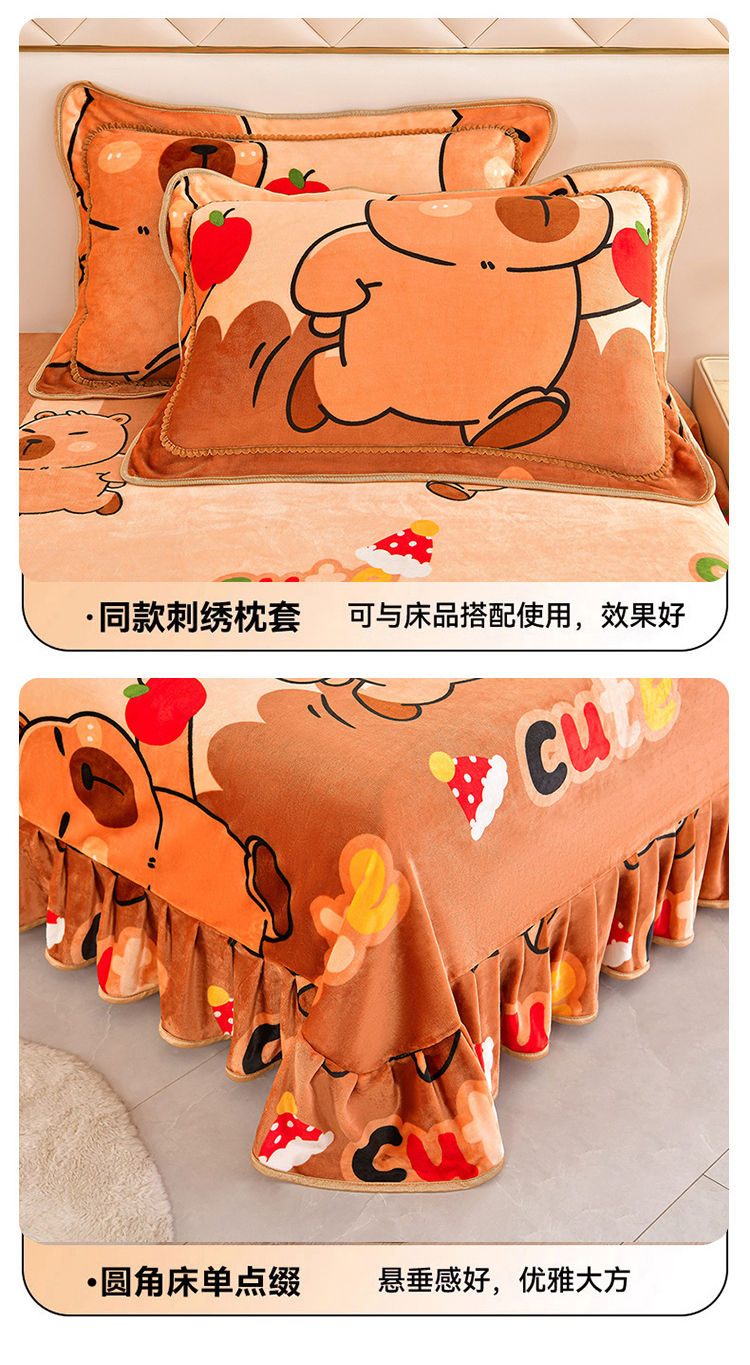 商品名称:硕喜 2025新款新8.5斤法莱绒四件套珊瑚牛奶金貂绒四件套床裙款 卡皮巴拉