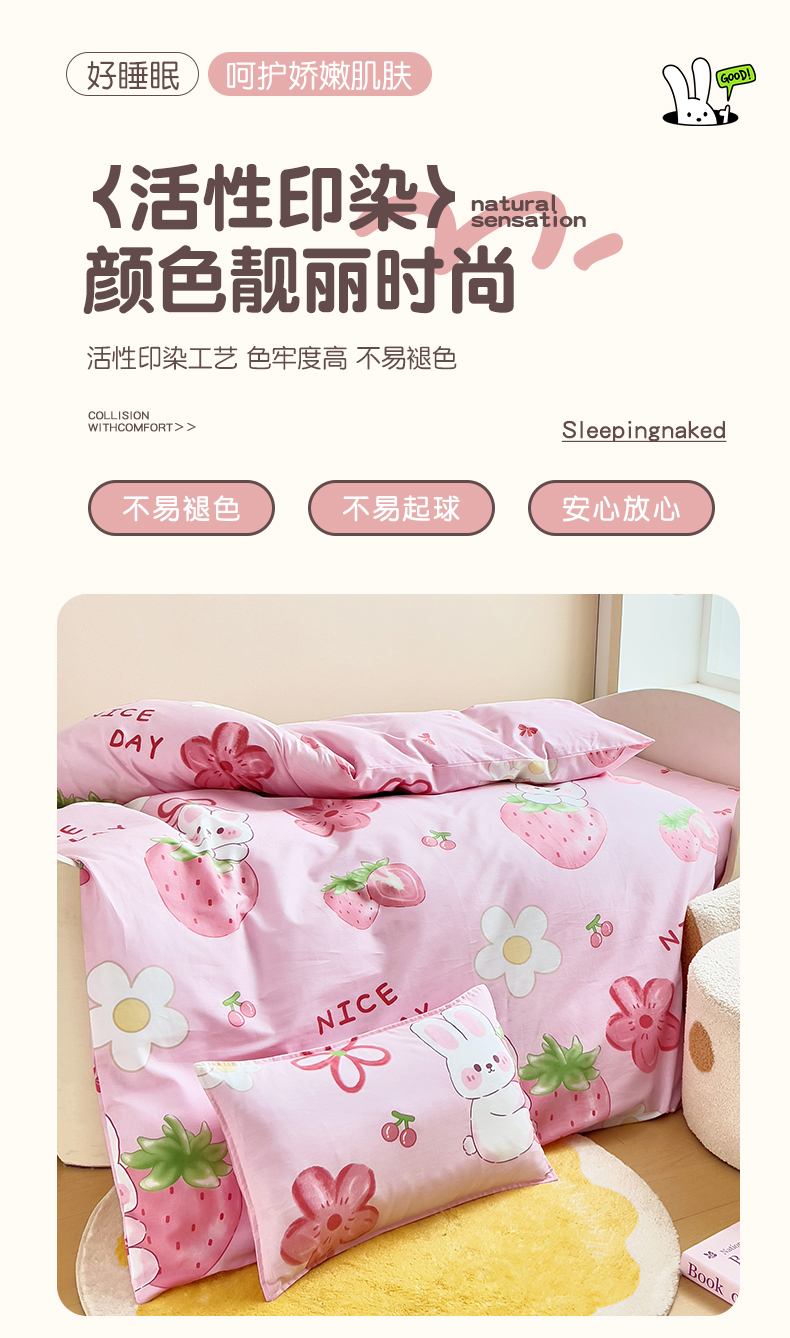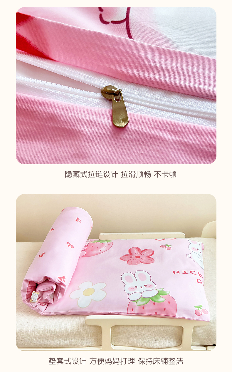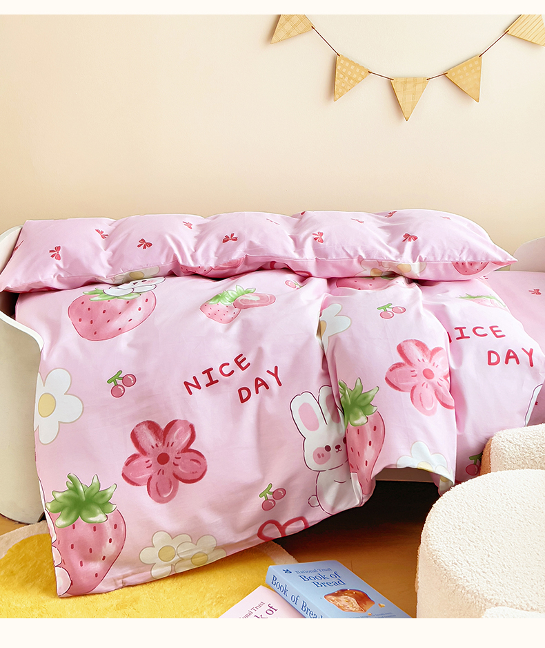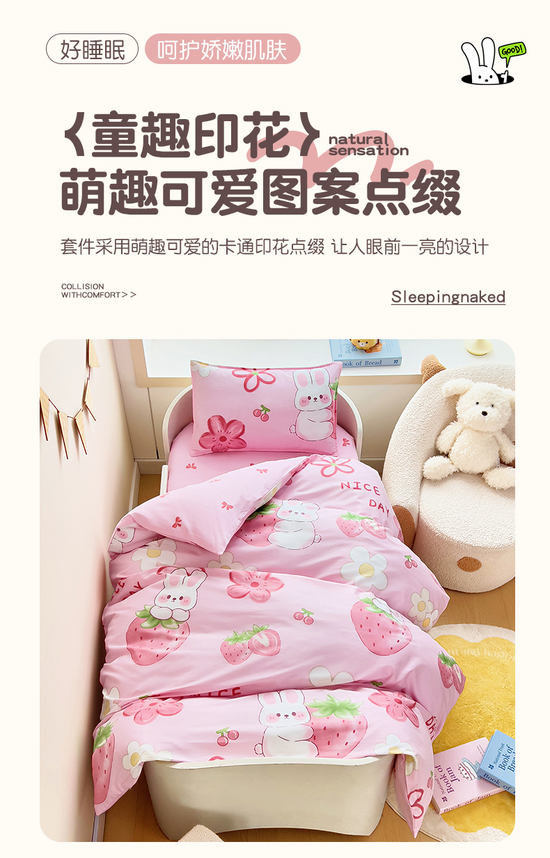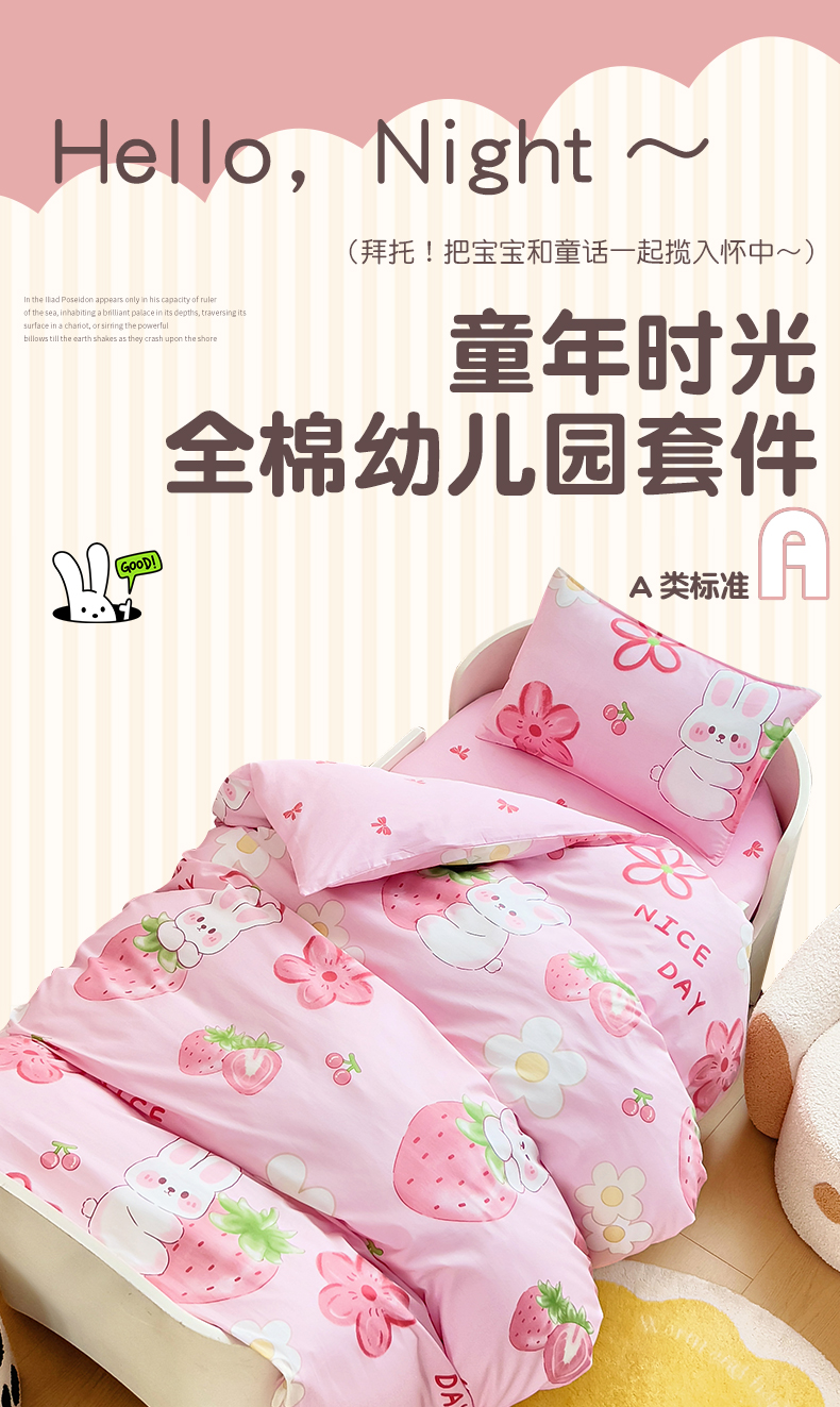 当前位置: 91家纺网 > 商品网购 > 床品套件 > 三件套 > 鱼宝 2025新款全棉幼儿园套件 三件套—童真系列 草莓兔