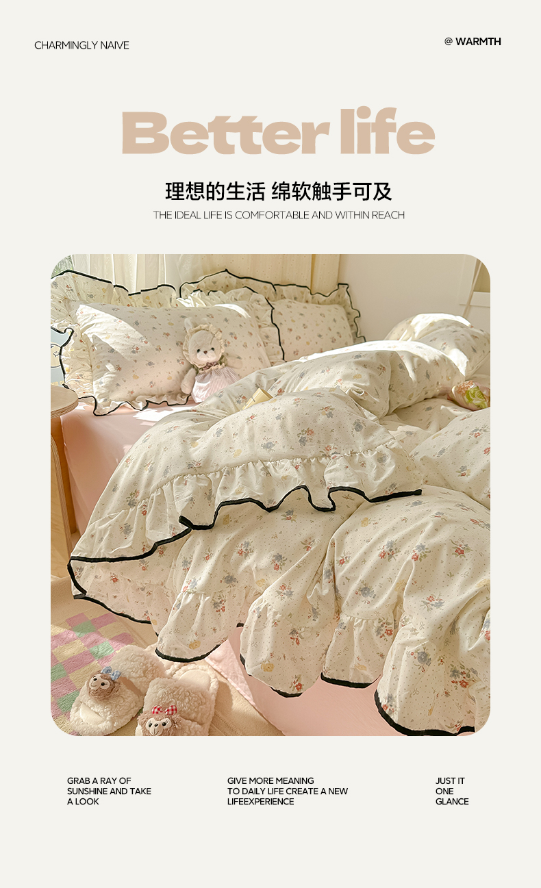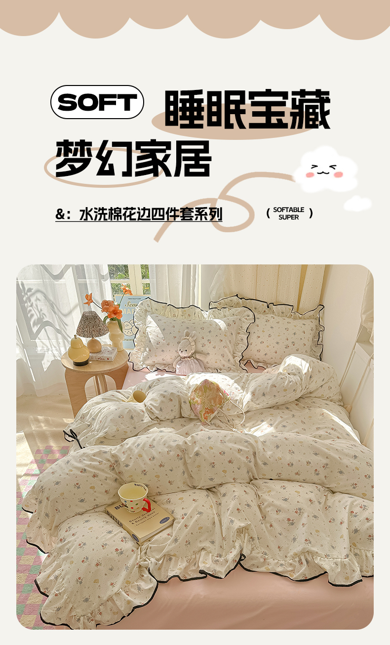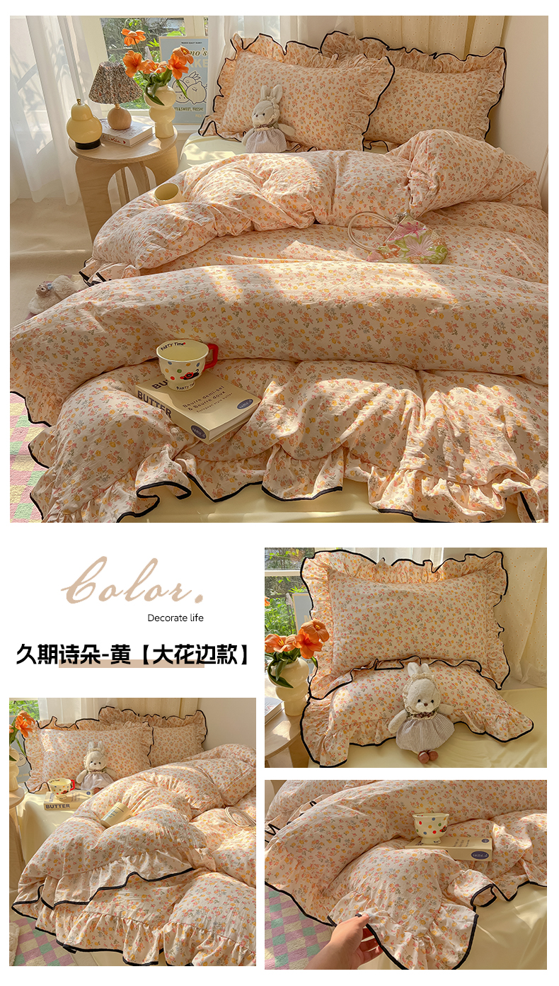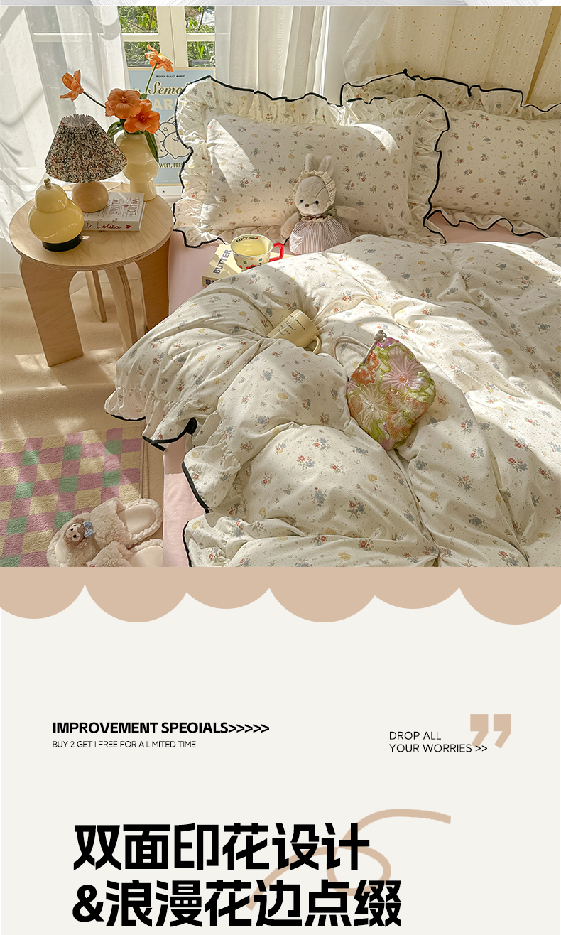 当前位置: 91家纺网 > 商品网购 > 床品套件 > 四件套 > 其它四件套 > 韩巢家纺 2025新款水洗棉大花边被套四件套直播热销款学生宿舍被罩床单三件套(提供卖家秀) 繁花似梦【大花边款】